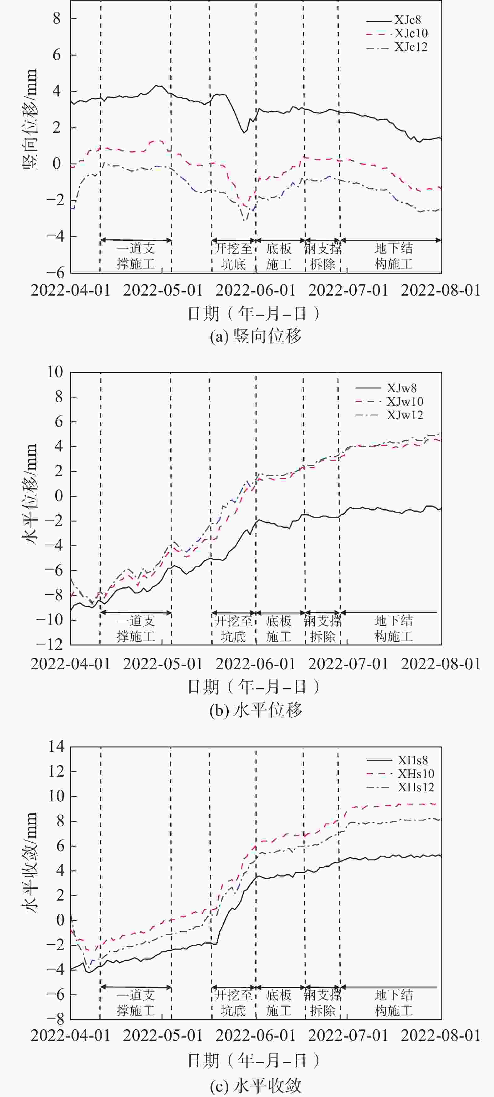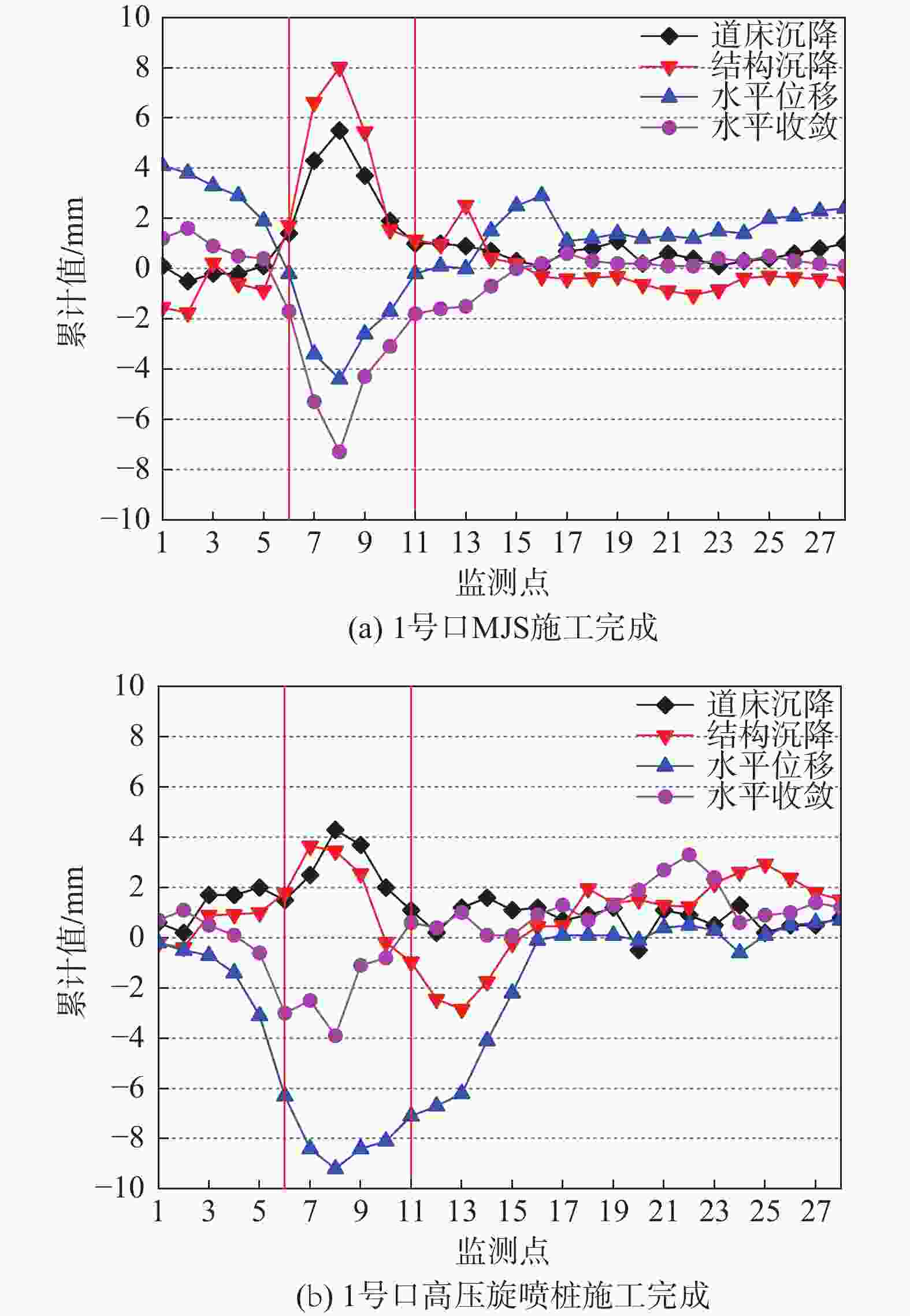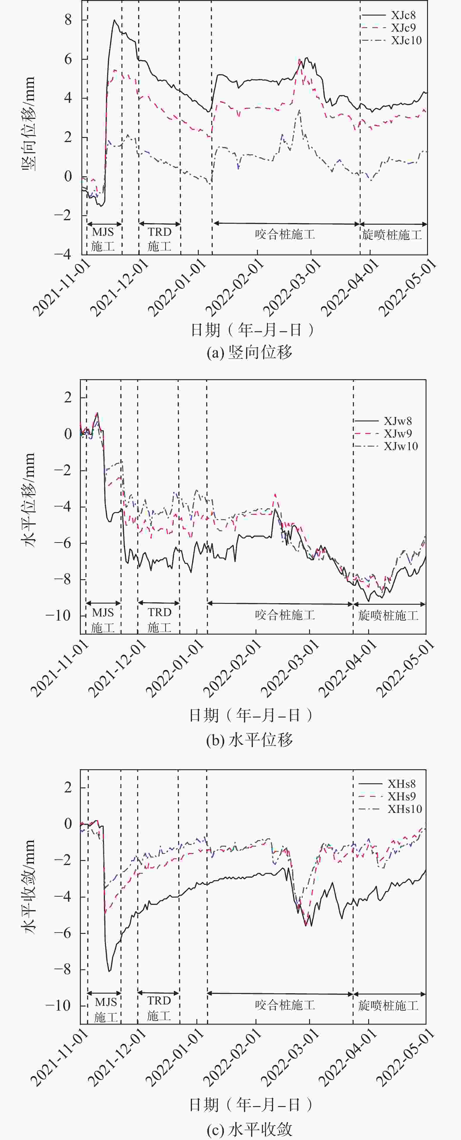 摘要: 基于宁波某紧邻隧道的地下通道基坑及顶管工程,结合监测数据,分析施工全过程对地铁隧道影响。监测数据表明,全圆MJS工法、水泥搅拌桩和高压旋喷桩施工对隧道产生较大影响,引起隧道产生较大隆起、远离施工方向的水平位移和缩径;未限时浇筑底板、两道支撑连续拆除、顶板较长时间未完全封闭,均导致隧道水平位移和收敛较大增长。顶管施工期间,平行隧道和下卧隧道变形包括初始沉降、隆起增加和后期下沉阶段。紧邻地铁的复杂地下工程,需重视全过程变形控制,以实现隧道变形控制目标。Abstract: Based on the foundation pit and pipe jacking project of an underground passage near a tunnel in Ningbo, combined with incorporating monitoring data, an analysis was conducted on the impact of the whole construction process on the adjacent subway tunnel. Monitoring data indicate that full-circle MJS, cement mixing piles, and high-pressure jet grouting piles significantly influenced the tunnel, causing substantial uplift, horizontal displacement away from the construction area, and diameter reduction. Additionally, untimely pouring of the base slab, consecutive removal of two supports, and prolonged incomplete closure of the top slab resulted in significant increases in tunnel horizontal displacement and convergence. During the pipe jacking, deformations in parallel and underpass tunnels included initial settlement, increased uplift, and later subsidence. For complex underground projects near subways, emphasis on comprehensive deformation control is essential to achieve tunnel deformation management.-