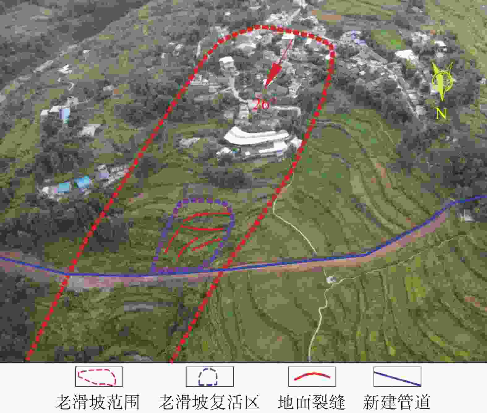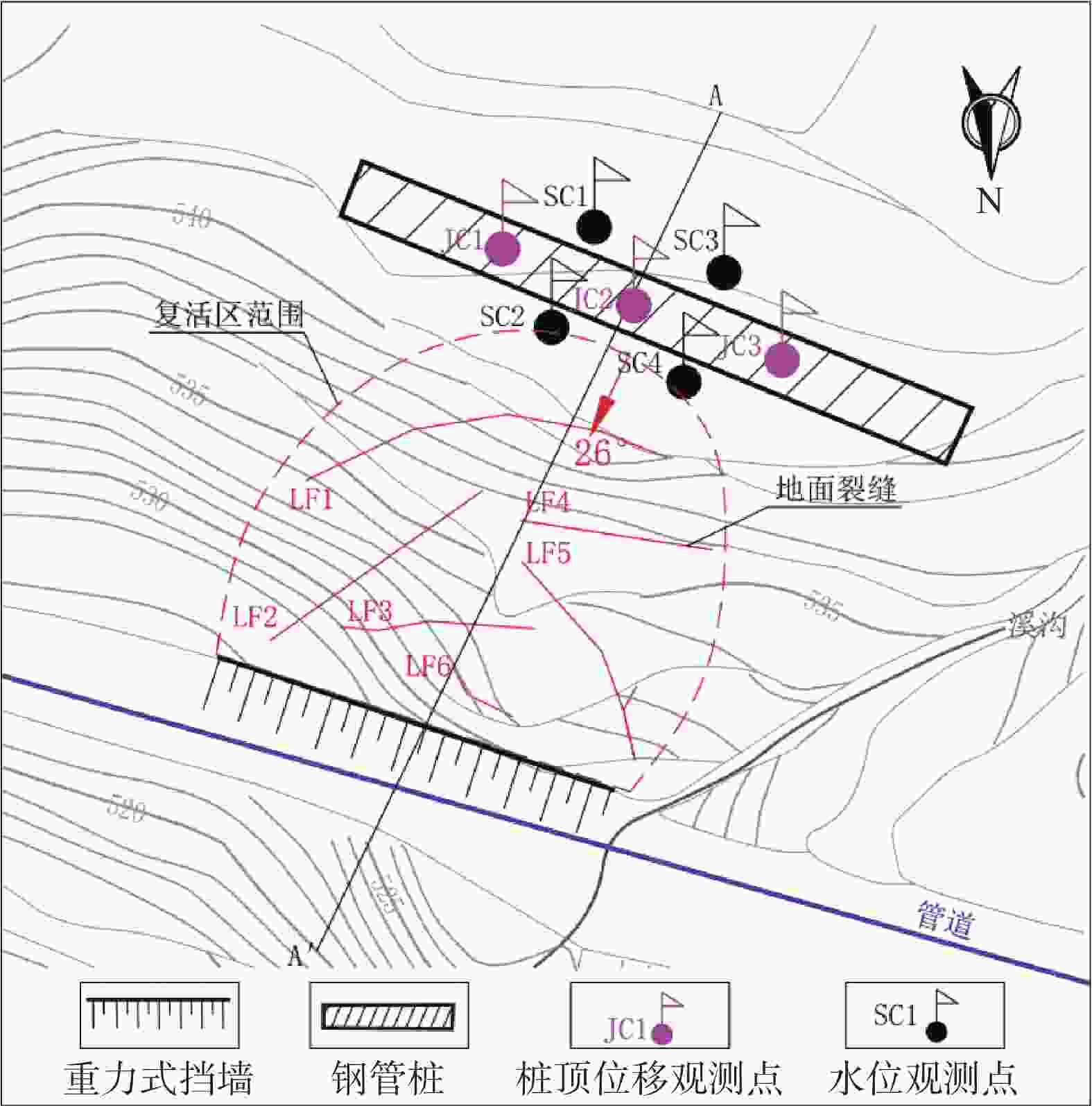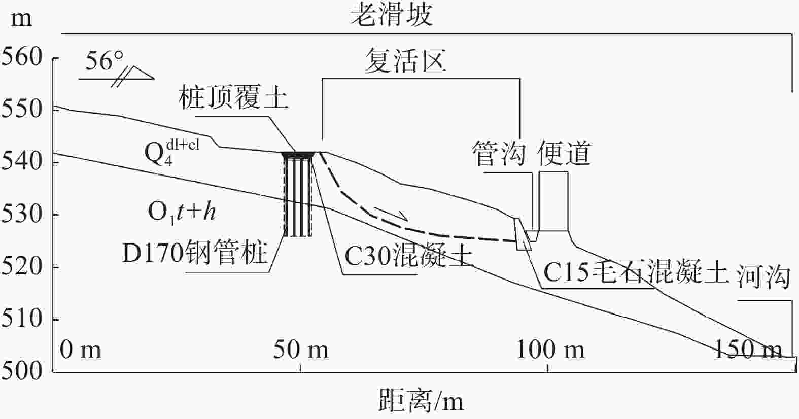 表 1 滑带土物理力学参数表 土体名称 饱和重度/(kN·m−3) 黏聚力/kPa 内摩擦角/(°) 黏土夹碎石 20 10 8 表 2 滑坡推力计算结果 计算区域 计算工况 安全系数Fst 滑坡推力/(kN·m−1) 剪出口 老滑坡 暴雨工况 1.25 359.2 管沟处 复活区 暴雨工况 1.25 196.7 管沟处 表 3 钢管强度参数 材料名称 屈服强度/MPa 抗拉强度/MPa 断后伸长率/% 检验数量