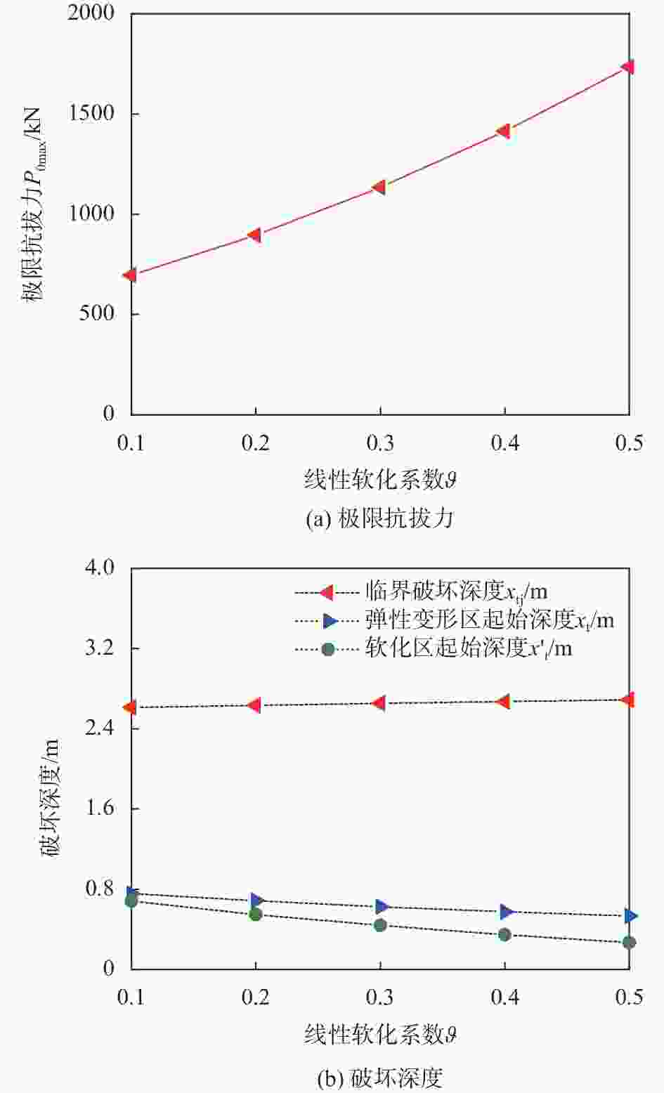 图  13  线性软化系数对极限抗拔力及破坏深度的影响