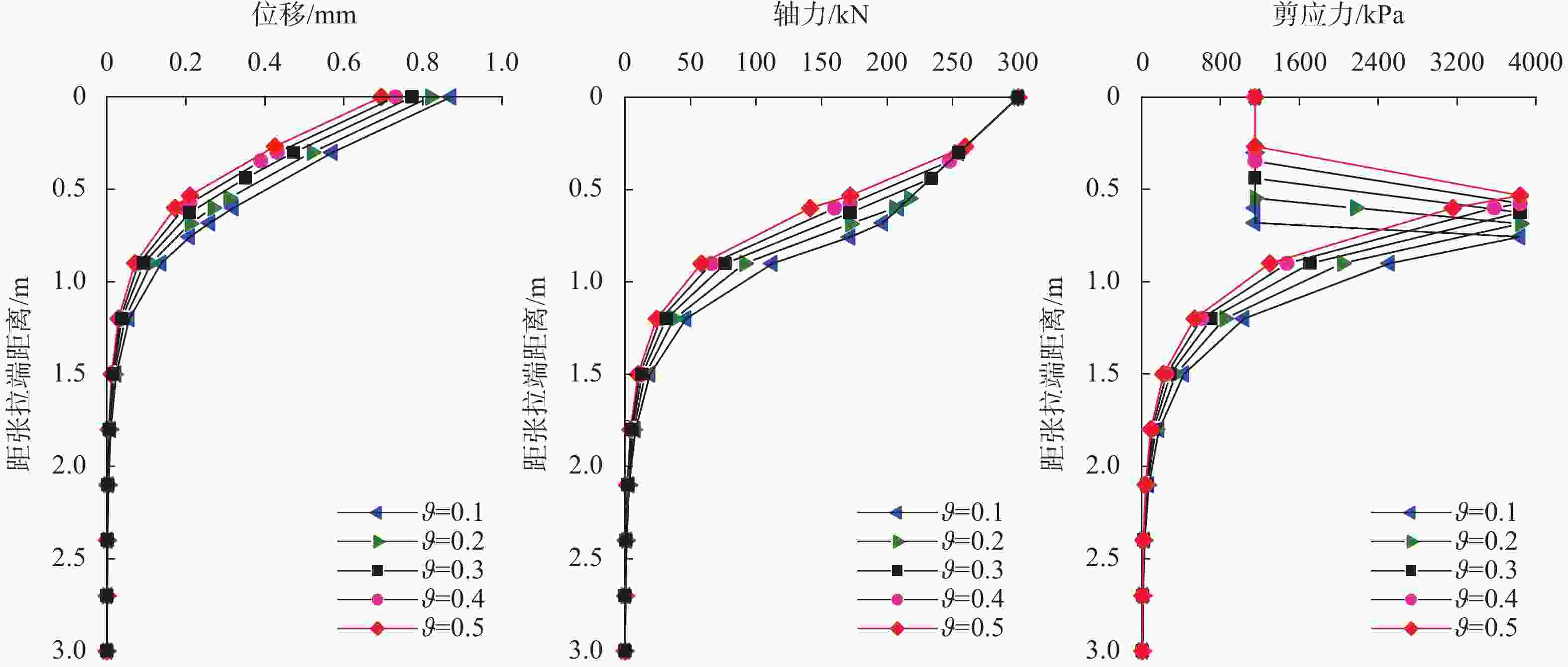 图  14  P0=300 kN时,ϑ的变化对锚杆位移、轴力以及剪应力分布曲线的影响