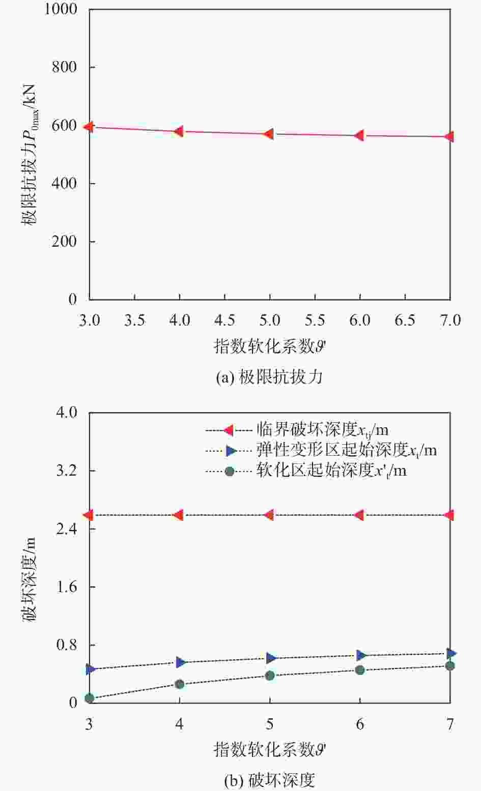 图  15  指数软化系数对极限抗拔力及破坏深度的影响