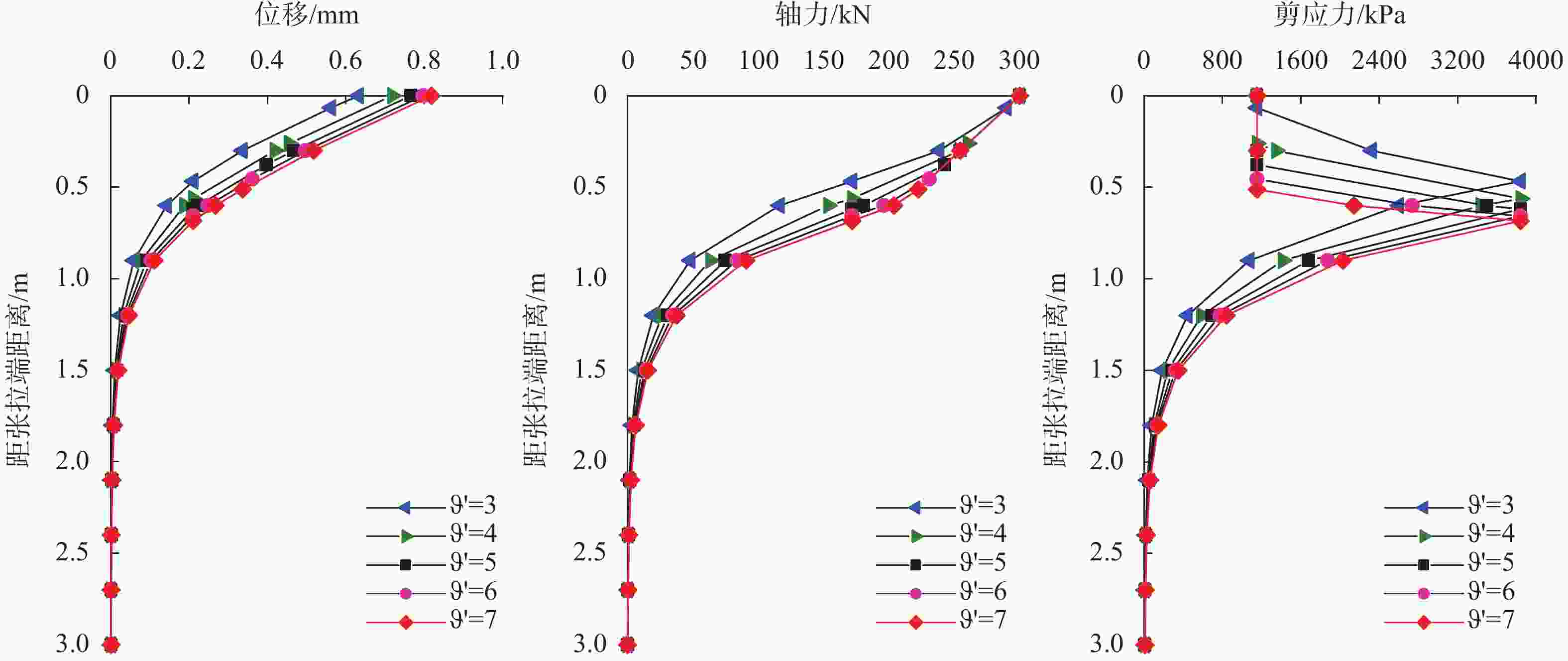 图  16  P0=300 kN时,ϑ'的变化对锚杆位移、轴力以及剪应力分布曲线的影响