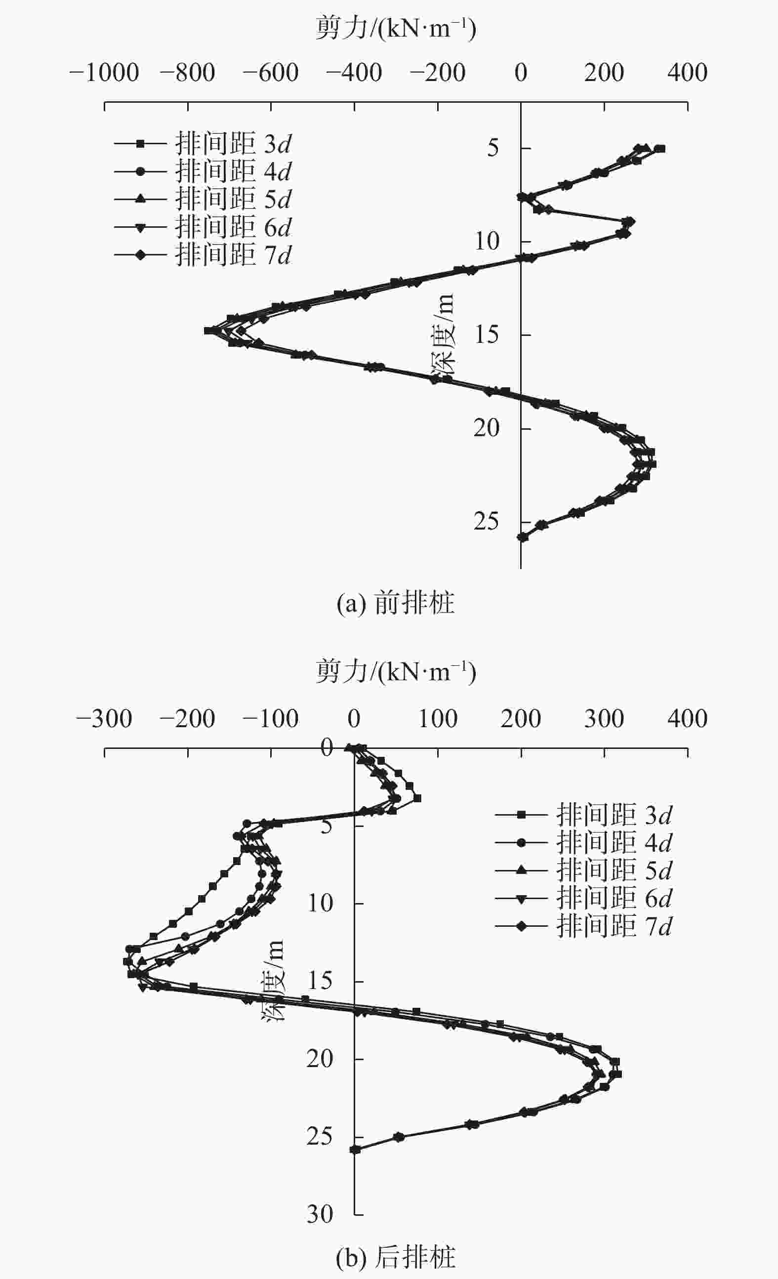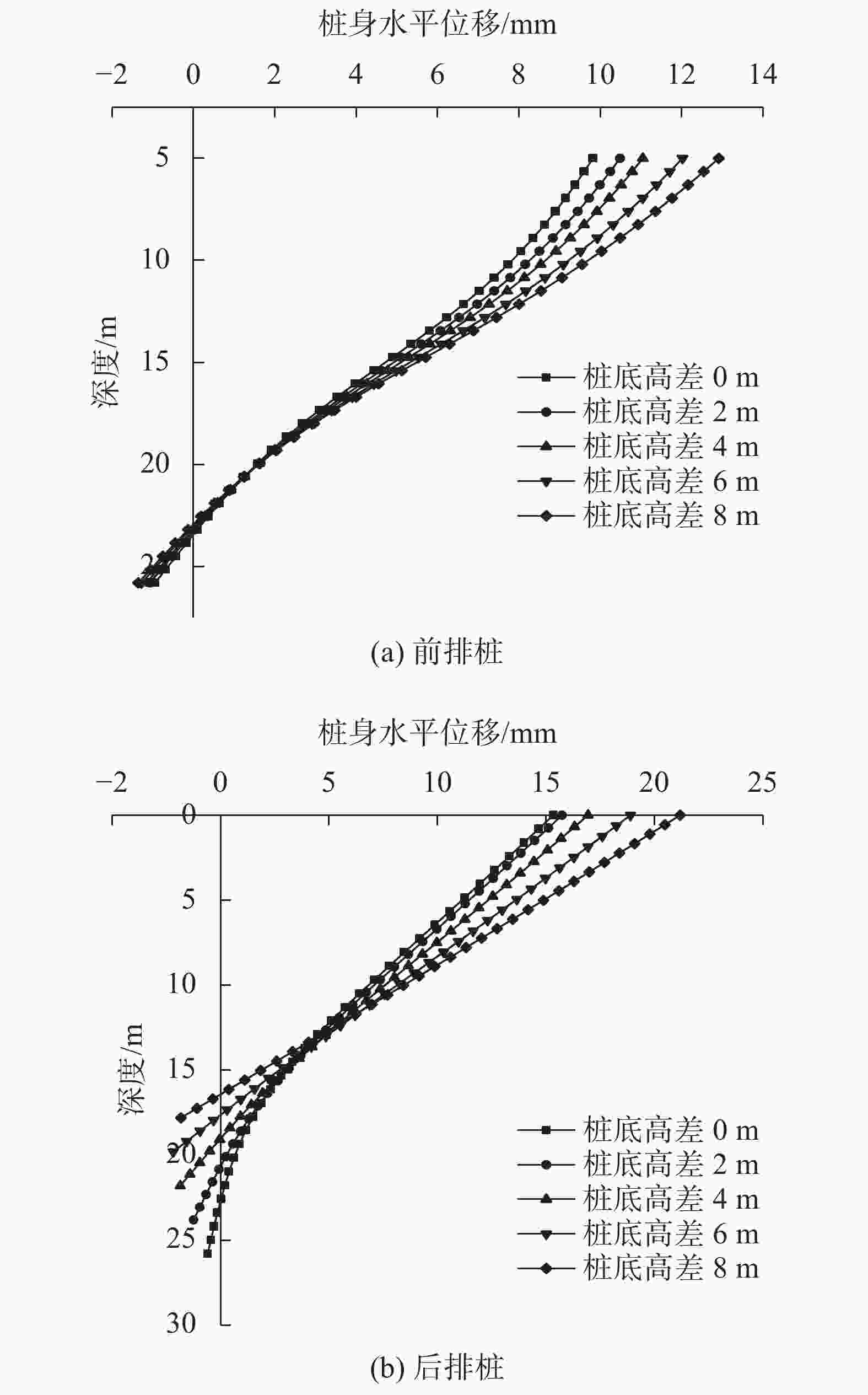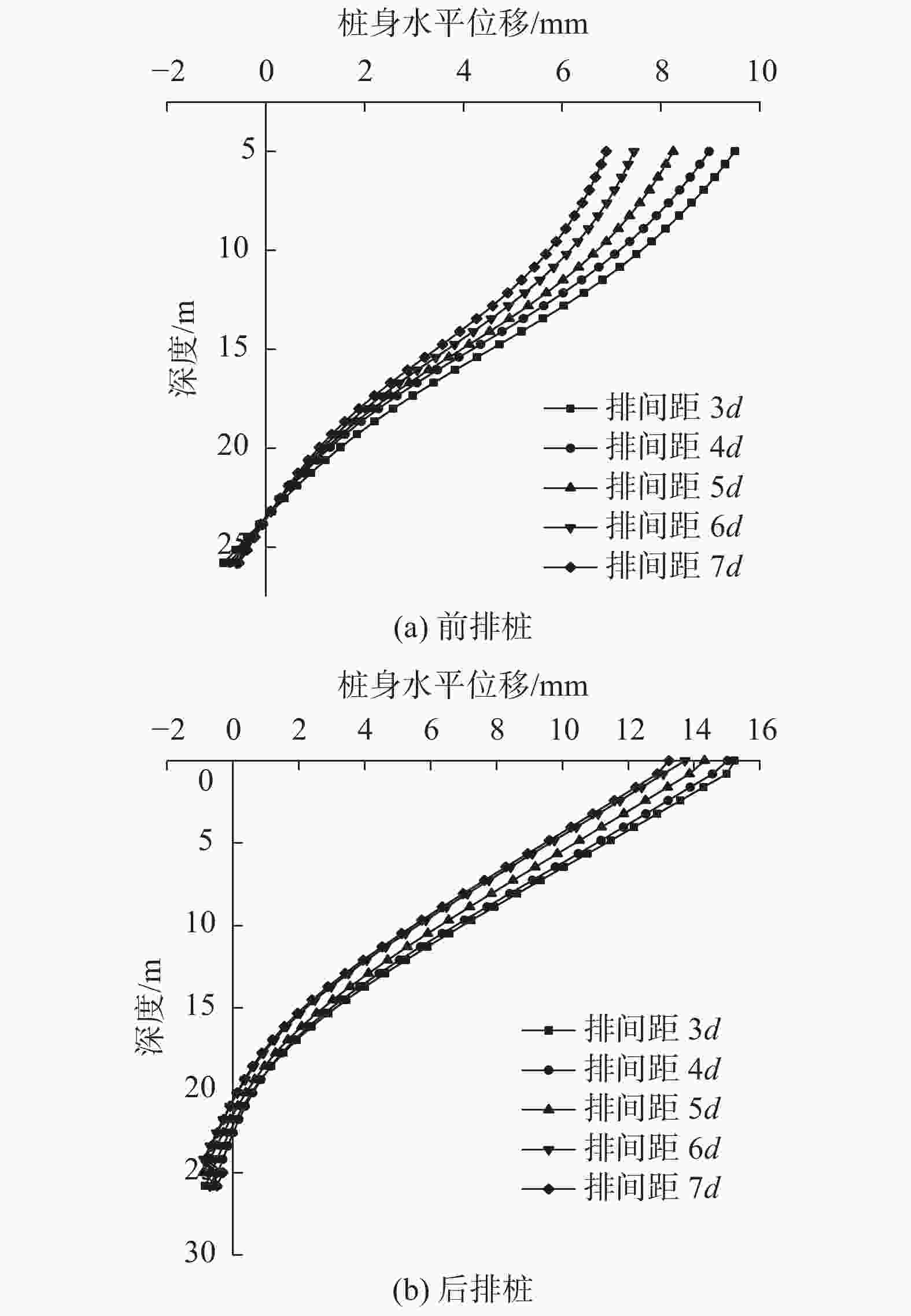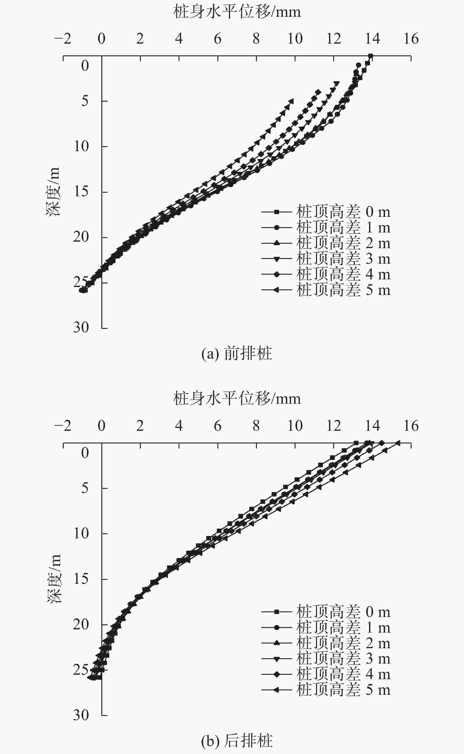 /GPa泊松比 桩单元 2400 30 0.30 梁单元 2200 25 0.25 表 3 支护结构优化前后参数 桩参数 工况 优化前 优化后 桩排间距 3.0d 3.2d 桩顶高差 4.0 m 5.0 m 桩底高差 0 m 4.0 m