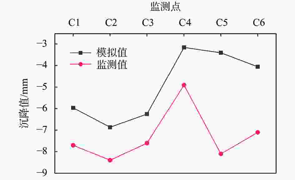图  10  邻近建筑物沉降量模拟值与监测值对比