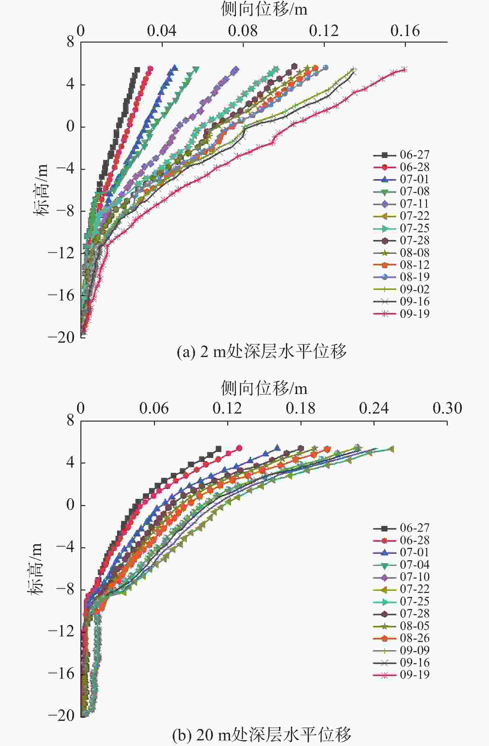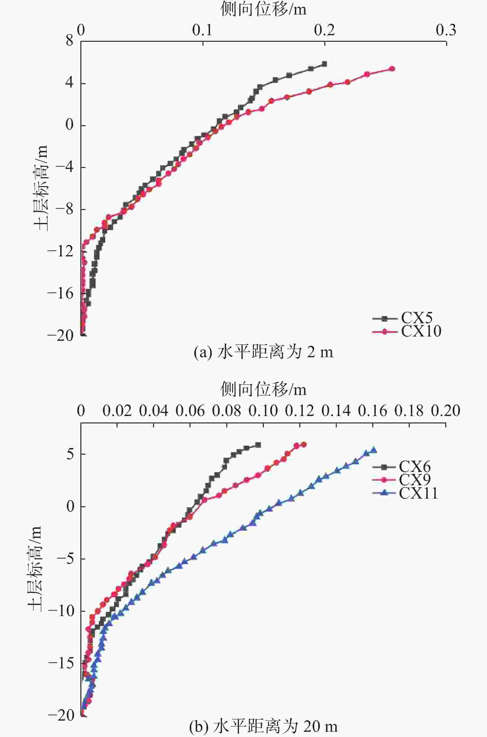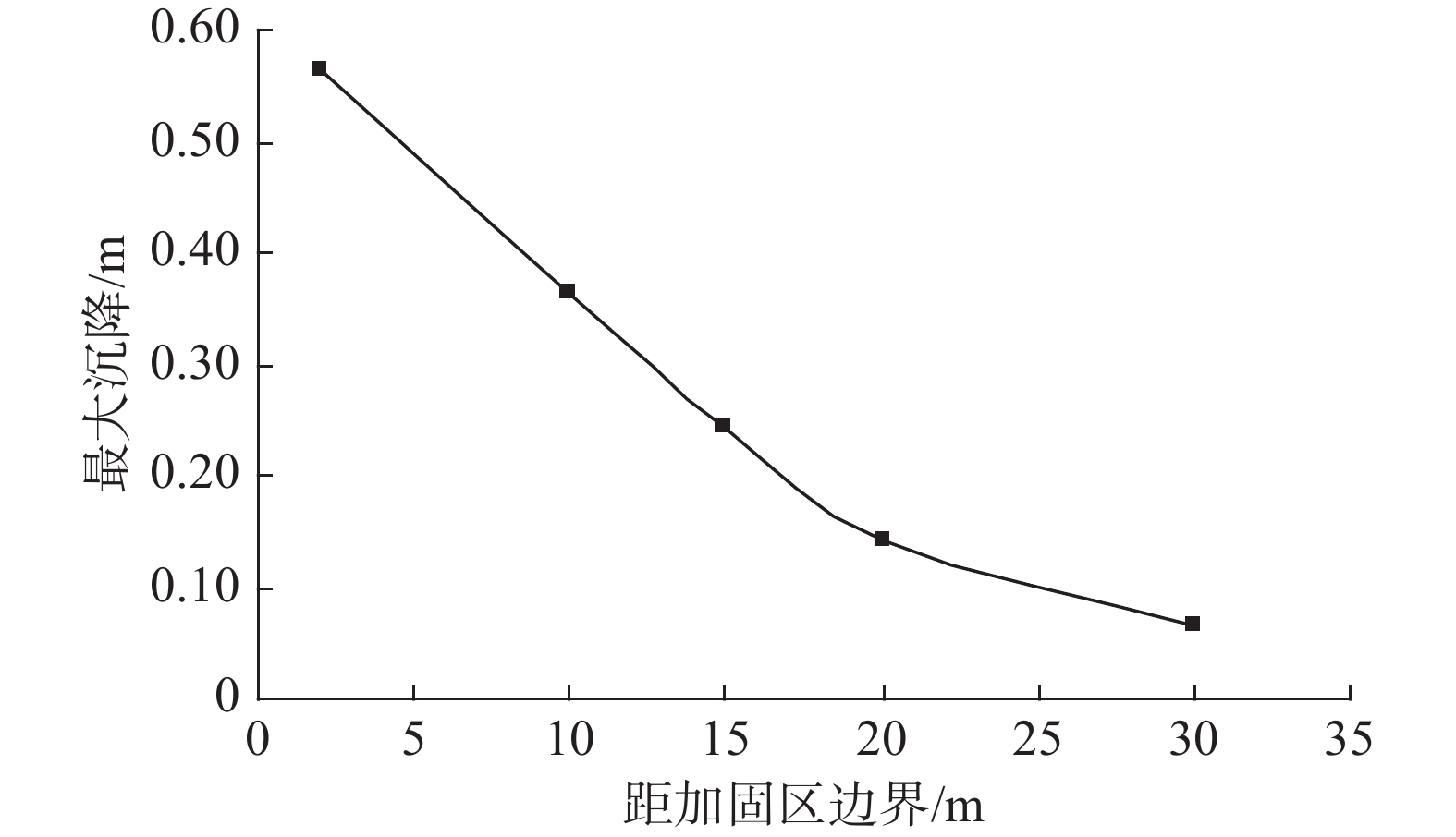 表 1 场地土层参数 土层 天然重度γ/(kN·m−3) 弹性模量E/kPa 泊松比v 黏聚力c/kPa 内摩擦角φ/(°) 渗透系数 Kx/(m·d−1) Ky/(m·d−1) 填土 17.5 2500 0.3 5.0 24.0 1×10−3 1×10−3 淤泥 14.0 1000 0.35 6.0 15.0 9.6×10−6 5.2×10−5 表 2 防护区与未防护区最大地表沉降 监测点位置 最大地表沉降/m 减小幅度/% 未防护区 防护区 距边界2 m 0.564 0.500 11.3 距边界10 m 0.364 0.305 16.2 距边界15 m 0.244 0.078 68.0 距边界20 m 0.143 0.115 19.6 距边界30 m 0.065 0.033 49.2 表 3 防护区和未防护区最大表层位移 监测点位置 最大地表沉降/m 减小幅度/% 未防护区 防护区 距边界2 m 0.253 0.219 13.4 距边界10 m 0.281 0.217 22.8 距边界15 m 0.249 0.131 47.4 距边界20 m 0.146 0.081 44.5 距边界30 m 0.083 0.049 41.0