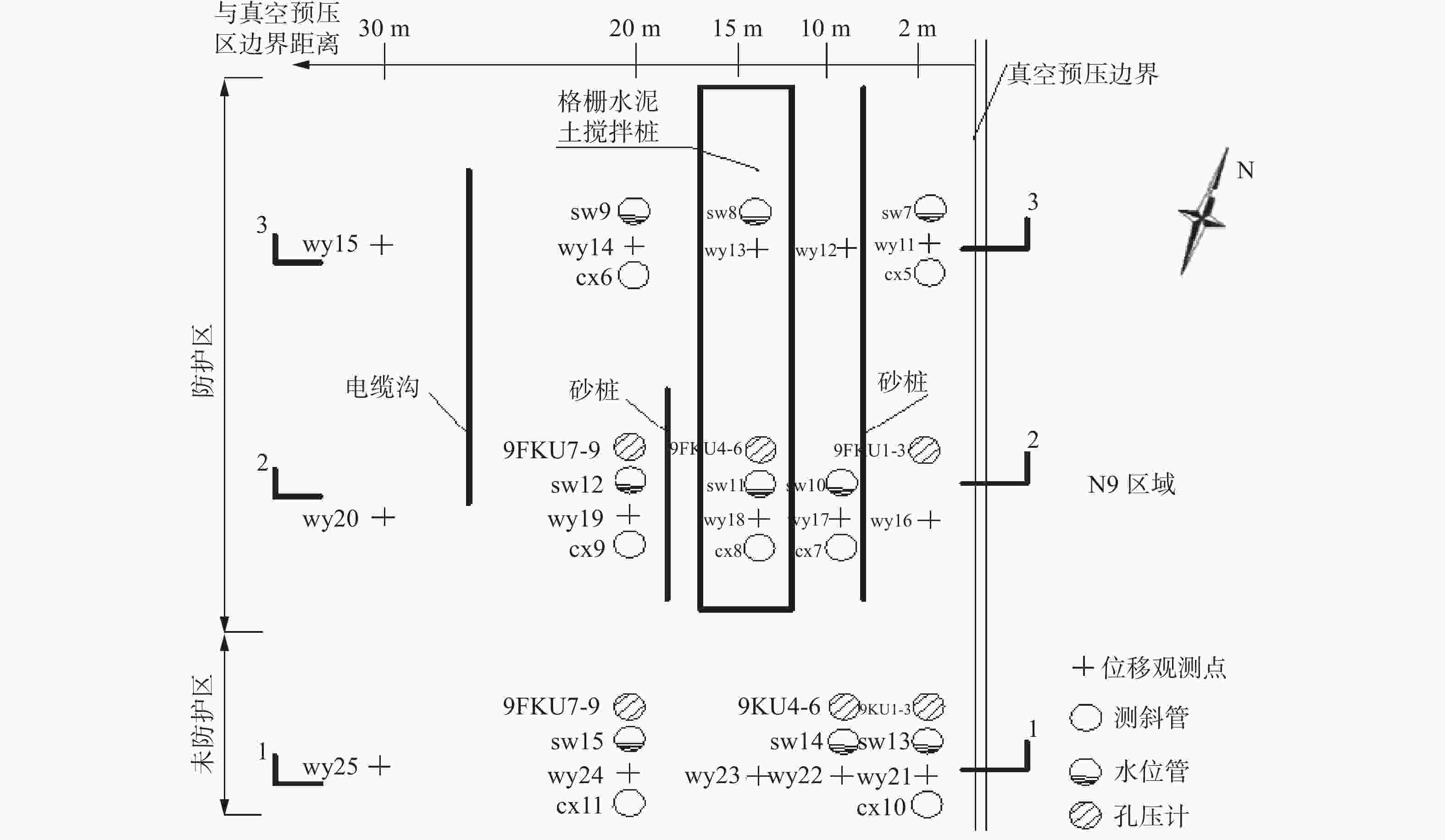 摘要: 真空预压是软基处理常用的方法。为研究真空预压对周边土体的影响及相应的变形防治技术,开展了真空预压加固地基现场试验,通过分析监测数据揭示周边环境变形规律,评价防治效果。研究结果表明:(1)真空预压会引发周边场地水位和孔隙水压力下降,进而产生侧向位移和沉降;(2)真空预压对周边环境的影响范围与土质条件有关;(3)本项目采用砂桩+水泥土搅拌桩防治技术,加固区周边土体水平位移及沉降均减少约40%。Abstract: Vacuum preloading is a commonly used method for soft soil foundation treatment. To study the influence of vacuum preloading on surrounding soil and corresponding deformation prevention technology, a field test of vacuum preloading reinforced foundation was conducted. Through analysis of monitoring data, the deformation patterns of the surrounding environment were revealed, and the effectiveness of prevention measures was evaluated. Research results show that: (1) vacuum preloading caused a decrease in groundwater levels and pore water pressure in the surrounding area, leading to lateral displacement and settlement; (2) the impact range of vacuum preloading on the surrounding environment was found to be related to soil conditions; (3) in this project, a combination of sand piles and cement-soil mixing piles was adopted as a deformation prevention technology, effectively reducing both horizontal displacement and settlement around the reinforced area by approximately 40%.