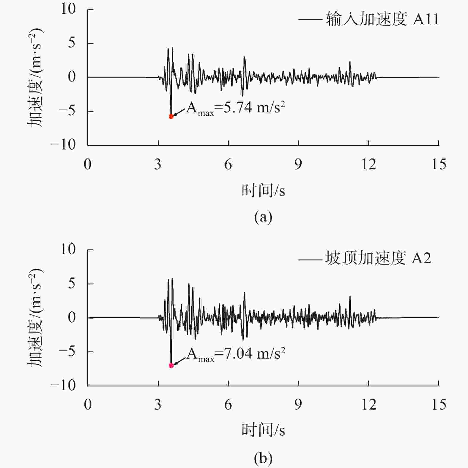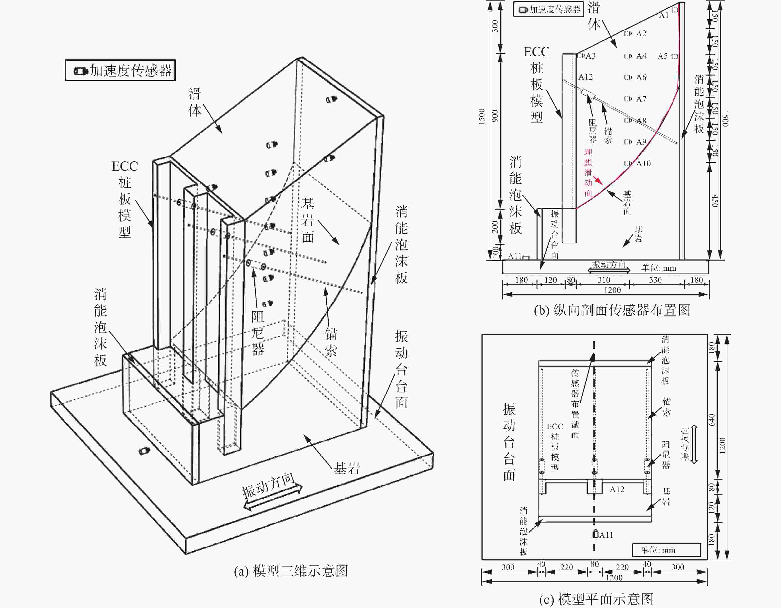 表 1 试验模型相似比尺寸 物理量 相似关系 相似比(原型:模型) 几何尺寸 Cl 10∶1 加速度 Ca 1∶1 重力加速度 Cg=Ca 1∶1 重力 Cγ 1∶1 弹性模量 CE= Cl Cγ 10∶1 黏聚力 Cc= Cl Cγ 10∶1 内摩擦角 Cφ 1 时间 CT= SQRT(Cl/Ca) 3.162∶1 频率 Cω= SQRT(Ca/Cl) 0.316∶1 应力 Cσ= Cl Cγ 10∶1 应变 Cε 1∶1 表 2 振动台技术指标 台面