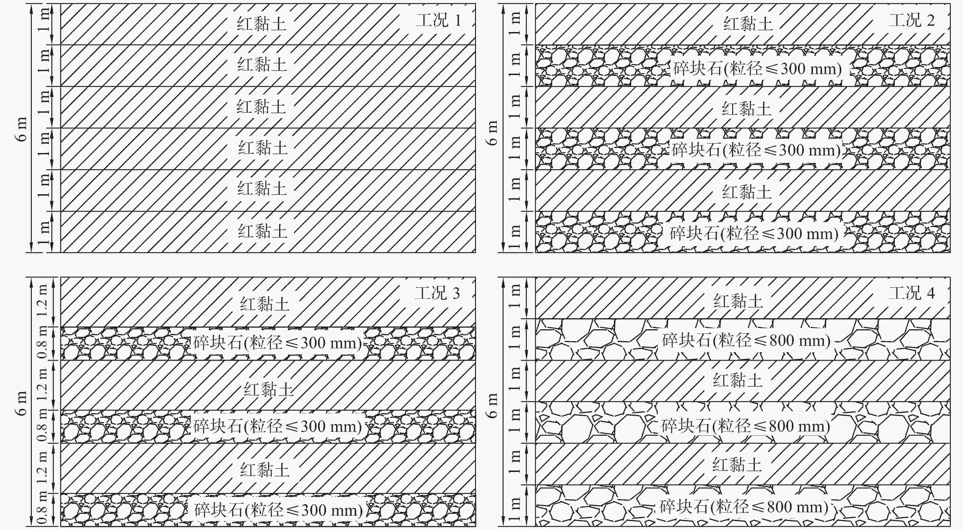 φq/(°)Qdl+pl 次生红黏土(硬塑) 17.3 44.0 1.292 0.18 0.67 1.67 25.4 56.7 11.2 39.5 9.9 Qdl+el 原生红黏土(硬塑) 17.4 43.8 1.259 0.13 0.64 1.67 32.1 60.7 11.6 43.3 10.3 Qdl+el 原生红黏土(可塑) 17.1 49.4 1.433 0.36 0.74 1.67 33.0 39.8 9.7 25.4 6.8 表 2 各试验工况施工参数设计表 试验区 试验工况 土石比 石料粒径