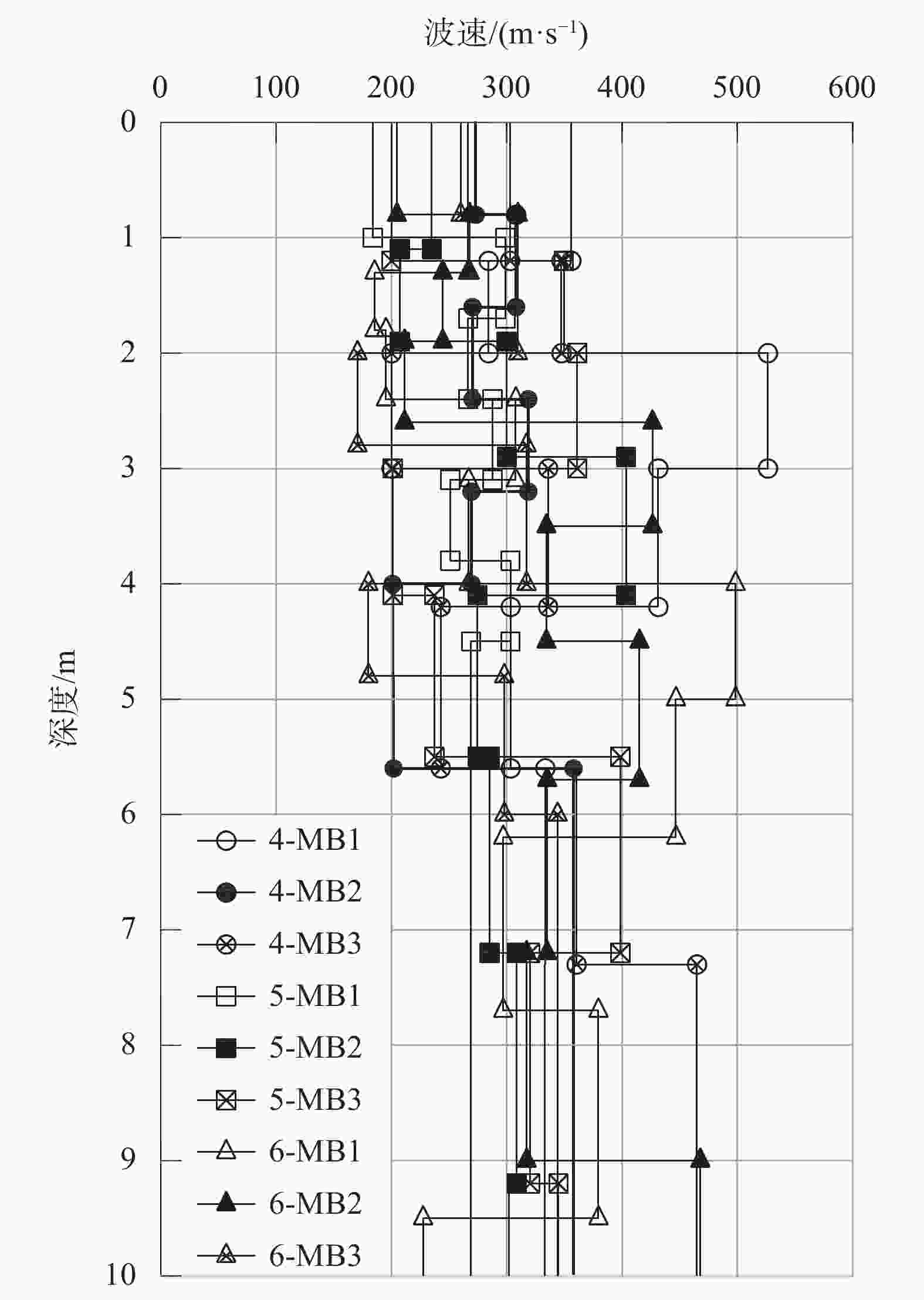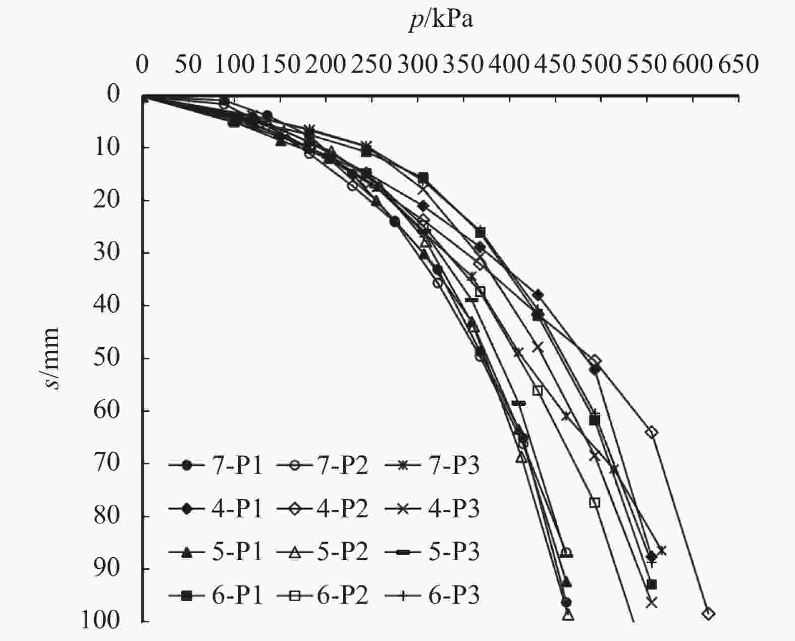 /mm工况1 第一序 5~7 1440~3000 125~625 640~1150 第一序(补) 5~7 1090~2460 160~490 第二序 7~8 1400~2490 80~475 第二序(补) 5 960~1880 155~460 工况2 第一序 9~11 1580~3284 44.0~97.5 50~320 第二序 9~11 1637~2946 21.5~98.5 工况3 第一序 8~13 247~497 7.5~38.0 360~750 第二序 10~13 265~344 7.5~13.0 工况4 第一序 6~11 68~262 11.0~66.5 350~680 第二序 8~11 250~330 10.5~20.0 表 4 载荷试验成果统计表 试验位置 承载力特征值/kPa 对应沉降量/mm 变形模量/MPa 工况1 7-P1 225 14.14 16 7-P2 207 14.14 15 7-P3 226 14.14 16 工况2 4-P1 246 14.72 17 4-P2 278 20.20 14 4-P3 244 9.53 26 工况3 5-P1 203 11.82 18 5-P2 206 10.49 20 5-P3 203 11.43 18 工况4 6-P1 244 10.57 24 6-P2 244 14.57 17 6-P3 244 9.46 27 表 5 现场剪切试验成果统计表 试验工况 试验状态 试验深度