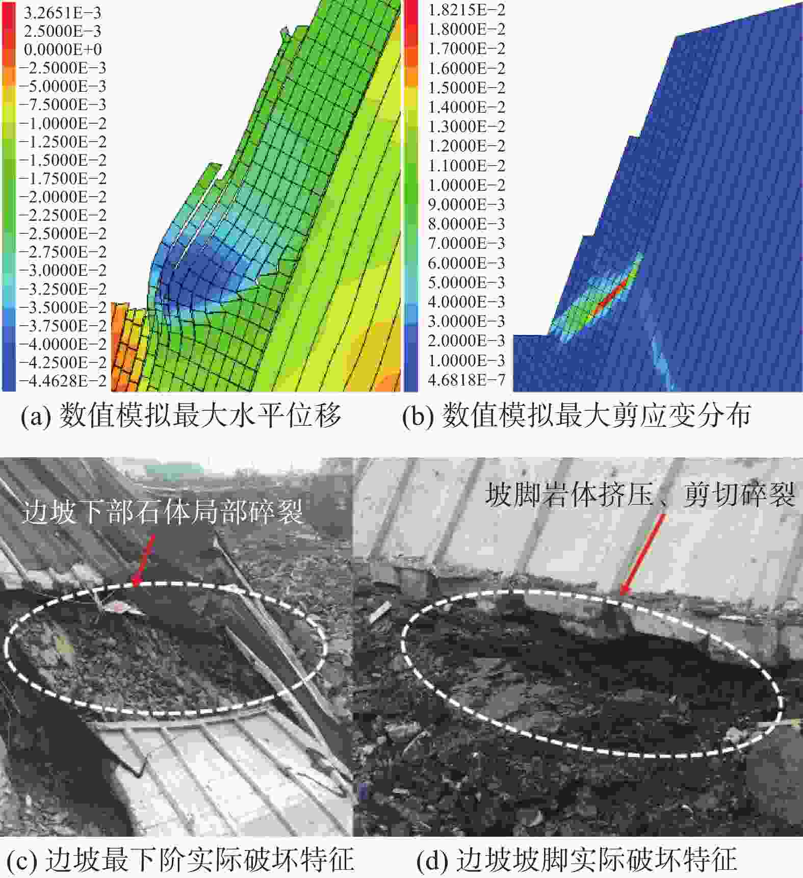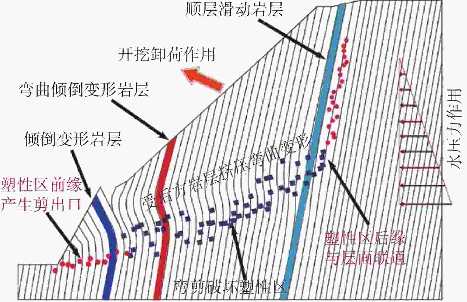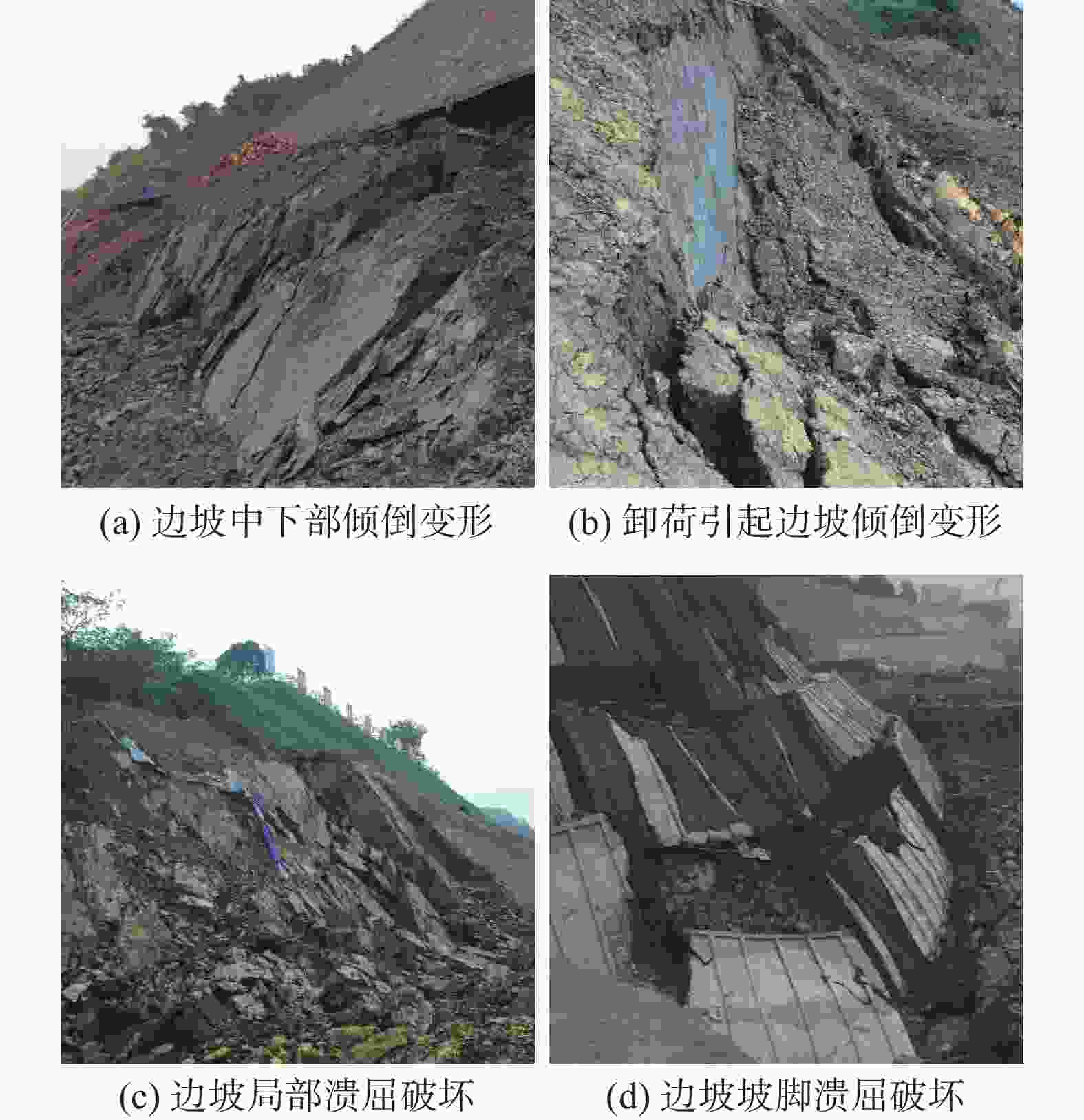 摘要: 大量工程实践表明,非滑动破坏的顺层边坡可能存在溃屈和倾倒的变形、破坏机制。为研究两种特殊机制的产生机理和支护方案,通过离散元数值模拟方法和典型工程项目的相关数据分析,结合层状岩体的破坏试验,研究了顺层边坡产生溃屈和倾倒的基本条件及变形、破坏规律。结果表明:对于顺层高边坡,当边坡坡角与岩层层面倾角相同或接近时,在表层层状岩体自重作用下,坡脚可能出现屈服并产生浅表垮塌,进而引发边坡产生溃屈破坏;当边坡坡角小于岩层层面倾角时,边坡可能产生倾倒变形;顺层边坡倾倒变形与后续的破坏模式需分开看待,最终的破坏形式受边坡变形演化的影响,存在动态变化过程。对于存在溃屈和倾倒变形破坏机制的顺层岩质边坡,建议在坡脚设置大刚度支撑结构进行支护。Abstract: A large number of engineering practices show that the deformation and damage mechanisms of toppling and buckling may exist in the non-sliding damaged bedding slopes. To study the generation mechanism and support scheme of two special mechanisms, the basic conditions, deformation, and failure laws of bedding slopes were studied through discrete element numerical simulation method and relevant data analysis of typical engineering projects, combined with failure tests of layered rock masses. The results show that: for high-rise slopes, when the slope angle is the same or close to the dip angle of the rock layer, the foot of the slope may yield and shallow collapse under the self-weight of the surface layered rock mass, leading to the buckling failuare of the slope; when the slope angle is smaller than the dip angle of the rock layer, the slope may undergo toppling deformation; the toppling deformation and subsequent failure modes of layered slopes need to be viewed separately, and the final failure form is influenced by the evolution of slope deformation and undergoes dynamic changes. For layered rock slopes with mechanisms of buckling and toppling deformation, it is recommended to install high-stiffness support structures at the foot of the slope for support.