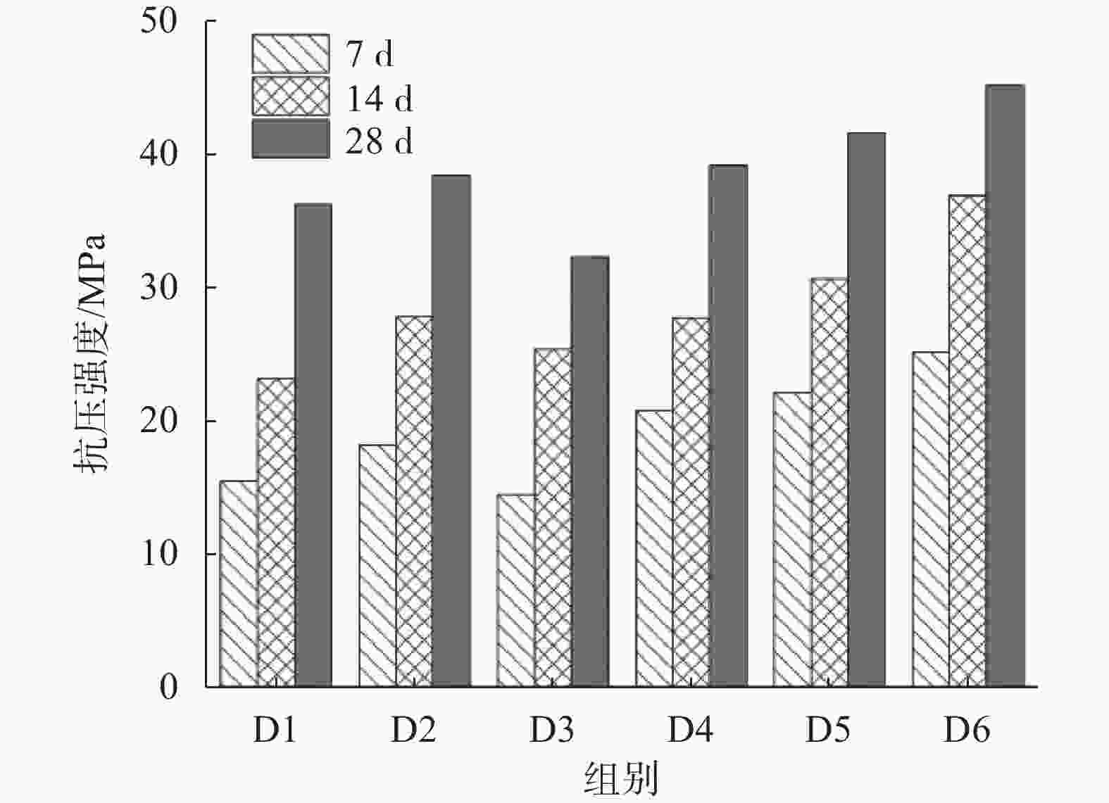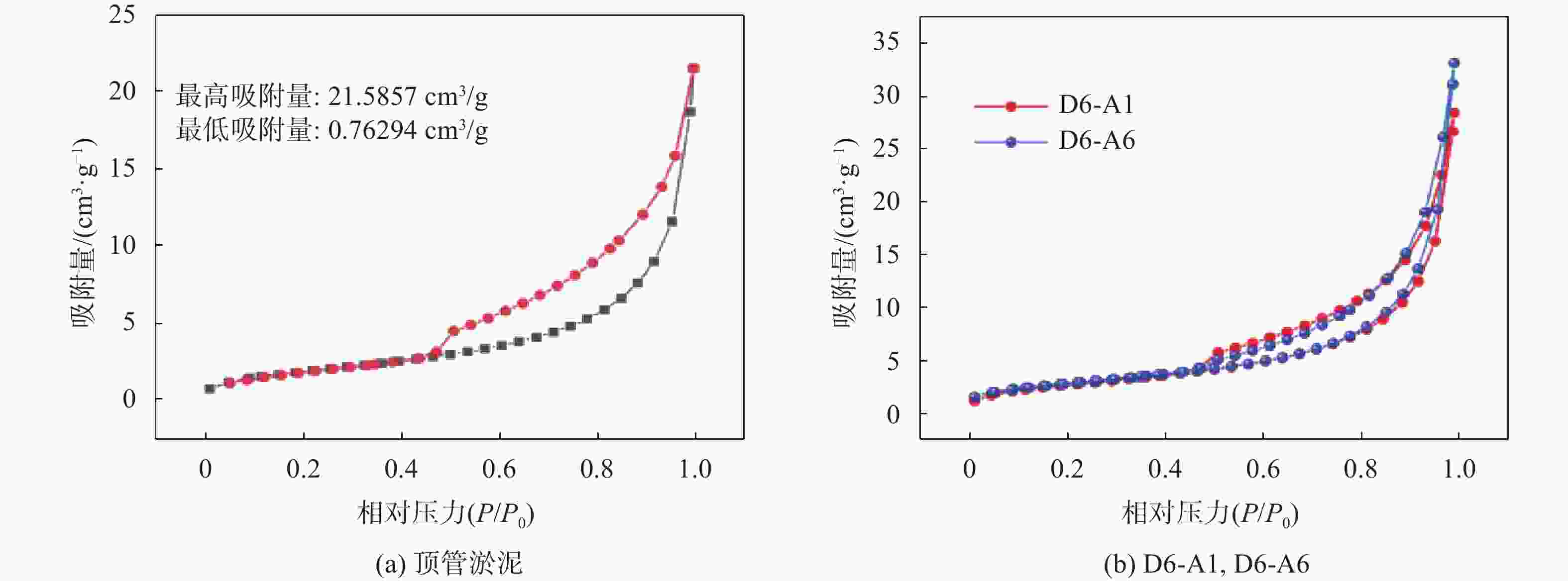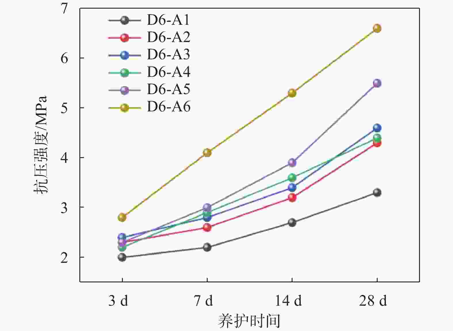 表 1 顶管淤泥化学成分组成 成分 SiO2 Al2O3 Fe2O3 CaO P2O5 MgO 其它 占比/% 57.31 17.44 9.65 6.95 3.17 2.24 3.24 表 2 建筑垃圾化学成分组成表 成分 SiO2 CaO Al2O3 Fe2O3 SO3 其它 占比/% 39.85 35.09 8.93 6.03 3.09 7.01 表 3 顶管淤泥稳定化药剂设计配比表 序号 成分质量占比/% 矿渣 磷石膏 激发剂 活化剂 D1 62 20 15 3 D2 57 20 20 3 D3 52 20 25 3 D4 62 15 20 3 D5 57 15 25 3 D6 52 15 30 3 表 4 道路底基层材料配比表(质量比) % 编号 稳定化药剂 建筑垃圾 顶管淤泥 外掺水 A1 8 61 35 9 A2 8 63 33 10 A3 10 58 37 8 A4 10 60 35 9 A5 8 66 30 8 A6 10 55 40 10 表 5 道路底基层材料孔隙结构参数 样品 比表面积 /(m2·g−1) 平均孔容 /(cm3·g−1) 平均孔径 /nm 顶管淤泥 7.2137 0.017849 9.8972 D6-A1 9.9303 0.025061 10.0949 D6-A3 11.3595 0.028743 10.1213 D6-A5 10.2498 0.028550 11.1419 D6-A6 10.2861 0.028427 11.0546