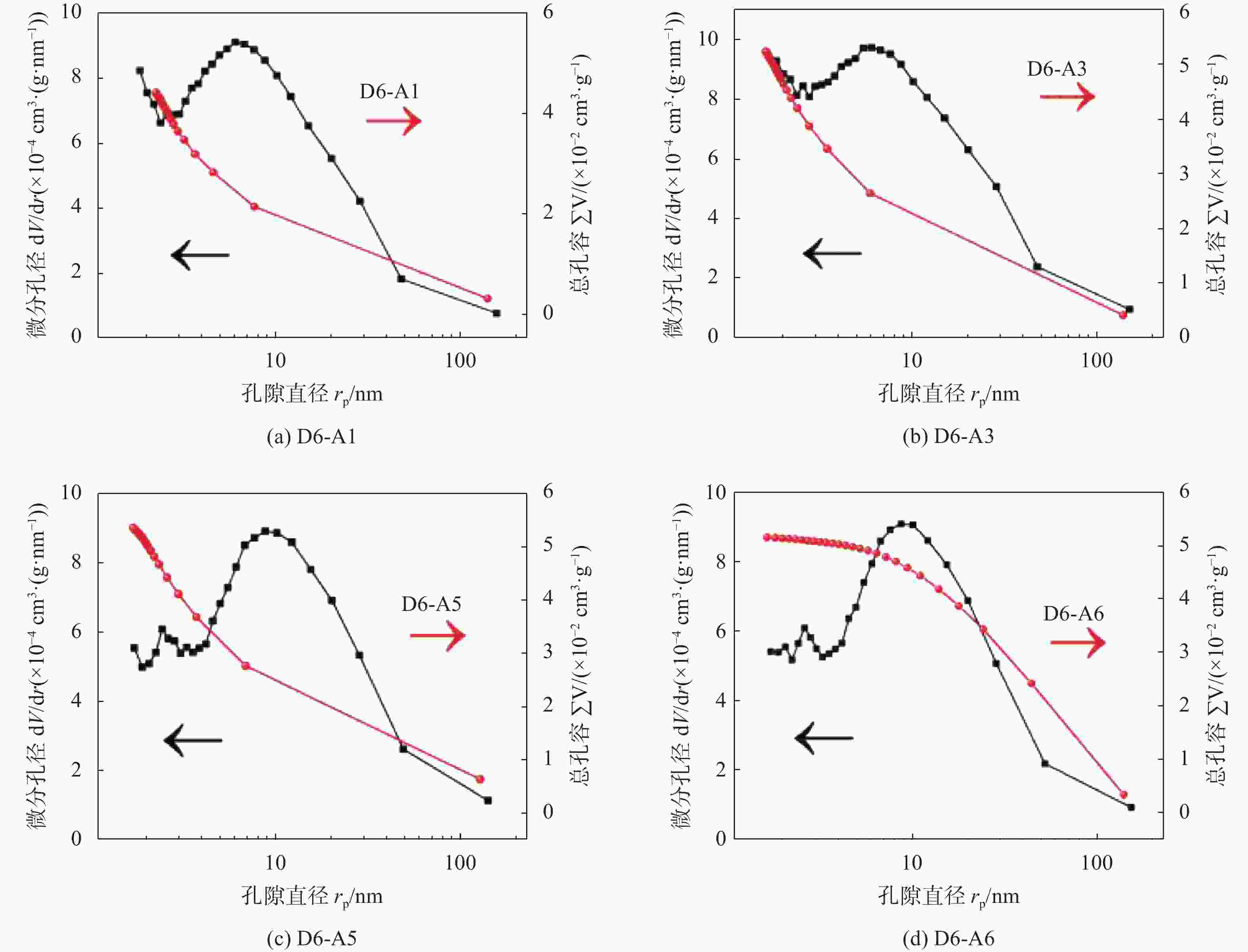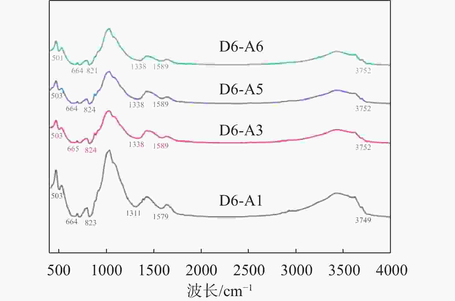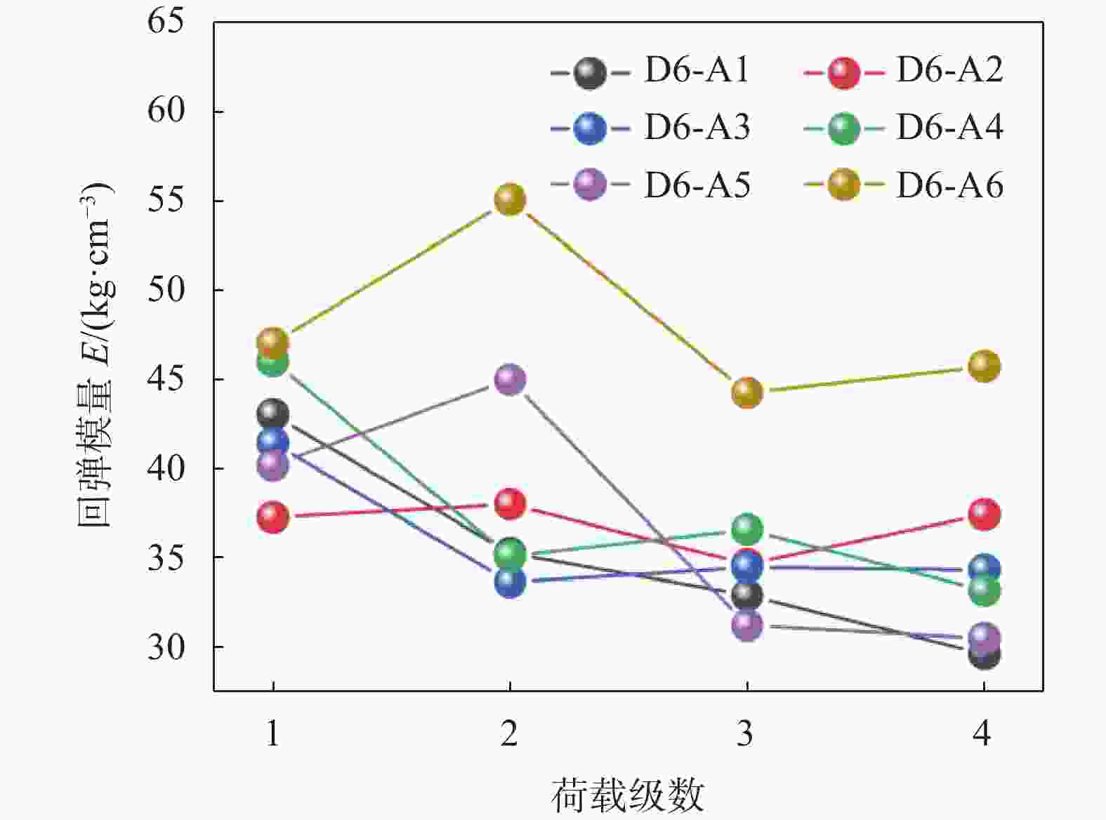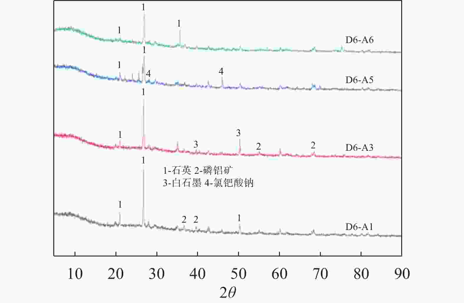 表 1 顶管淤泥化学成分组成 成分 SiO2 Al2O3 Fe2O3 CaO P2O5 MgO 其它 占比/% 57.31 17.44 9.65 6.95 3.17 2.24 3.24 表 2 建筑垃圾化学成分组成表 成分 SiO2 CaO Al2O3 Fe2O3 SO3 其它 占比/% 39.85 35.09 8.93 6.03 3.09 7.01 表 3 顶管淤泥稳定化药剂设计配比表 序号 成分质量占比/% 矿渣 磷石膏 激发剂 活化剂 D1 62 20 15 3 D2 57 20 20 3 D3 52 20 25 3 D4 62 15 20 3 D5 57 15 25 3 D6 52 15 30 3 表 4 道路底基层材料配比表(质量比) % 编号 稳定化药剂 建筑垃圾 顶管淤泥 外掺水 A1 8 61 35 9 A2 8 63 33 10 A3 10 58 37 8 A4 10 60 35 9 A5 8 66 30 8 A6 10 55 40 10 表 5 道路底基层材料孔隙结构参数 样品 比表面积 /(m2·g−1) 平均孔容 /(cm3·g−1) 平均孔径 /nm 顶管淤泥 7.2137 0.017849 9.8972 D6-A1 9.9303 0.025061 10.0949 D6-A3 11.3595 0.028743 10.1213 D6-A5 10.2498 0.028550 11.1419 D6-A6 10.2861 0.028427 11.0546