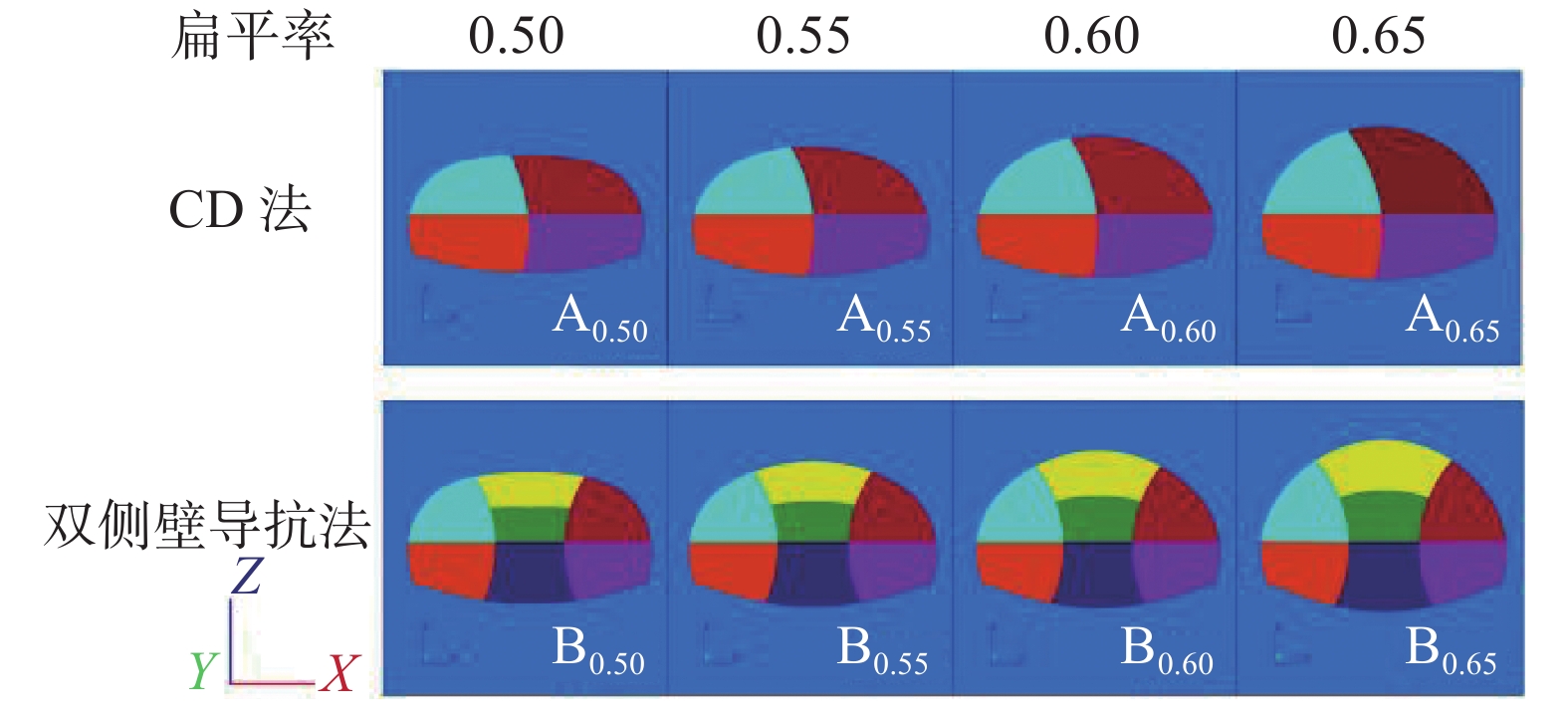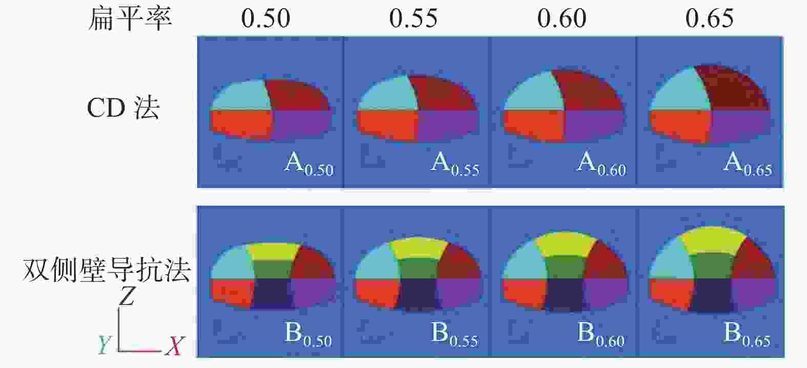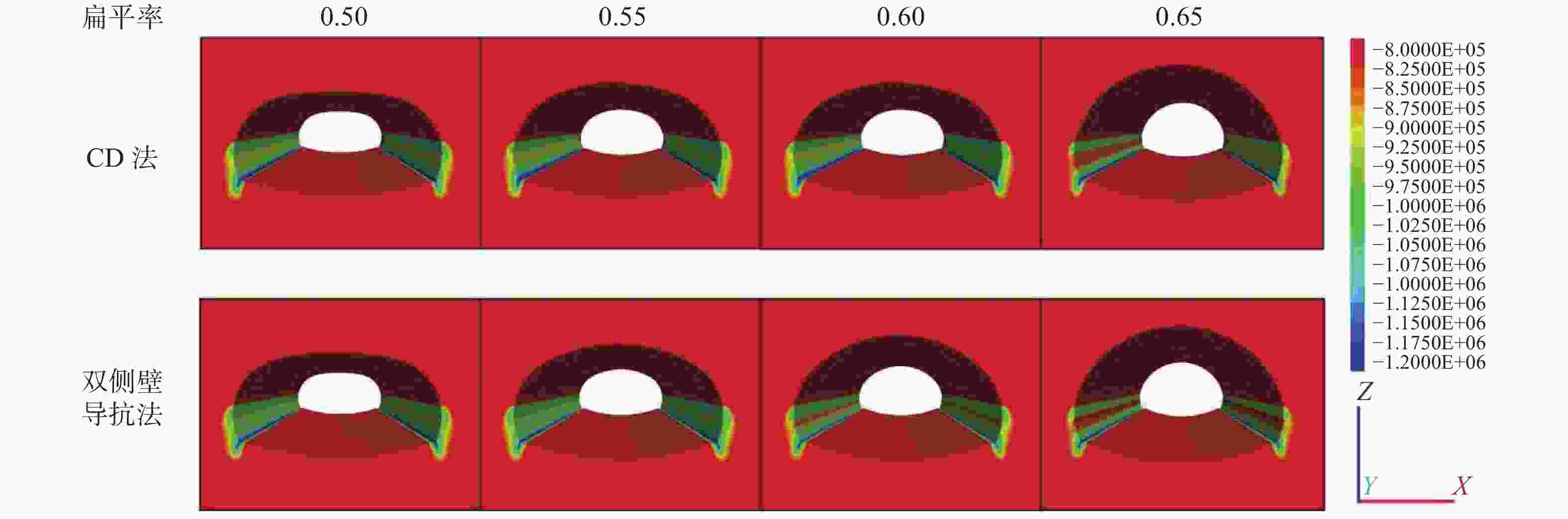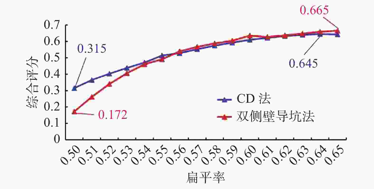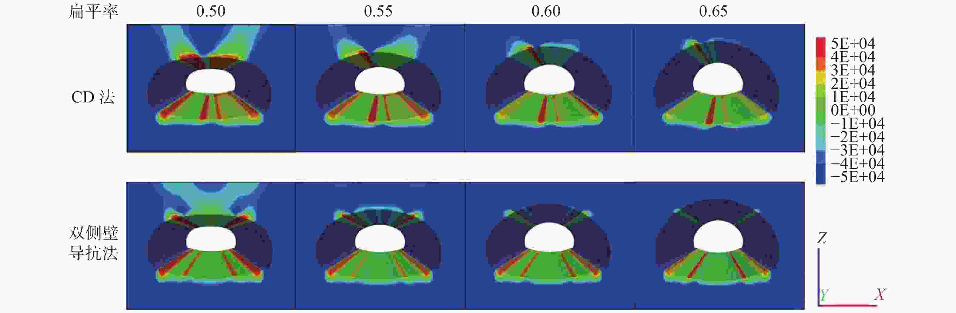 kPa 指标 部位 方案 A0.50 A0.55 A0.60 A0.65 B0.50 B0.55 B0.60 B0.65 最大主应力 拱顶 34.07 17.60 −15.94 −31.78 −14.85 −48.35 −56.03 −68.42 拱底 21.31 17.26 12.57 6.25 −1.29 −4.47 −8.06 −7.86 左拱腰 −183.82 −184.08 −122.30 −134.34 −103.31 −119.49 −130.29 −84.00 右拱腰 −165.00 −187.86 −153.15 −142.69 −122.37 −113.87 −122.95 −80.16 左拱脚 −428.31 −445.87 −464.91 −484.59 −417.48 −447.74 −459.70 −485.59 右拱脚 −467.90 −473.36 −488.41 −510.55 −449.34 −469.33 −480.90 −513.42 最小主应力 拱顶 −191.69 −204.15 −218.32 −212.77 −48.76 −108.27 −138.23 −169.76 拱底 −87.70 −137.72 −156.55 −192.21 −62.07 −77.14 −95.91 −121.14 左拱腰 −854.72 −858.47 −828.43 −780.14 −892.59 −870.88 −871.84 −763.75 右拱腰 −847.55 −853.26 −827.48 −799.02 −834.70 −855.45 −870.31 −752.81 左拱脚 −1346.70 −1354.24 −1354.51 −1366.79 −1391.02 −1362.01 −1371.47 −1416.59 右拱脚 −1306.26 −1298.95 −1291.88 −1305.29 −1379.11 −1339.15 −1345.58 −1389.06 注:正值代表拉应力,负值代表压应力。 表 4 各方案评判指标数据