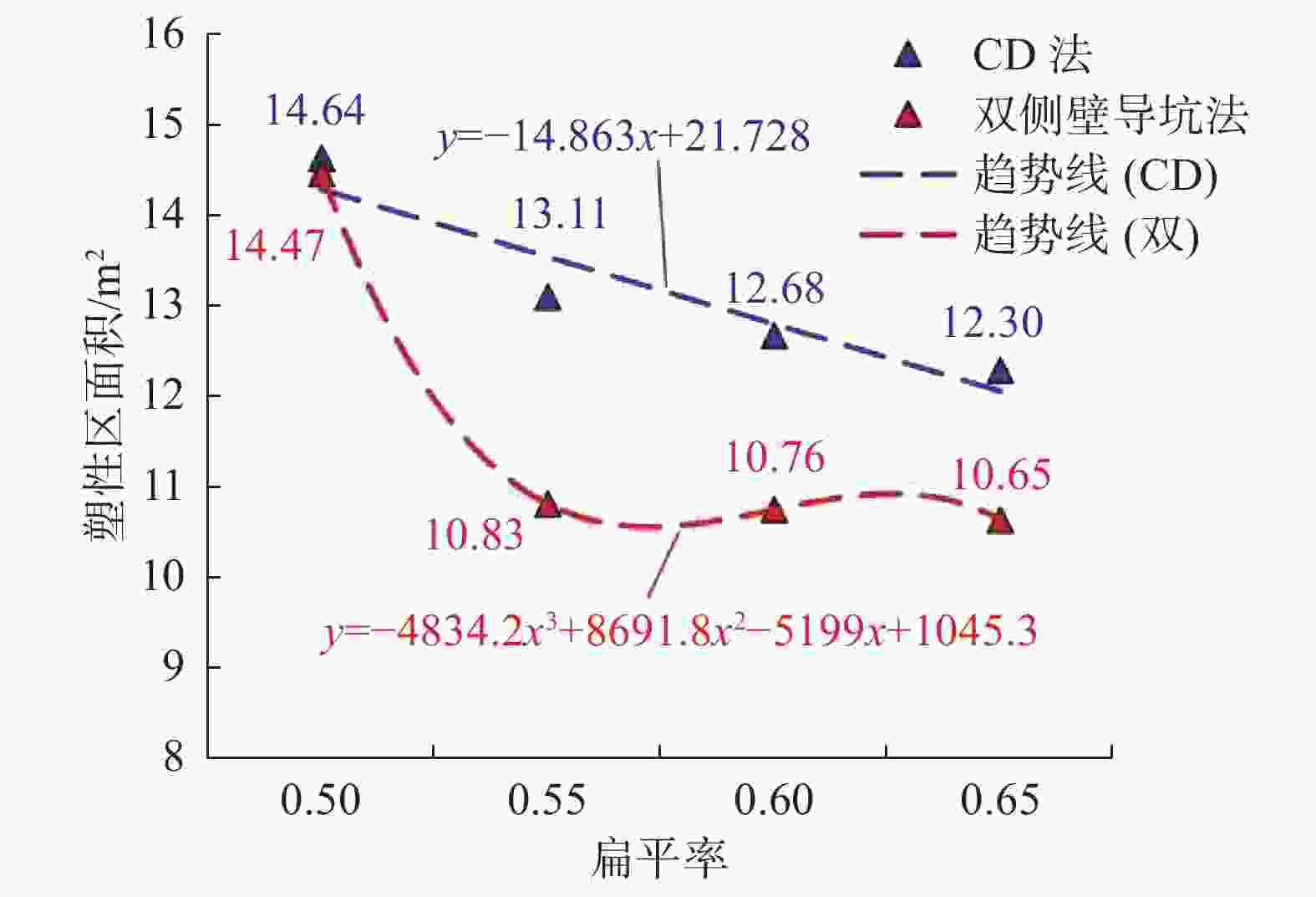 排序 方案 综合评分 扁平率 开挖工法 1 B0.65 0.669 0.65 双侧壁导坑法 2 A0.65 0.644 0.65 CD法 3 B0.60 0.639 0.60 双侧壁导坑法 4 A0.60 0.611 0.60 CD法 5 A0.55 0.516 0.55 CD法 6 B0.55 0.494 0.55 双侧壁导坑法 7 A0.50 0.315 0.50 CD法 8 B0.50 0.172 0.50 双侧壁导坑法 表 7 计算值与实测值对比