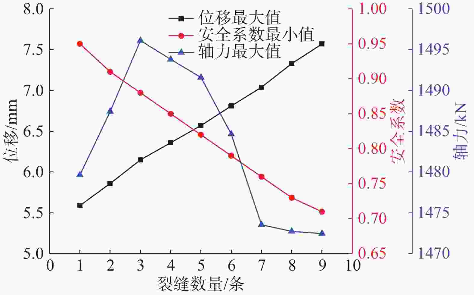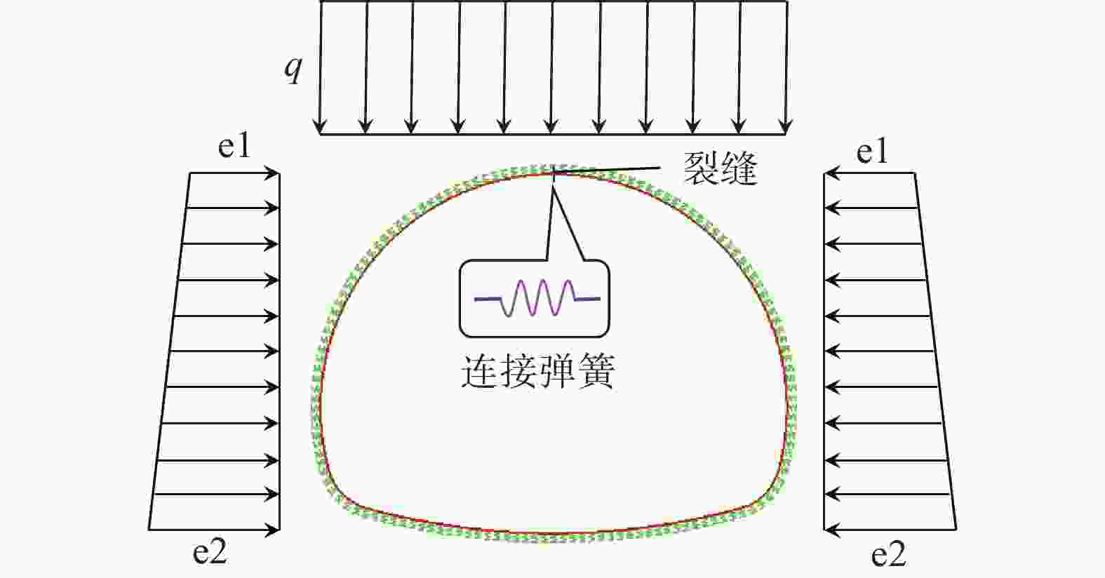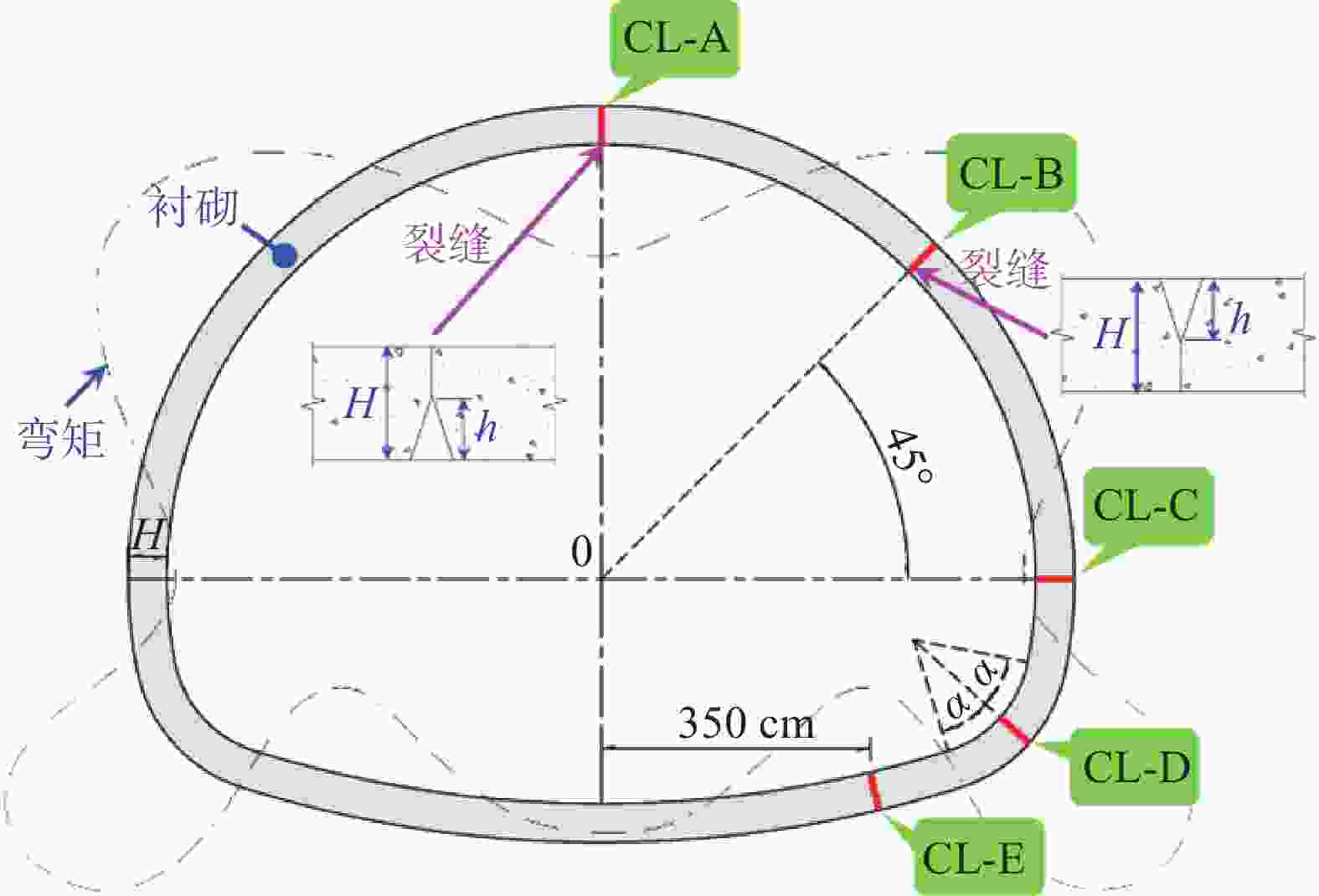 摘要: 为了研究运营隧道纵向裂缝发育性状对二次衬砌结构受力及形变特征的影响规律,根据隧道裂缝调查结果建立衬砌结构的荷载–结构计算模型,并进行带裂缝衬砌结构的受力变形分析。结果表明:衬砌开裂导致支护结构(除仰拱外)的受力(弯矩绝对值)减小,裂缝深度增加使得结构弯矩出现两次突变,造成局部应力瞬间损失,但衬砌厚度的增加一定程度减缓了应力损失;拱顶与拱肩附近裂缝处结构变形较为严重,结构安全系亦显著降低,当裂缝深度占比衬砌厚度约70%时(拱顶开裂时占比约40%),衬砌结构安全系数降低至零,且随着裂缝数量增加,衬砌结构整体安全性呈线性降低。可见,衬砌裂缝发育到一定程度时,结构整体安全系数小于设计规范所规定的下限值,对起拱线以上裂缝应及时探明裂缝深度并控制其变形,起拱线以下裂缝处易发生压碎破坏,应及时补强支护,以抵抗拱脚上部衬砌结构的下压力,对运营隧道衬砌病害处治具有理论指导意义。Abstract: To investigate the influence of longitudinal crack development on the mechanics and deformation characteristics of the secondary lining structure, a load-structure calculation model was established based on tunnel crack investigation. Stress deformation analysis was conducted for the cracked lining structure. The results indicate that cracking in the lining leads to a decrease in stress (absolute bending moment) in the supporting structure (excluding invert). Moreover, an increase in crack depth causes two changes in bending moment within the structure, resulting in instantaneous local stress loss. However, an increase in lining thickness mitigates this stress loss to some extent. Severe structural deformations occur near cracks at both arch and spinner locations, significantly compromising structural safety. When crack depth accounts for approximately 70% of the lining thickness (around 40% for arch cracks), the safety factor of the lining structure decreases to zero and overall safety linearly declines with an increasing number of cracks. It is evident that when cracking reaches a certain extent, overall safety falls below design specification limits, therefore timely verification and control measures should be implemented for cracks above the arch line to effectively manage their associated deformations. Cracks below this line are prone to crushing damage; hence reinforcement support should be promptly applied to withstand downward pressure from above-the-arch footlining structures. It has theoretical guidance significance for the treatment of lining diseases in operating tunnels.