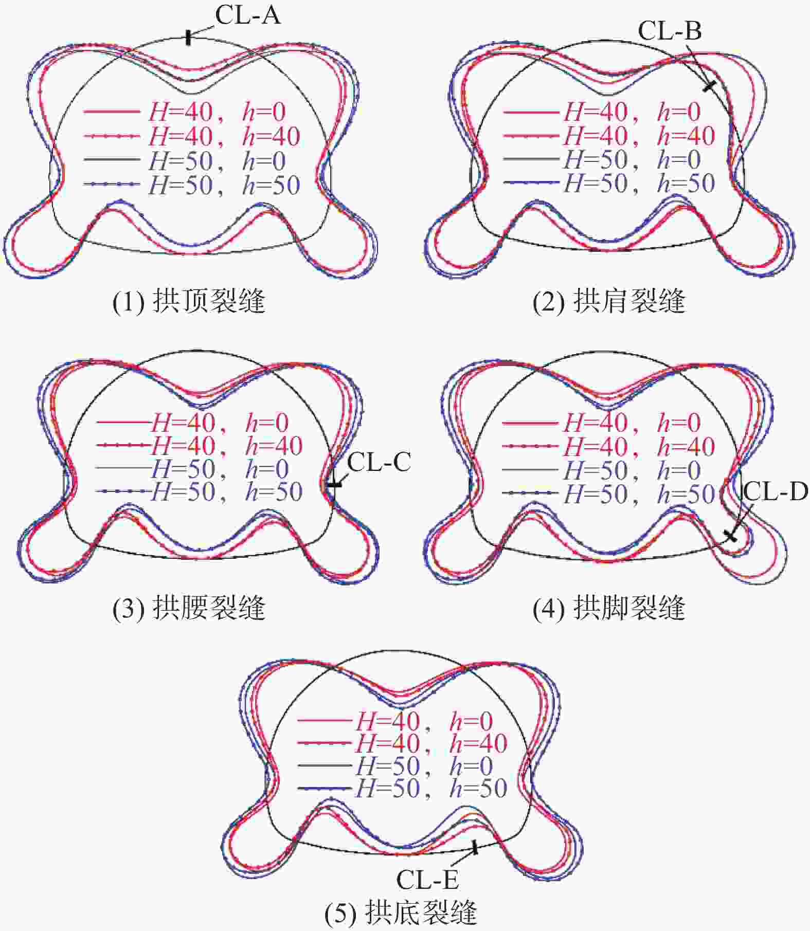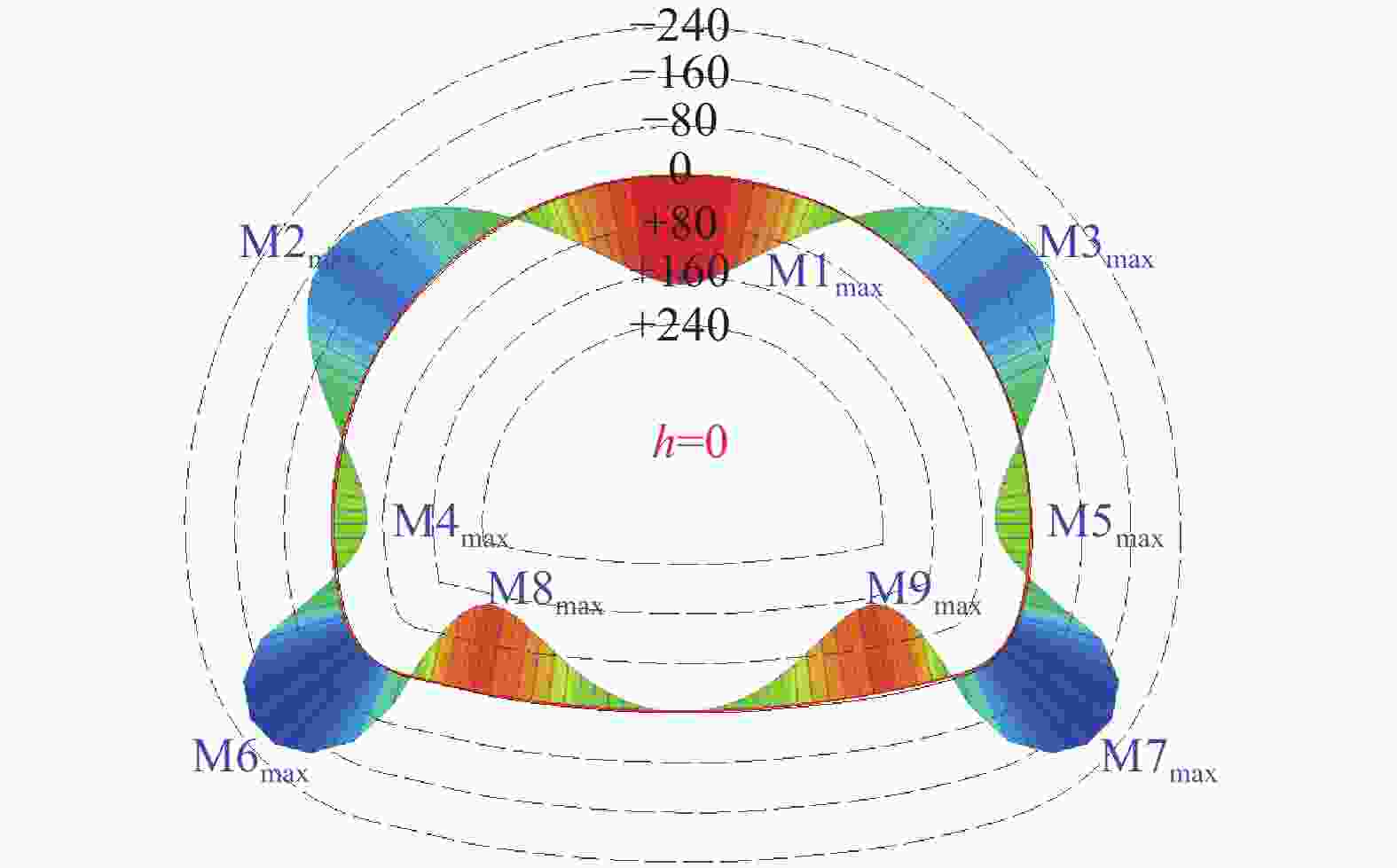 参数 数值 参数 数值 围岩重度/(kN·m−3) 19.5 弹性抗力系数/(MPa·m−1) 150 计算内摩擦角/(°) 45 隧道埋深/m 20 衬砌厚度H/cm 40,50 纵向计算长度/m 1 混凝土弹性模量Ec/GPa 30 钢筋弹性模量Es/GPa 210 混凝土泊松比ν 0.2 环向主筋配筋率/% 0.6 -