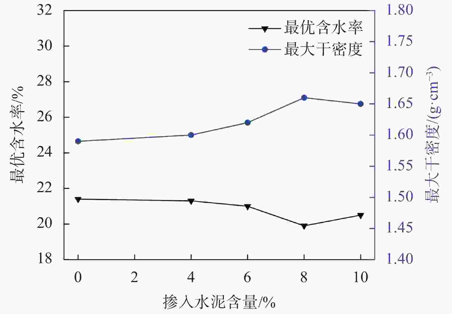 水泥掺入含量/% 比重 界限含水率试验 自由膨胀率/% 黏粒含量/% wL /% wP/% IP w10 /% I10 0 2.79 49.1 21.8 27.3 40.1 18.3 50 53.4 4 2.86 62.4 34.5 27.9 53.9 19.4 49 30.4 6 2.85 52.4 33.2 19.2 46.8 13.6 32 30.1 8 2.86 45.9 28.8 17.1 40.9 12.1 28 29.7 10 2.85 40.4 26.0 14.4 36.3 10.3 24 16.2 表 2 昔格达膨胀黏土岩改性前后的击实试验结果
