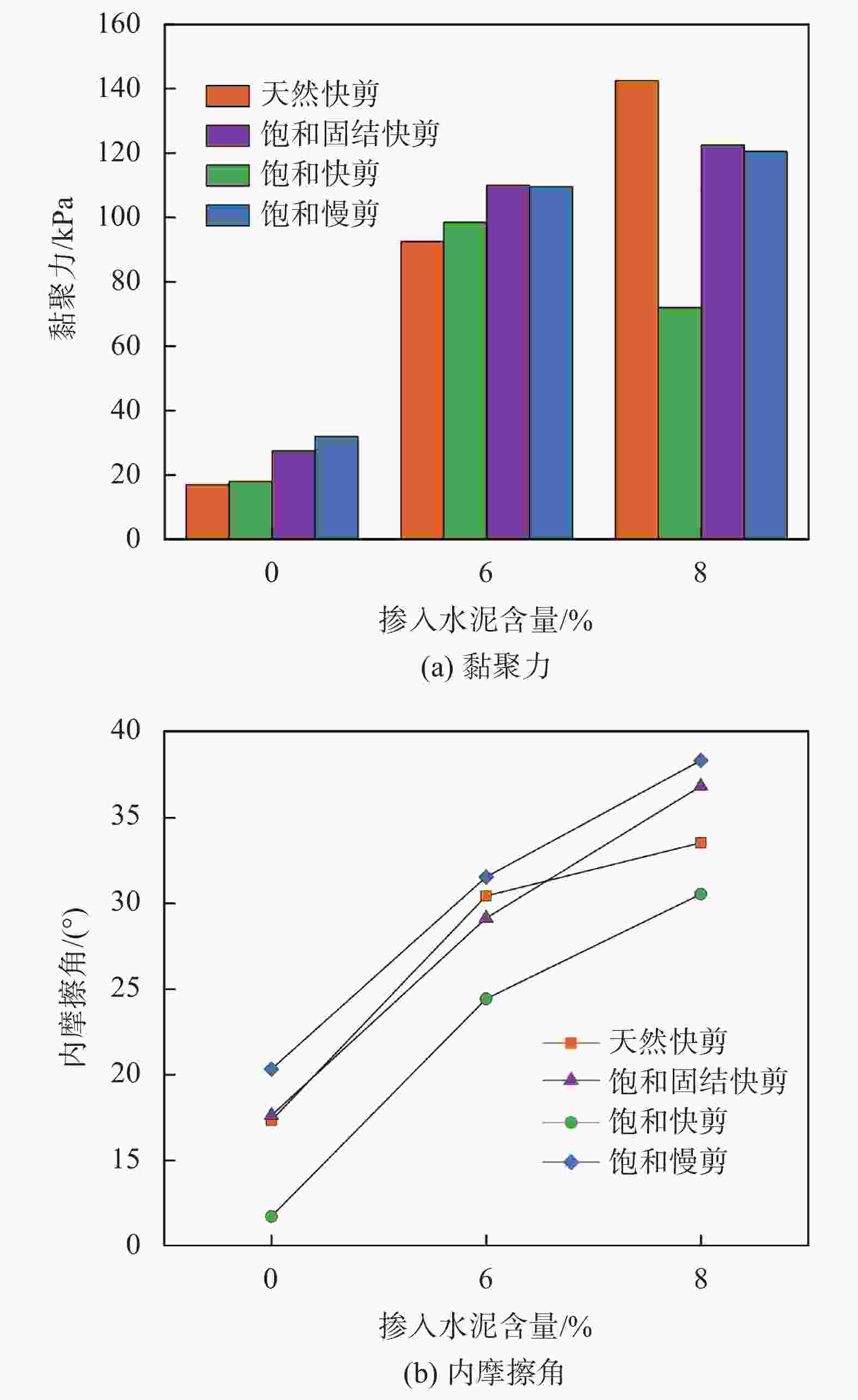 /MPa抗剪强度参数 天然快剪 饱和快剪 饱和固结快剪 饱和慢剪 c/kPa φ/(°) c/kPa φ/(°) c/kPa φ/(°) c/kPa φ/(°) 0 0.406 4.3 17.0 17.3 18.0 11.7 27.5 17.6 32.0 20.3 6 0.102 17.6 92.5 30.4 98.5 24.4 110.0 29.1 109.5 31.5 8 0.058 31.0 142.5 33.5 72.0 30.5 122.5 36.8 120.5 38.3 表 4 改性前后的收缩和无侧限抗压强度试验结果