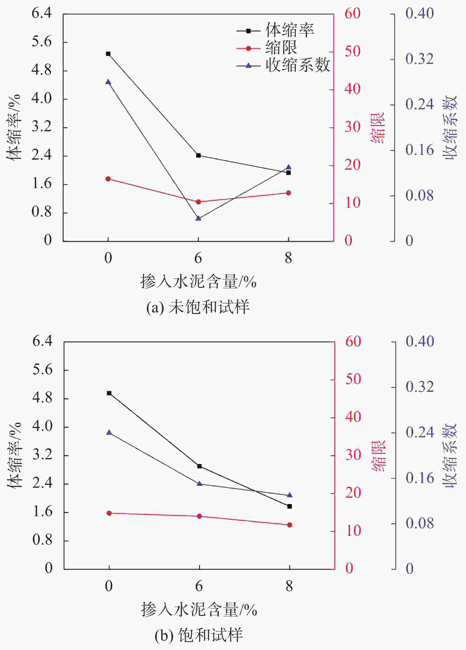 水泥掺入含量/% 最优含水率/% 最大干密度/(g·cm−3) 0 21.4 1.59 4 21.3 1.60 6 21.0 1.62 8 19.9 1.66 10 20.5 1.65 表 3 昔格达膨胀黏土岩改性前后的固结压缩和直接剪切试验结果