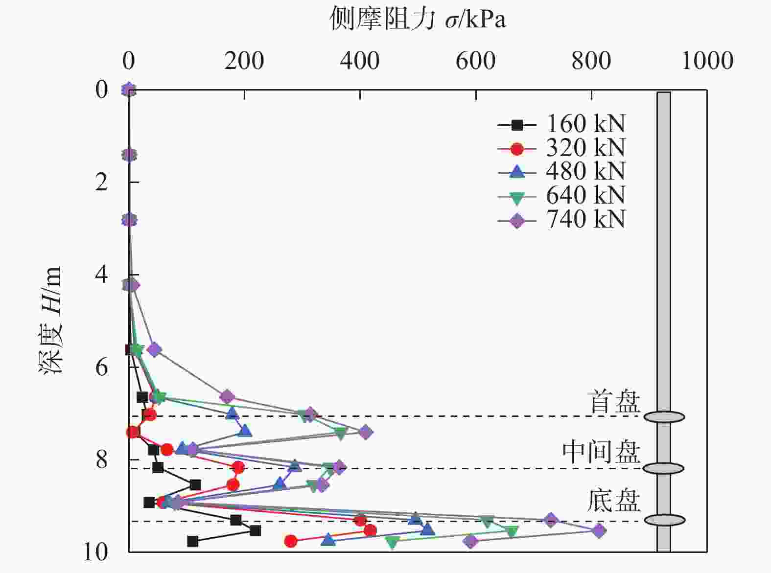 图  8  不同下压荷载下桩身侧摩阻力分布曲线