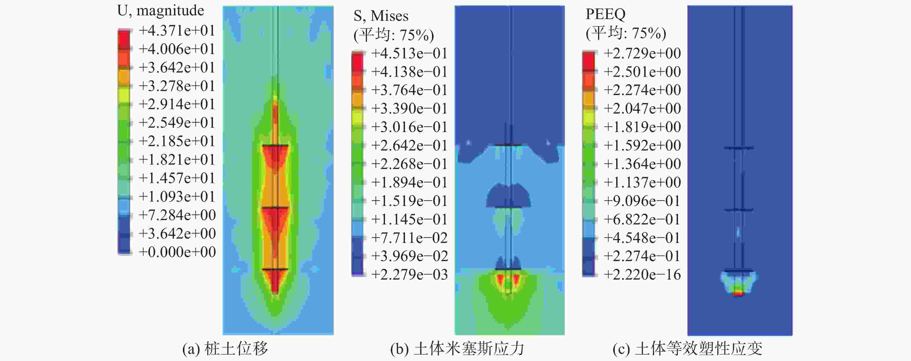 图  9  极限荷载作用下桩土位移、应力及等效塑性应变云图