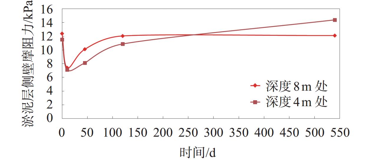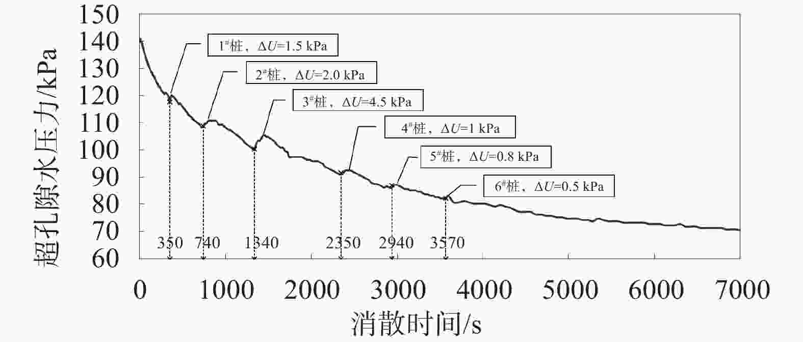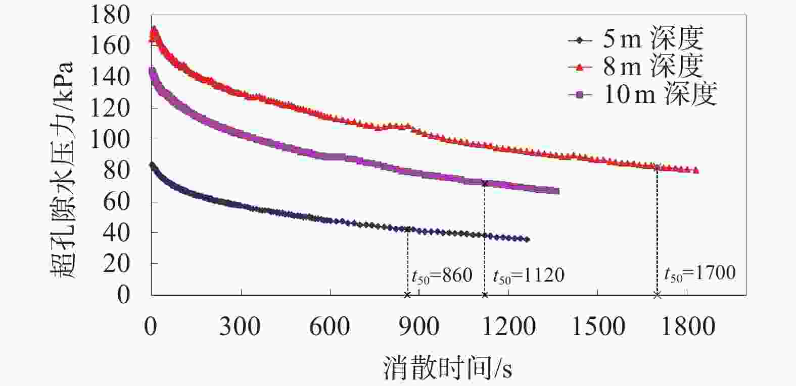 序号 测试点编号 对应桩径/mm 测试深度/m 对应土层 t50/s 对应时间段 计算水平固结系数Ch /(10−3 cm2·s−1) 1 CPTU1 400 5 淤泥 860 管桩施工前 0.250 8 淤泥 1120 管桩施工前 0.192 10 淤泥 1700 管桩施工前 0.126 2 CPTU2 400 5 淤泥 2640 管桩施工中 0.080 3 CPTU3 400 5 淤泥 9020 管桩施工中 0.024 4 CPTU4 400 5 淤泥 11880 管桩施工中 0.018 -