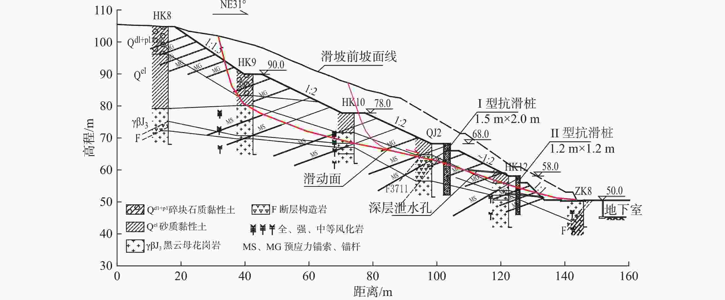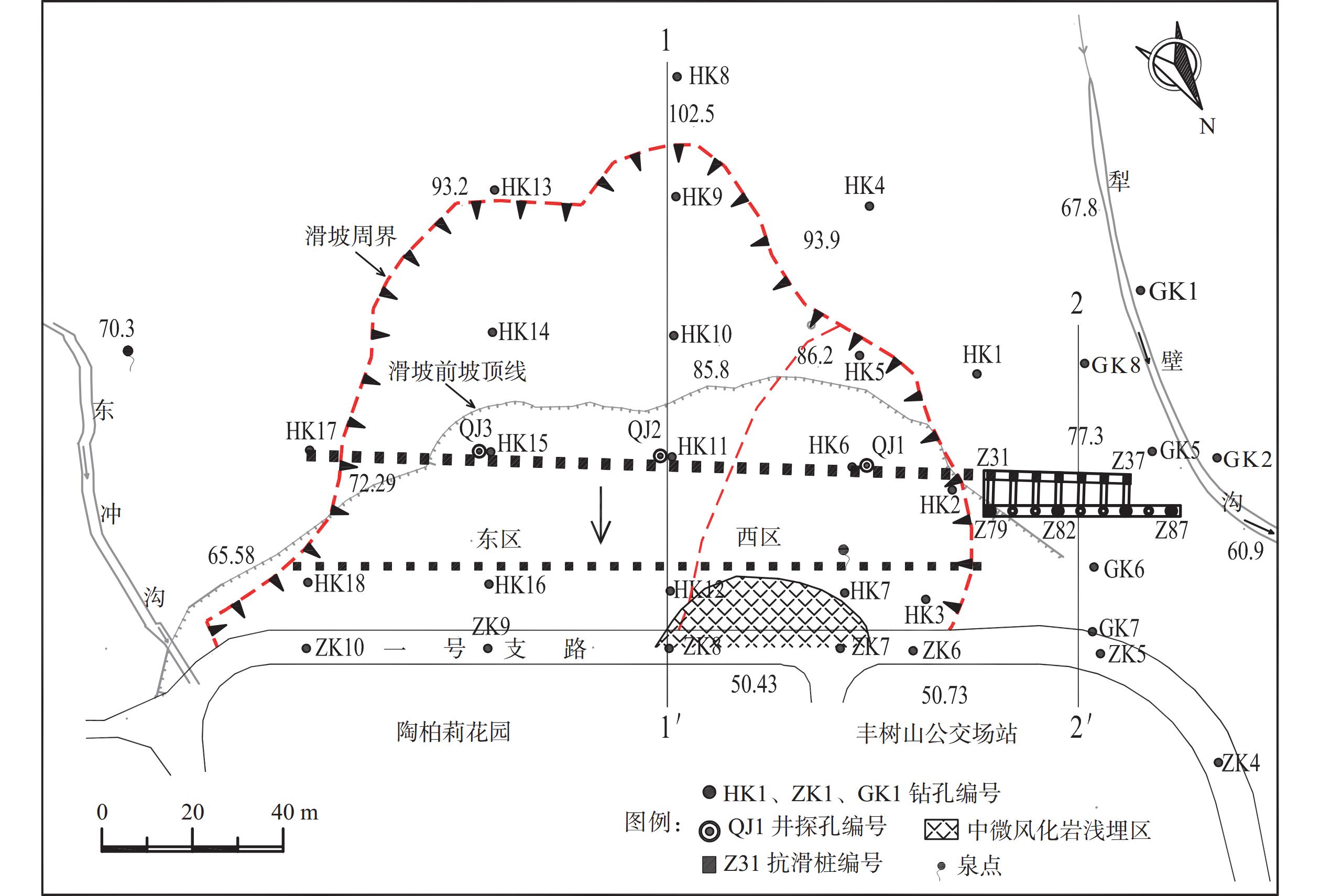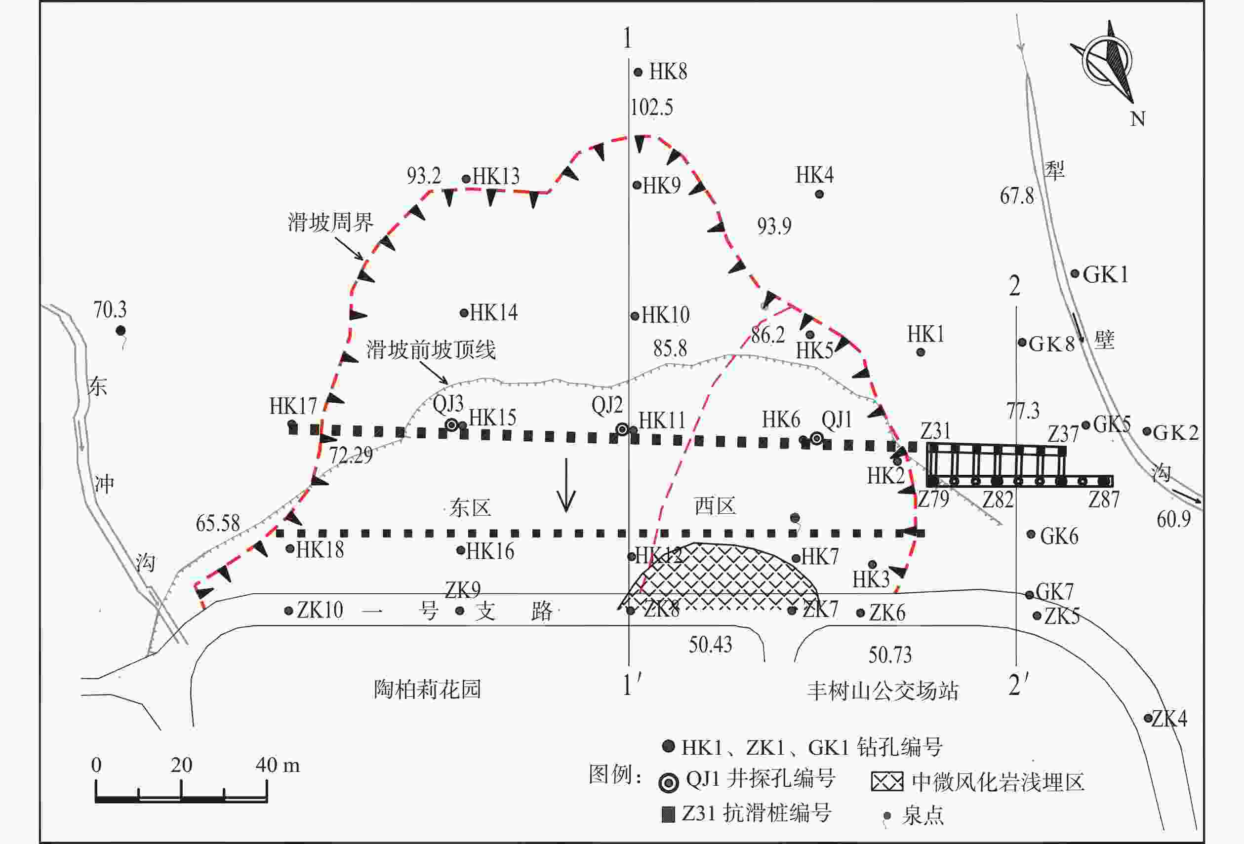 摘要: 丰树山滑坡是一起因工程建设切坡引发的牵引式滑坡。通过地质调查、钻探、井探、土工试验以及综合分析等方法,查明了滑坡发育过程、滑坡的基本特征和断裂带的岩土特性,系统分析研究了滑坡稳定性和变形活动趋势,提出了削坡减载、设置抗滑桩+锚索(锚杆)框架梁联合支护结构、完善的截排水系统、坡面复绿综合治理措施。结果表明:研究区内地质条件复杂,断裂构造发育,构造带内地下水较发育,由断裂构造岩风化残积而成的粉质黏土力学性质软弱,是滑坡形成的重要条件;开挖坡脚、持续性强降雨是滑坡形成的主要诱因。研究成果可为城市地质调查、类似滑坡工程防治提供参考。Abstract: The Fengshushan landslide is a traction landslide caused by a cutting slope of engineering construction. Through geological survey, drilling, well exploration, soil test, and comprehensive analysis, the development process of landslide, the basic characteristics of landslide, and the geotechnical characteristics of fault zone were found out, and the stability and deformation trend of landslide were systematically analyzed. Comprehensive treatment measures such as cutting slope and reducing load, setting up the anti-slide pile and anchor cable (anchor rod) frame beam combined support structure, drainage system improvement, and slope greening were put forward. The results show that the geological conditions in the study area are complex, faults are developed and groundwater is abundant in the tectonic belt. The mechanical properties of the silty clay formed from the weathering of the fault structural rock are weak, which are the important conditions for the formation of landslides. Excavation of slope feet and continuous heavy rainfall are the main inducement of landslides. The research results provide a reference for urban geological surveys and similar landslide engineering prevention.