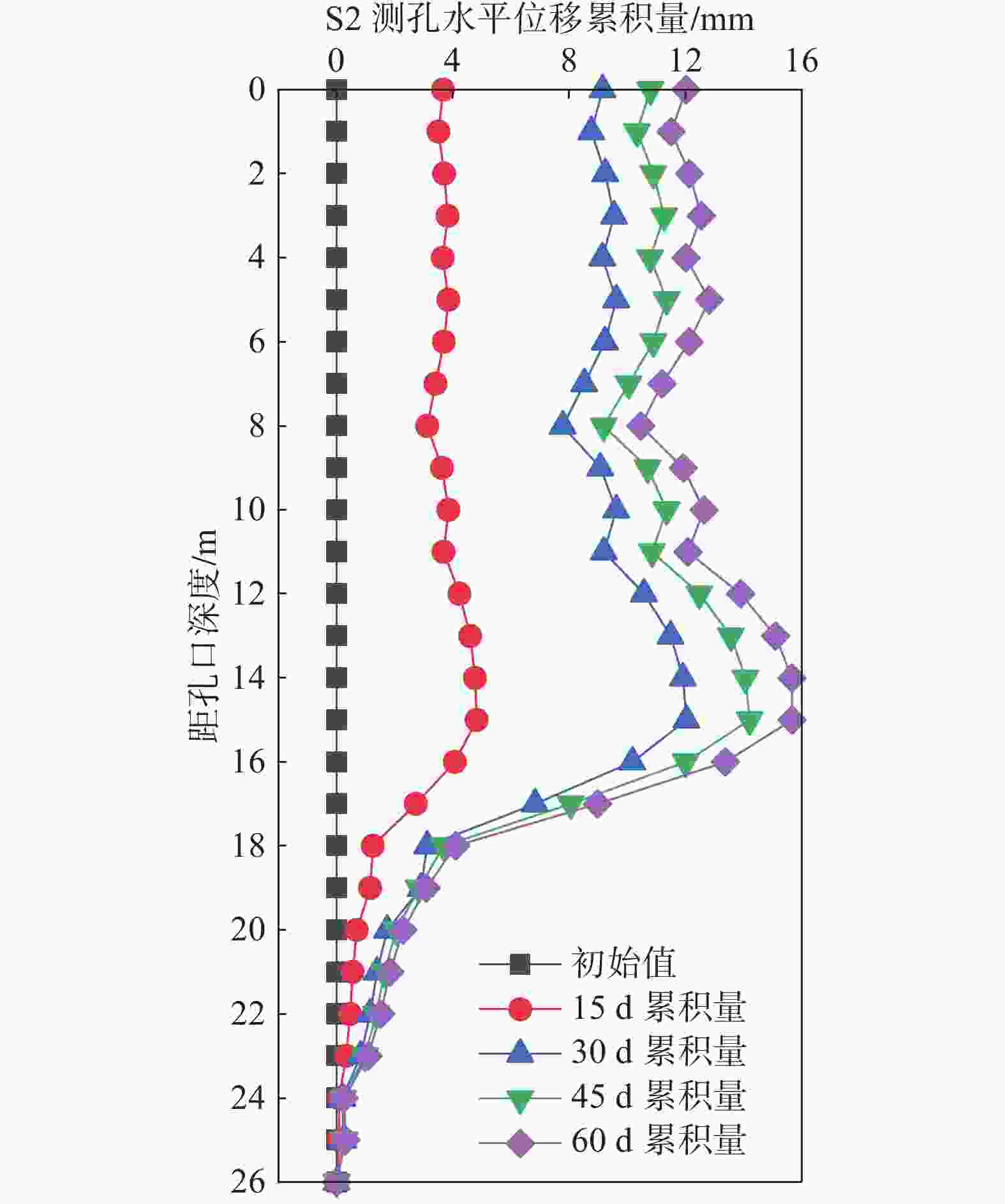 • 摘要: 贵阳某边坡工程受场地空间限制需直立开挖,因边坡上方邻近既有水厂建(构)筑物,需严格控制边坡变形,为此提出采用斜椅式桩锚支护体系。通过数值模拟分析了支护后边坡的稳定性、施工过程的位移控制以及支护结构的受力特征。结果表明,斜椅式桩锚支护体系受力合理、变形控制效果好。边坡监测结果显示,竣工后边坡各测点最大累计位移量均处于较小范围且趋于稳定,坡顶土体测斜曲线趋于收敛。东部水厂边坡工程竣工后运行状态良好,在满足场地空间的前提下,有效地保护了坡顶既有水厂的安全,所采用的斜椅式桩锚支护方案可供类似工程参考。