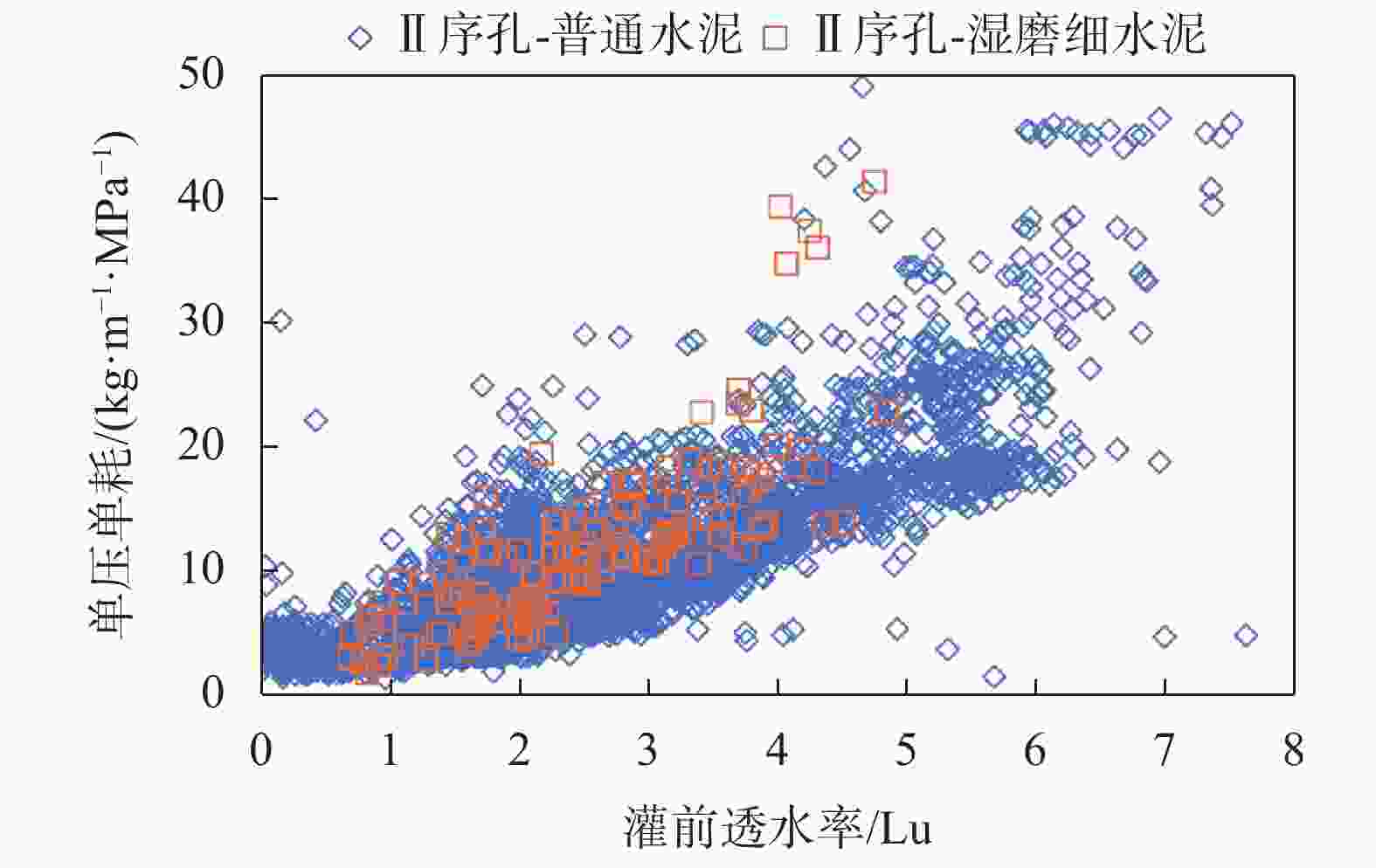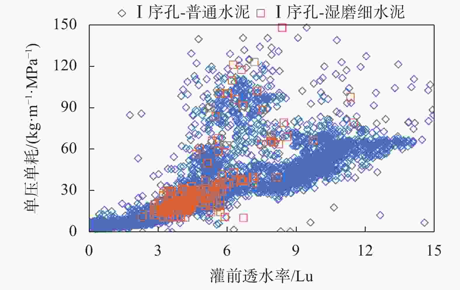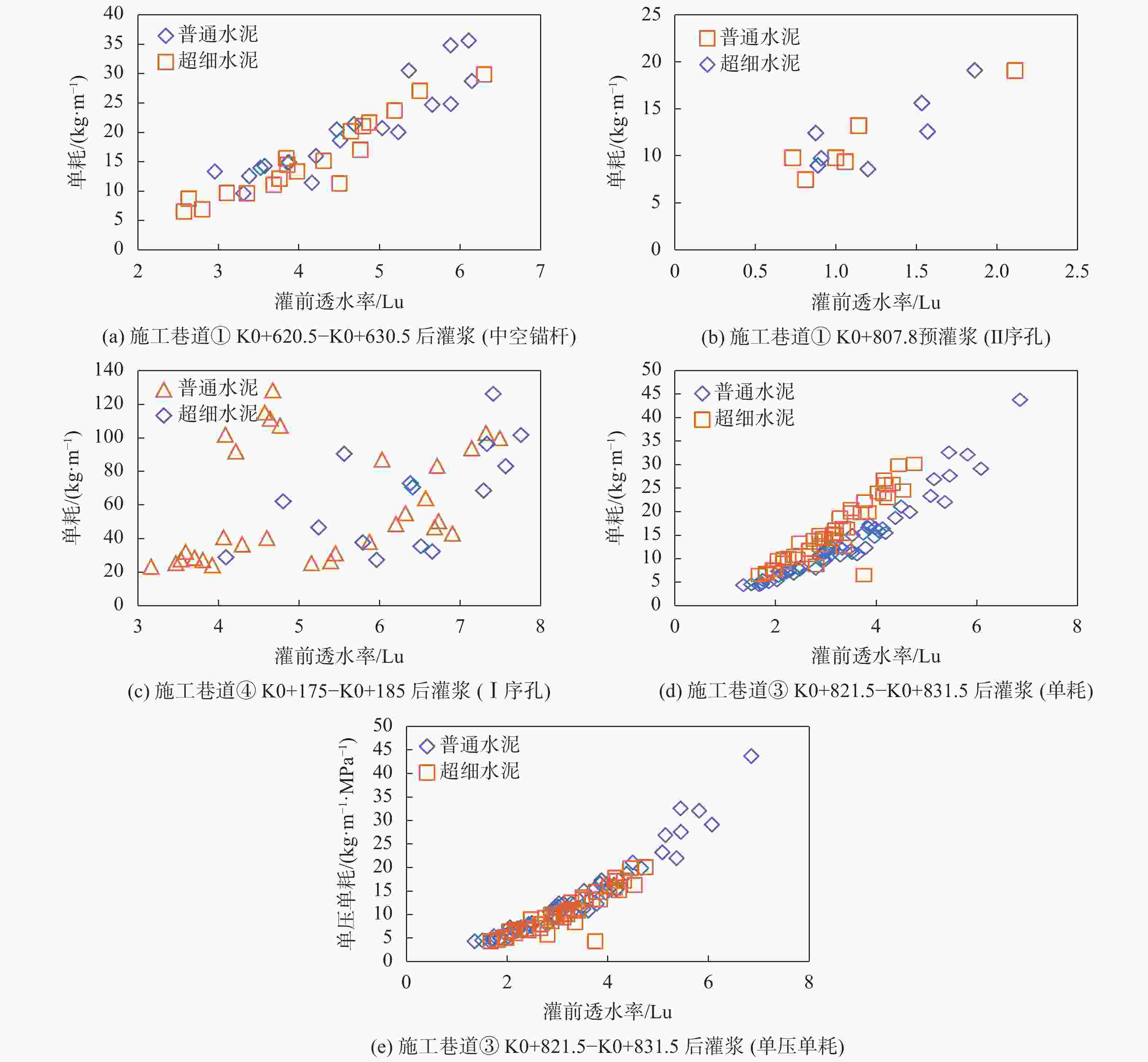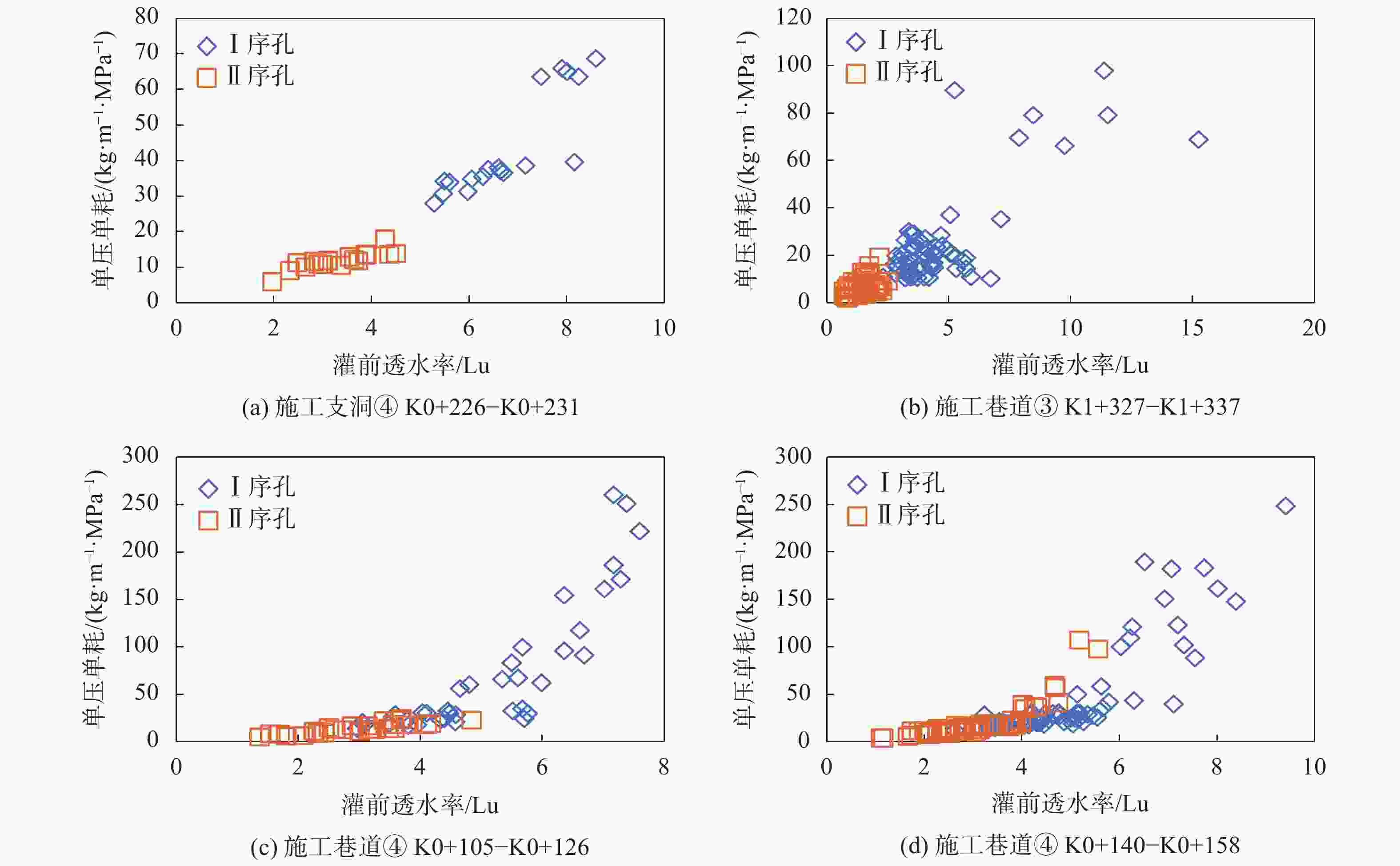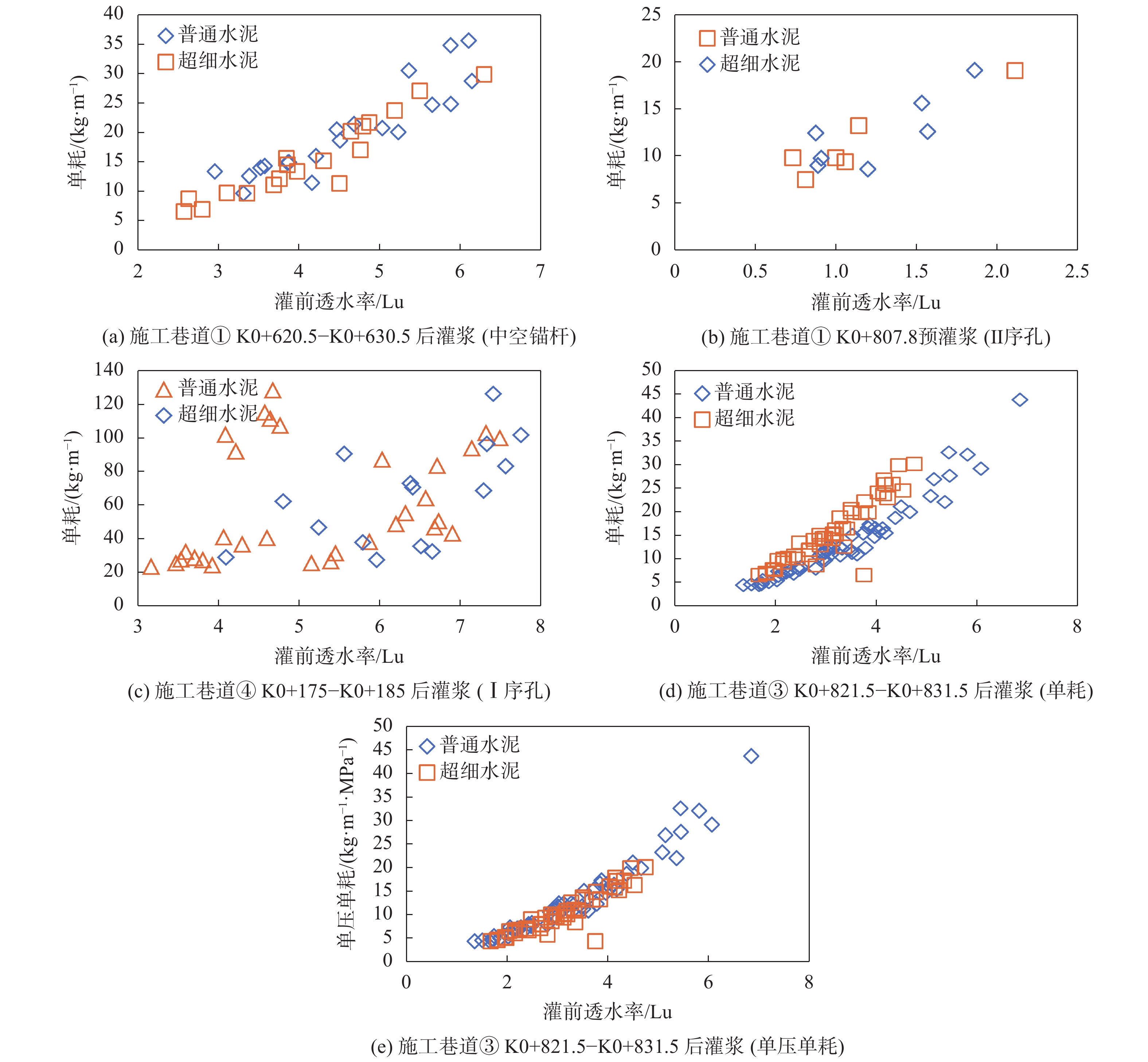 表 1 超细水泥灌浆试验灌浆孔信息表 序号 部位 孔序 围岩类型 孔数/个 孔深/m 灌浆压力/MPa 灌浆材料 1 施工巷道①K0+620.5—K0+630.5 Ⅲ2 18 4.5 1.5 普通水泥 Ⅲ2 22 4.5 1.5 超细水泥 2 施工巷道①K0+807.8 Ⅱ Ⅲ2 7 15 2.2 普通水泥 Ⅱ Ⅲ2 7 15 2.2 超细水泥 3 施工巷道④K0+175—K0+185 Ⅰ Ⅲ2 31 6 1.05 普通水泥 Ⅰ Ⅲ2 15 6 1.05 超细水泥 4 施工巷道③K0+821.5—K0+831.5 Ⅰ Ⅲ2 55 6 1.0 普通水泥 Ⅱ Ⅲ2 44 6 1.5 超细水泥 表 2 湿磨细水泥灌浆试验灌浆孔信息表 序号 部位 孔序 孔数