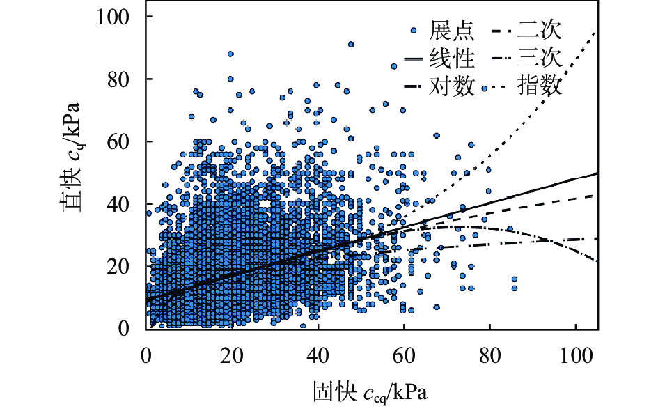 序号 地层 线性回归公式 R2 1 4-1 φcq = 0.37·φq+13.43 0.41 ccq = 0.23·cq+15.88 0.23 2 6-1 φcq = 0.35·φq+15.15 0.42 ccq = 0.13·cq+14.23 0.21 3 6-4 φcq = 0.35·φq+14.68 0.41 ccq = 0.22·cq+14.10 0.29 4 7-1 φcq = 0.21·φq+17.32 0.24 ccq = 0.15·cq+16.18 0.34 5 8-1 φcq = 0.25·φq+17.21 0.26 ccq = 0.25·cq+15.38 0.23 表 3 天津地区粉质黏土层剪切指标统计结果
