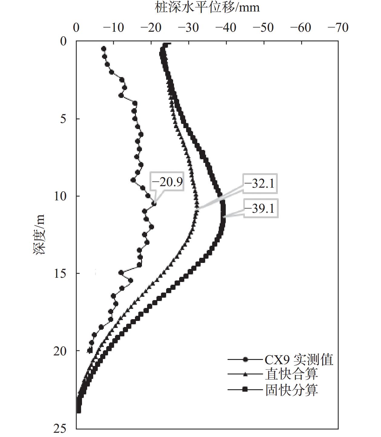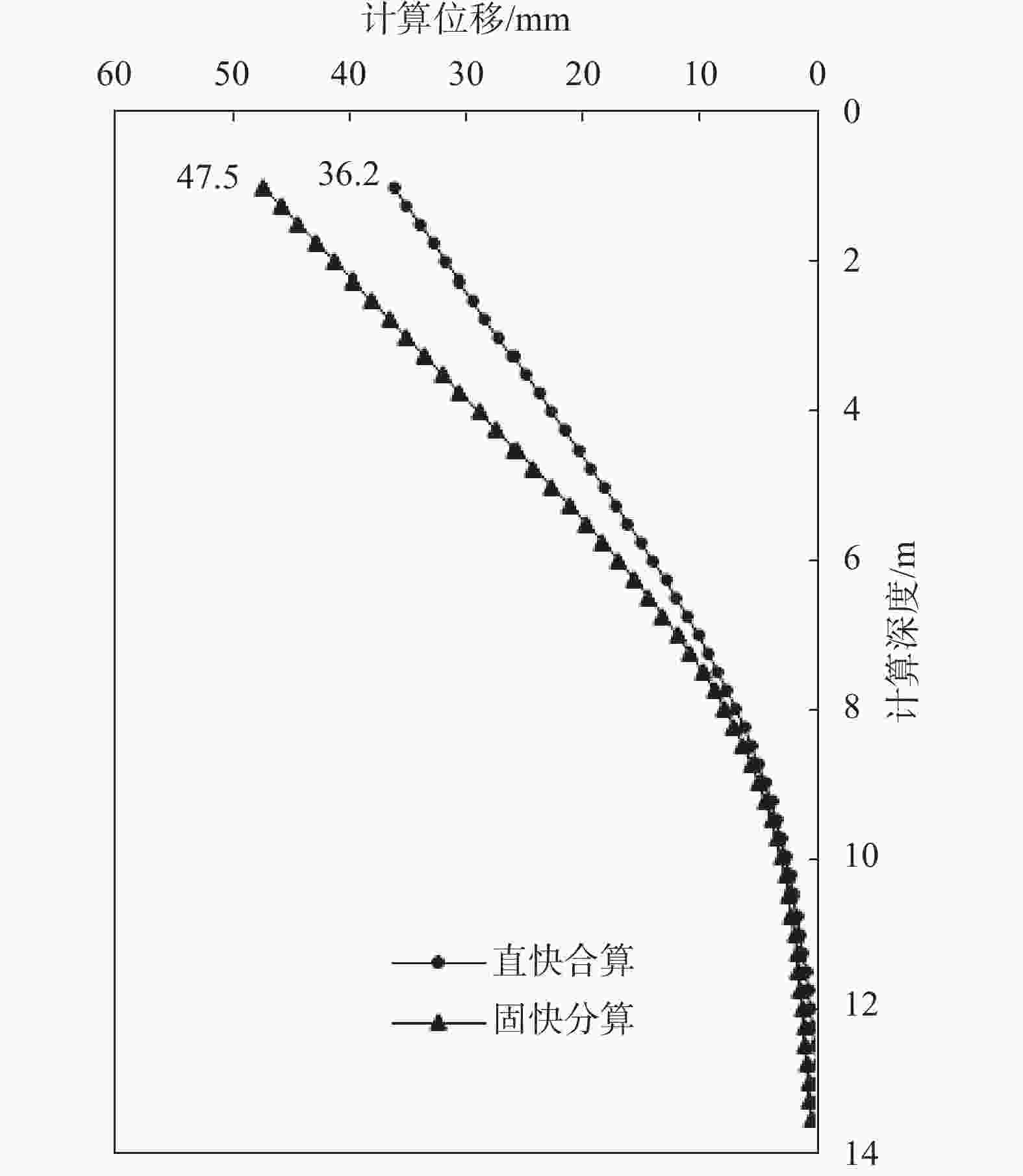层号 统计项目 cq/kPa φq/(°) ccq/kPa φcq/(°) 4-1 最小值 8.00 10.30 9.00 11.80 最大值 20 22 22 24 标准值 13.69 15.81 15.04 18.08 变异系数 0.224 0.179 0.234 0.174 子样数 2875 2875 3966 3966 6-1 最小值 8 12 9 15.1 最大值 17 26.4 20.5 28.5 标准值 12.54 19.36 13.82 22.08 变异系数 0.204 0.195 0.209 0.159 子样数 2770 2770 3837 3837 6-4 最小值 6 12.5 9 13 最大值 22 25 24 27 标准值 12.91 19.48 14.65 20.99 变异系数 0.281 0.161 0.244 0.153 子样数 2515 2515 3447 3447 7-1 最小值 6 11.6 9 14.0 最大值 21 26.1 24 28.0 标准值 14.17 15.92 15.23 21.16 变异系数 0.266 0.183 0.249 0.169 子样数 948 948 1575 1575 8-1 最小值 8 12.60 10 14.5 最大值 22 24.70 26 28.0 标准值 14.04 17.69 15.56 20.85 变异系数 0.233 0.192 0.244 0.177 子样数 2625 2625 5521 5521 表 4 典型工程案例粉质黏土水土分算、水土合算计算结果