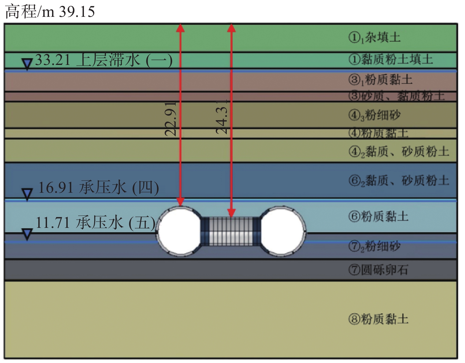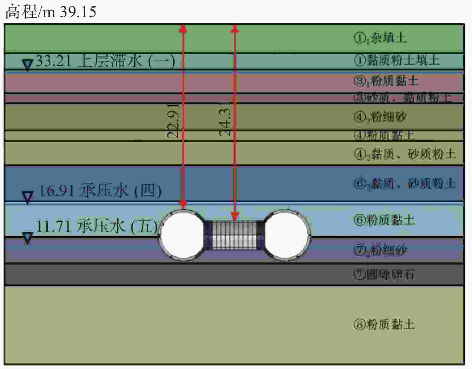 $\rho $/(kg·m−3)①1杂填土 15 0.25 0 10 1600 ①黏质粉土填土 13 0.26 8 10 1650 ③1粉质黏土 4.8 0.34 29 14 1860 ③砂质、黏质粉土 10 0.23 13 26 2000 ④3粉细砂 30 0.29 0 28 2050 ④粉质黏土 9.2 0.43 26 15 2010 ④2黏质、砂质粉土 13 0.26 15 25 2060 ⑥2黏质、砂质粉土 17.3 0.29 14.5 26 2050 ⑥粉质黏土 11.9 0.26 27 15 1980 ⑦2粉细砂 35 0.28 0 30 2050 ⑦圆砾卵石 55 0.23 0 40 2150 ⑧粉质黏土 15.8 0.31 28 16 1950 表 2 材料力学性能
