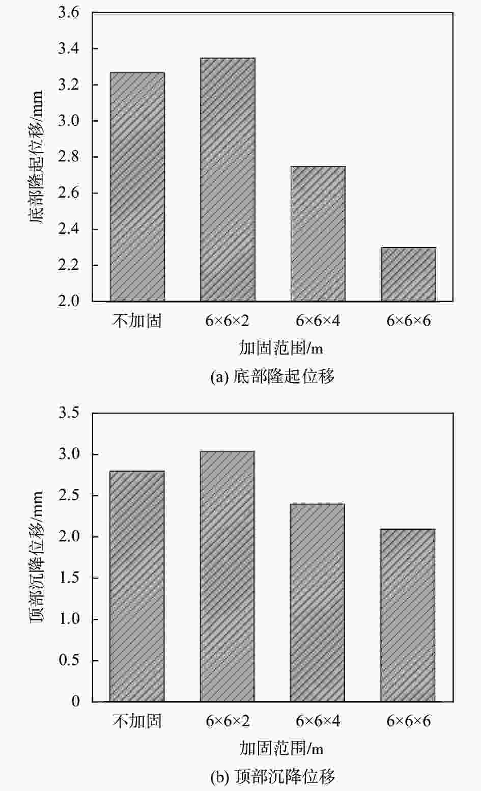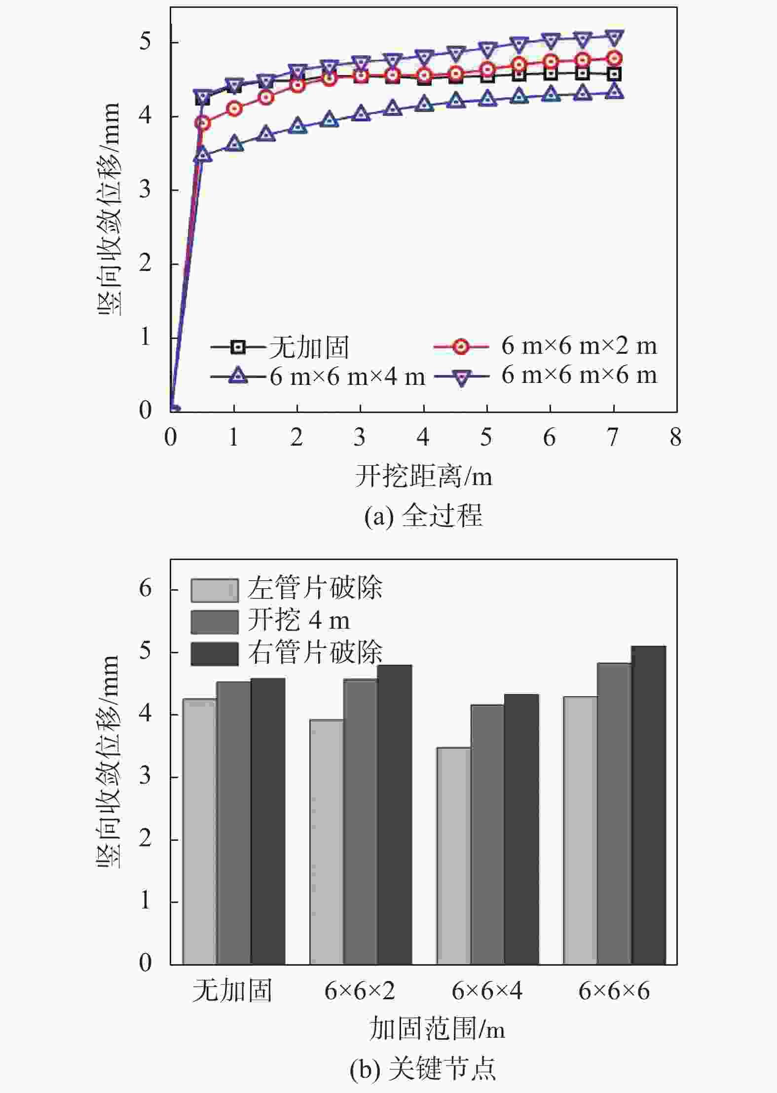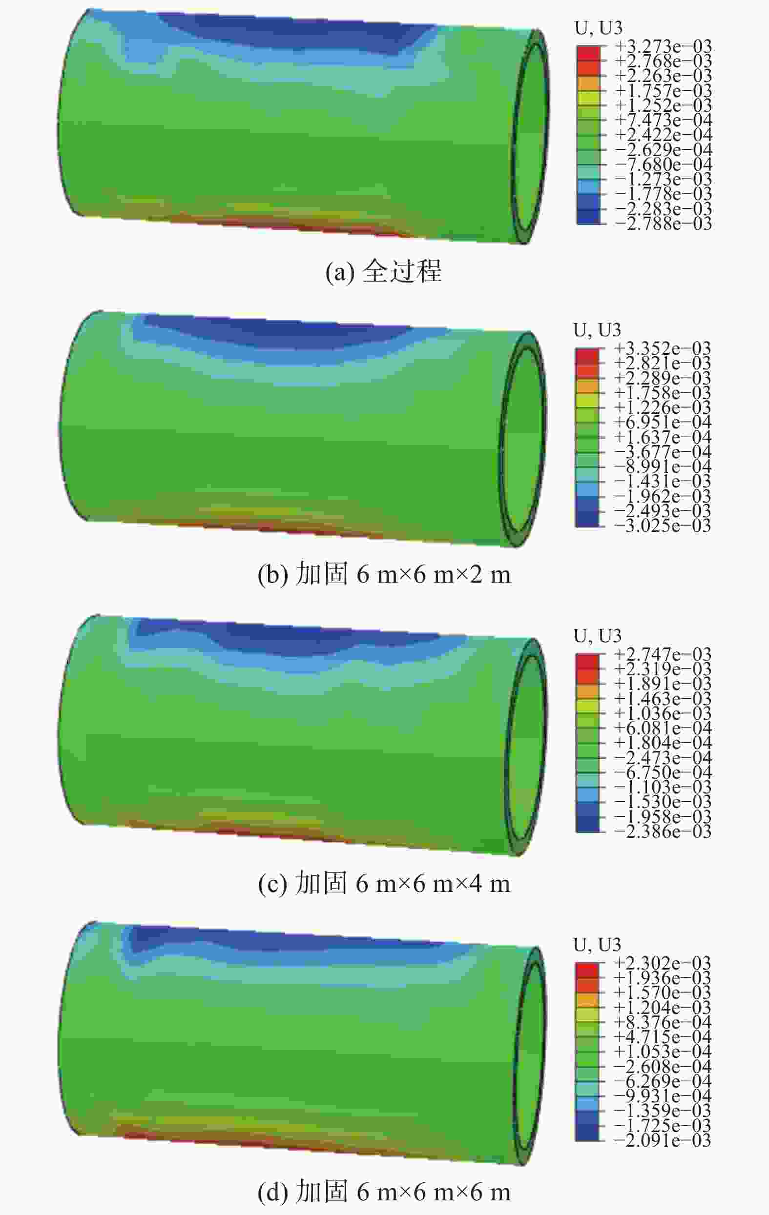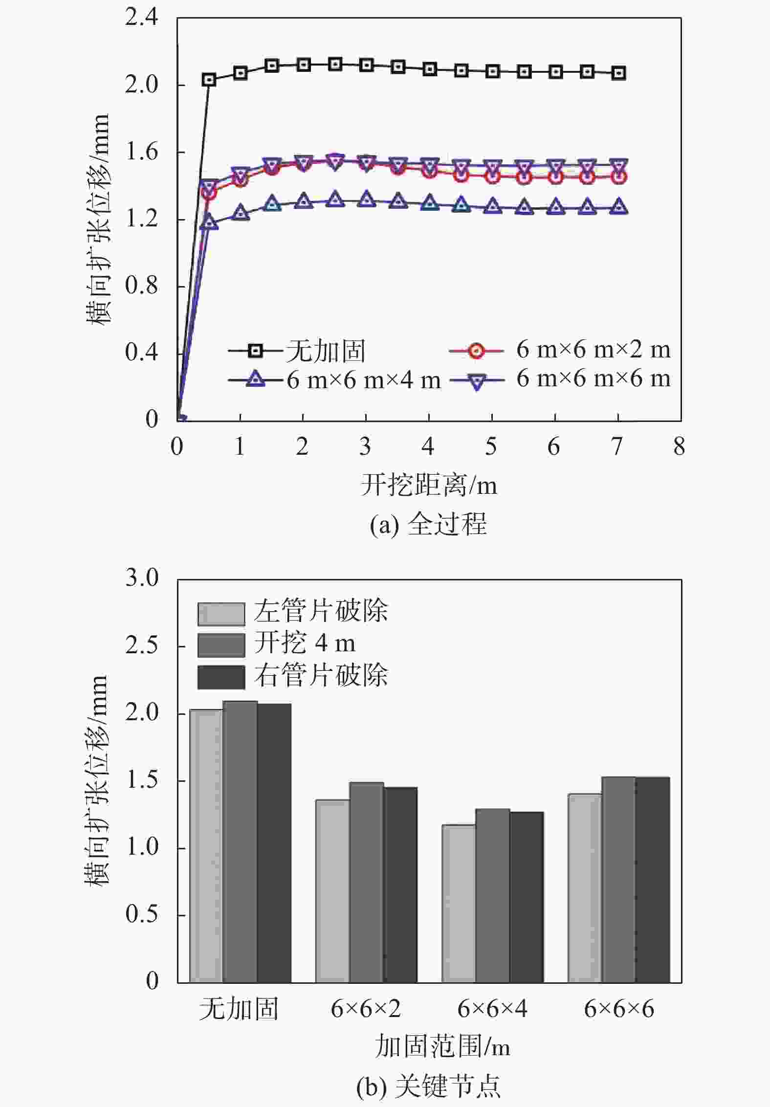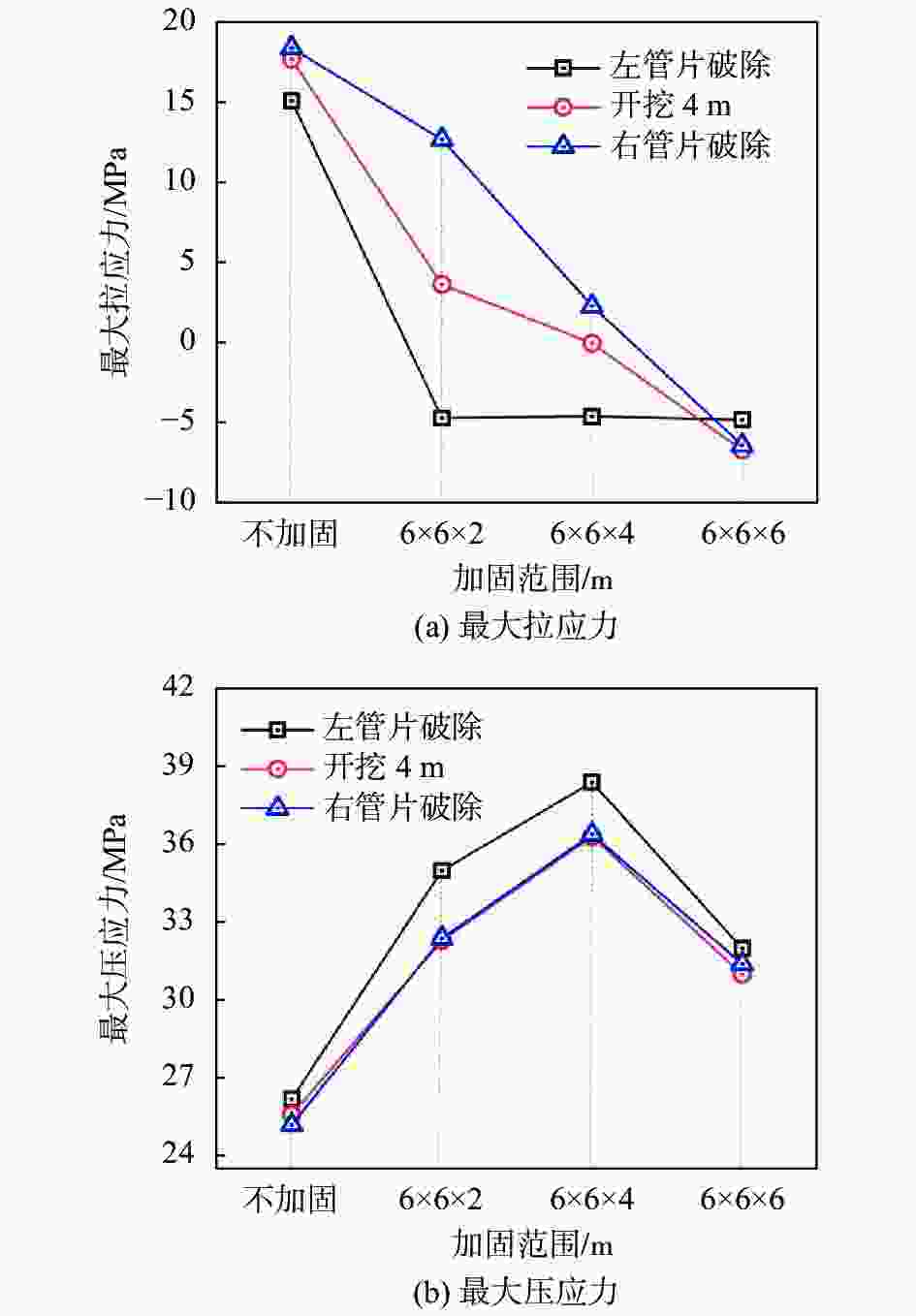 摘要: 深入研究了地铁盾构隧道联络通道施工过程中地层加固范围对主隧道的影响规律。通过数值模拟的方法,全面分析了地层加固范围对主隧道管片总体变形、特殊管片应力及位移、特殊与普通管片间螺栓受力状态等力学行为的影响规律。研究结果表明:(1)进行地层加固可显著降低特殊管片最大拉应力,但会导致其最大压应力明显增大,同时对横向扩张位移与竖向收敛位移控制效果有限;(2)适当地进行地层加固可明显降低螺栓最大拉应力,大幅降低横通道的顶部沉降位移,小幅减小底部隆起位移,有利于横通道整体变形控制;(3)当地层加固范围过大时,螺栓最大拉应力出现显著回升,综合考虑经济性、施工效果等因素,应避免通长加固。Abstract: The influence caused by the reinforcement range of the connecting passage on the main tunnel during the construction process of the connecting passage of subway shield tunnels was investigated. Through numerical simulation, the influence of the reinforcement range of the stratum on the mechanical behavior of the main tunnel segment, such as the overall deformation of the main tunnel segment, the stress and displacement of the special segment, and the stress state of the bolts between the special and ordinary segments, was comprehensively analyzed. The results show that: (1) Ground reinforcement can significantly reduce the maximum tensile stress of special segments, but it will significantly increase the maximum compressive stress, and the control effect on lateral expansion displacement and vertical convergence displacement was limited. (2) Proper reinforcement can significantly reduce the maximum tensile stress of the bolt, greatly reduce the top settlement displacement of the transverse channel, and slightly reduce the bottom uplift displacement, which is conducive to the overall deformation control of the transverse channel. However, when the reinforcement range is too large, the maximum tensile stress of the bolt rises significantly. Considering the factors such as the economy and construction effect, full-length reinforcement should be avoided.