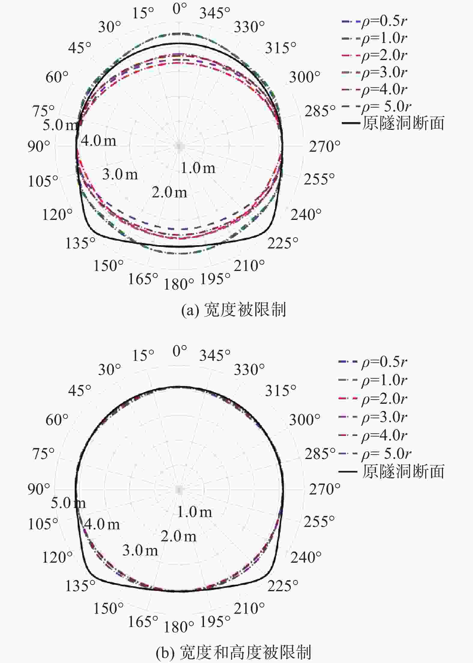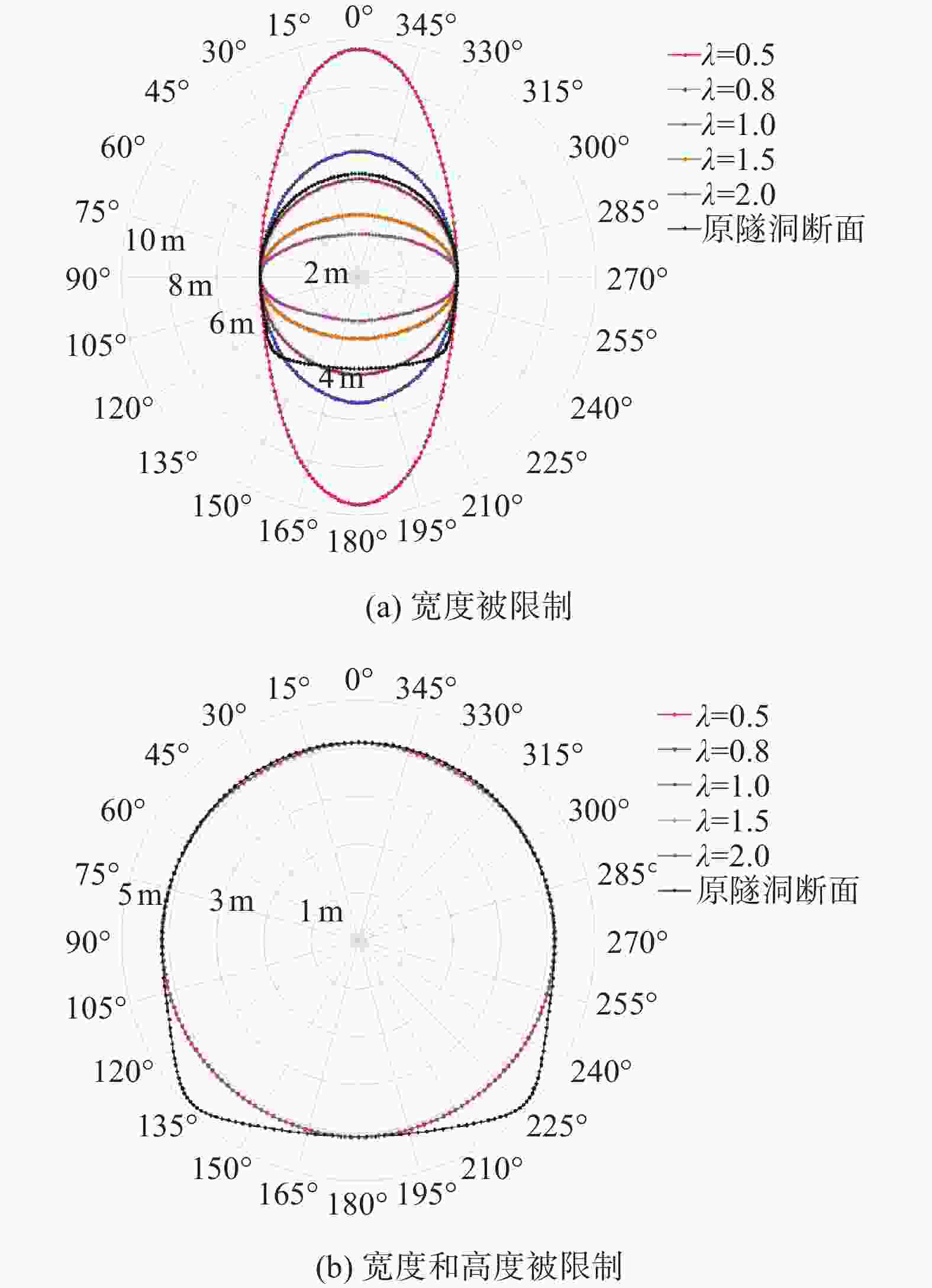 摘要: 隧洞断面形状的选型直接影响其围岩稳定性。基于复变函数理论和混合罚函数法,从隧洞围岩应变能分布与其病害之间的关系出发,提出了一种隧洞断面平均应变能最大达到最小化的断面形状优化准则,依托引汉济渭深部硬岩隧洞工程,研究了隧洞径向应变能计算范围与地应力对优化断面形状的影响。结果表明:采用提出的断面形状优化准则对深部马蹄形隧洞断面优化时,径向应变能计算范围取2.0倍隧洞最大半径以上即可。当隧洞断面宽度受限时,该优化准则可显著改善隧洞断面应变能的不均匀分布,且侧压力系数对优化断面形状及其围岩平均应变能整体分布值的影响也较大。当隧洞断面宽度和高度受限时,该优化准则对改善隧洞断面应变能不均匀分布作用有限,且侧压力系数对其优化断面形状的影响也较小,但对其围岩平均应变能整体分布值影响较大。Abstract: The selection of tunnel section shape directly affects the stability of its surrounding rock. Based on the complex variable function theory and the mixed penalty function method, a shape optimization criterion was proposed that the maximum average strain energy of the tunnel reached the minimum from the perspective of the relationship between the strain energy distribution of the tunnel and its failure characteristics. Combined with the engineering geological data of the deep hard rock tunnel from Hanjiang River to Weihe River, the effects of the radial strain energy calculation range and ground stress on the optimized tunnel section shape were investigated. The results show that: when using the shape optimization criteria developed to optimize the deep horseshoe tunnel, the radial strain energy calculation range should exceed 2.0 times the maximum tunnel radius. For tunnels with limited section width, the criterion significantly improved the uneven strain energy distribution, and the lateral pressure coefficient exhibited a stronger influence on the optimized section shape and overall distribution of surrounding rock average strain energy. When the width and height of the tunnel section are limited, this optimization criterion has limited effect on improving the uneven distribution of the surrounding rock strain energy of the tunnel, and the lateral pressure coefficient has little effect on the optimized section shape, but has a greater impact on the overall distribution of the surrounding rock average strain energy.