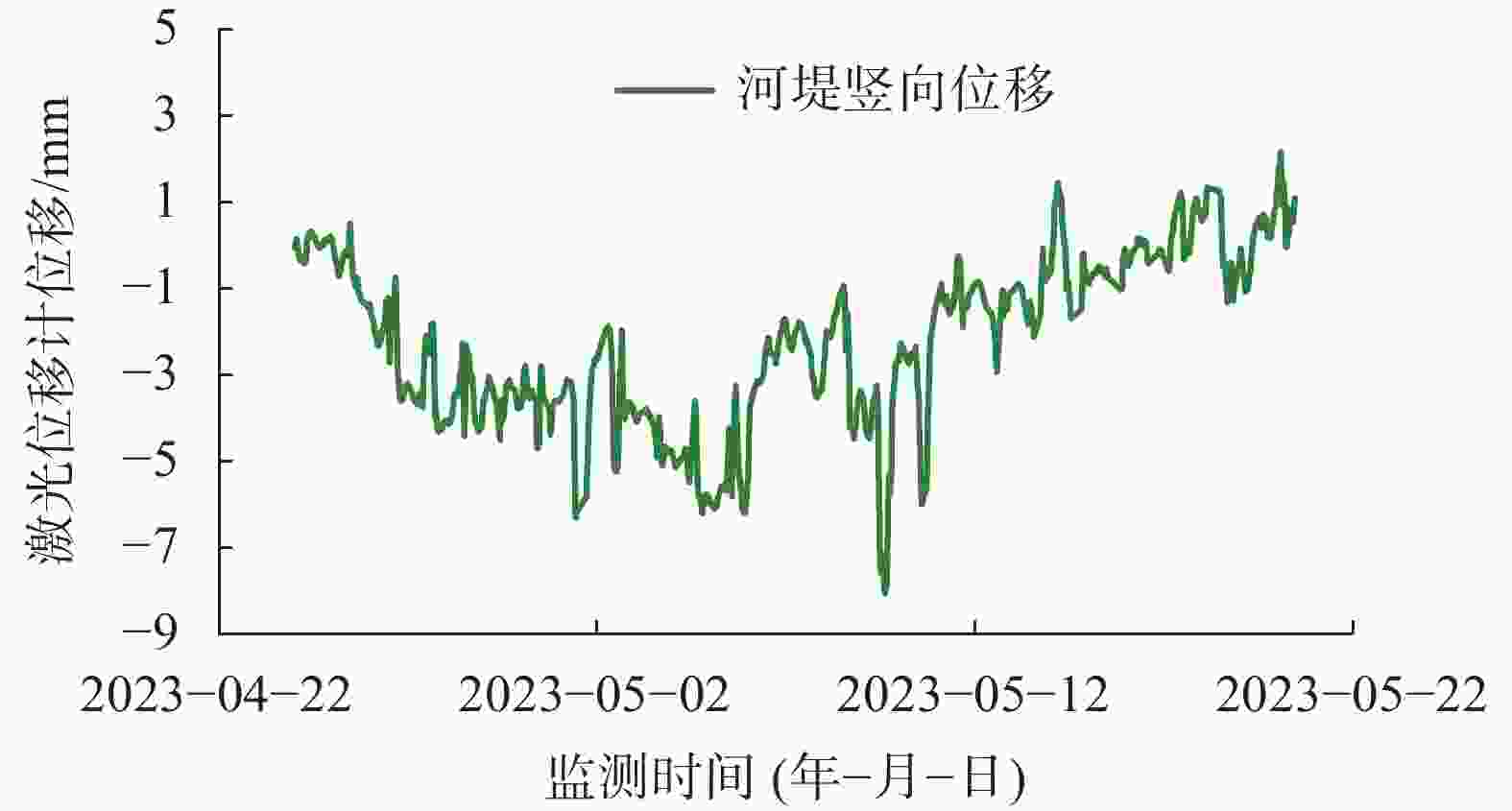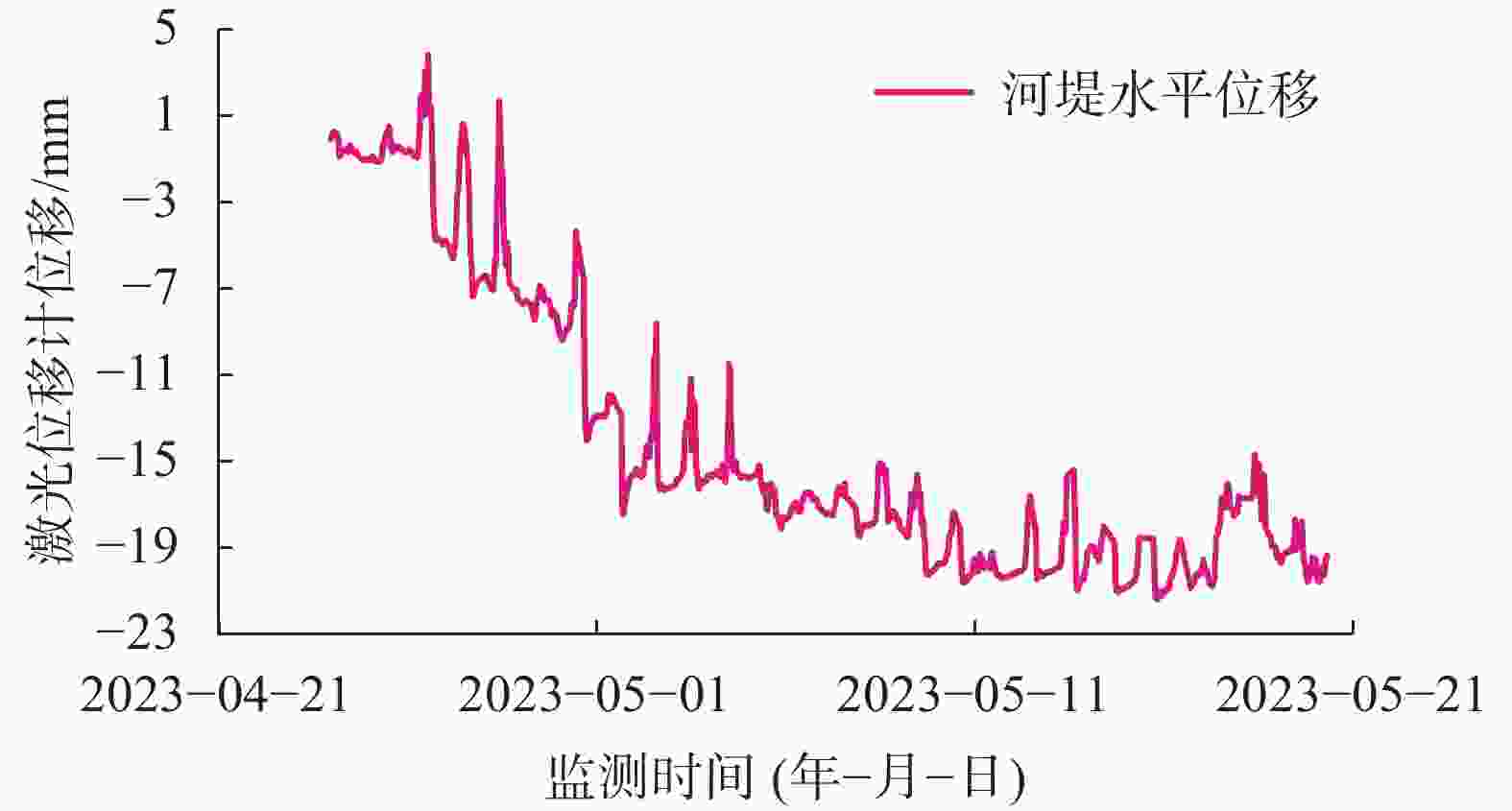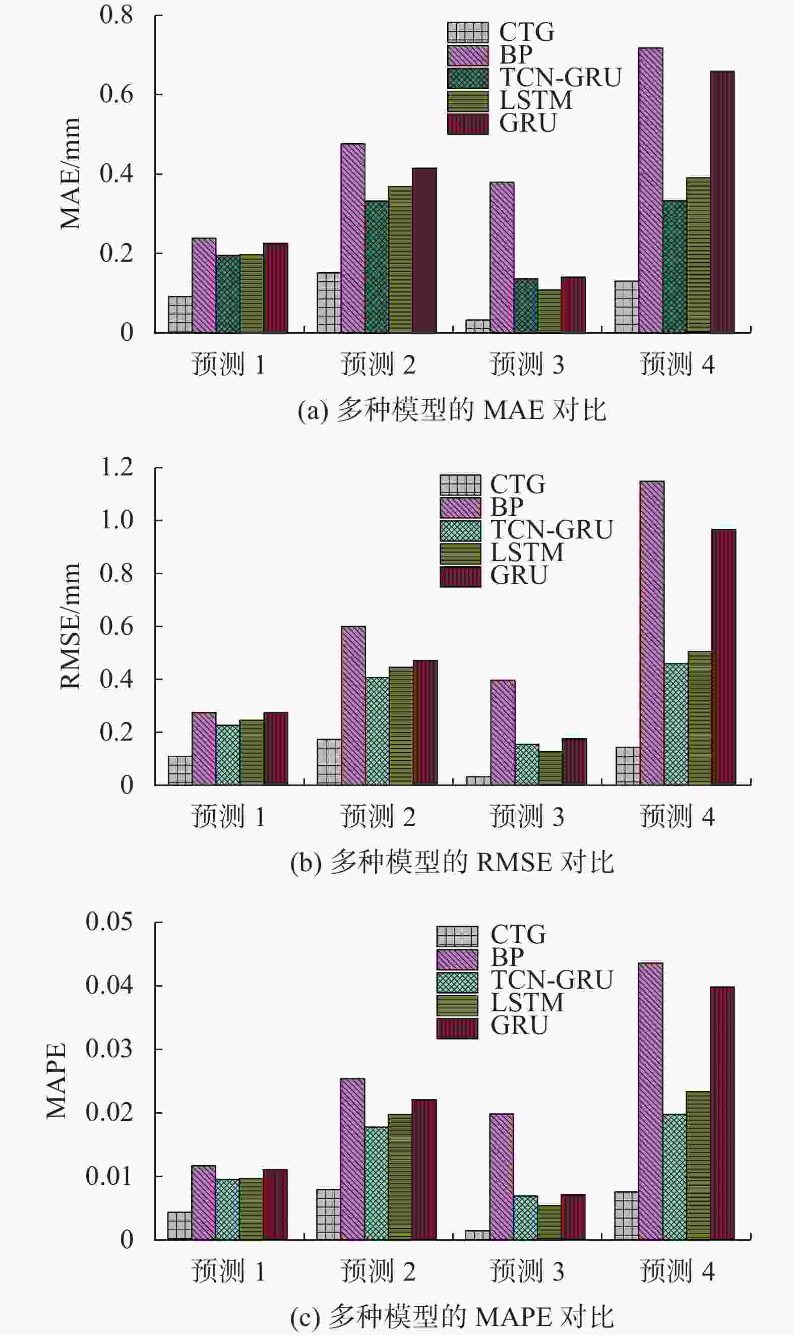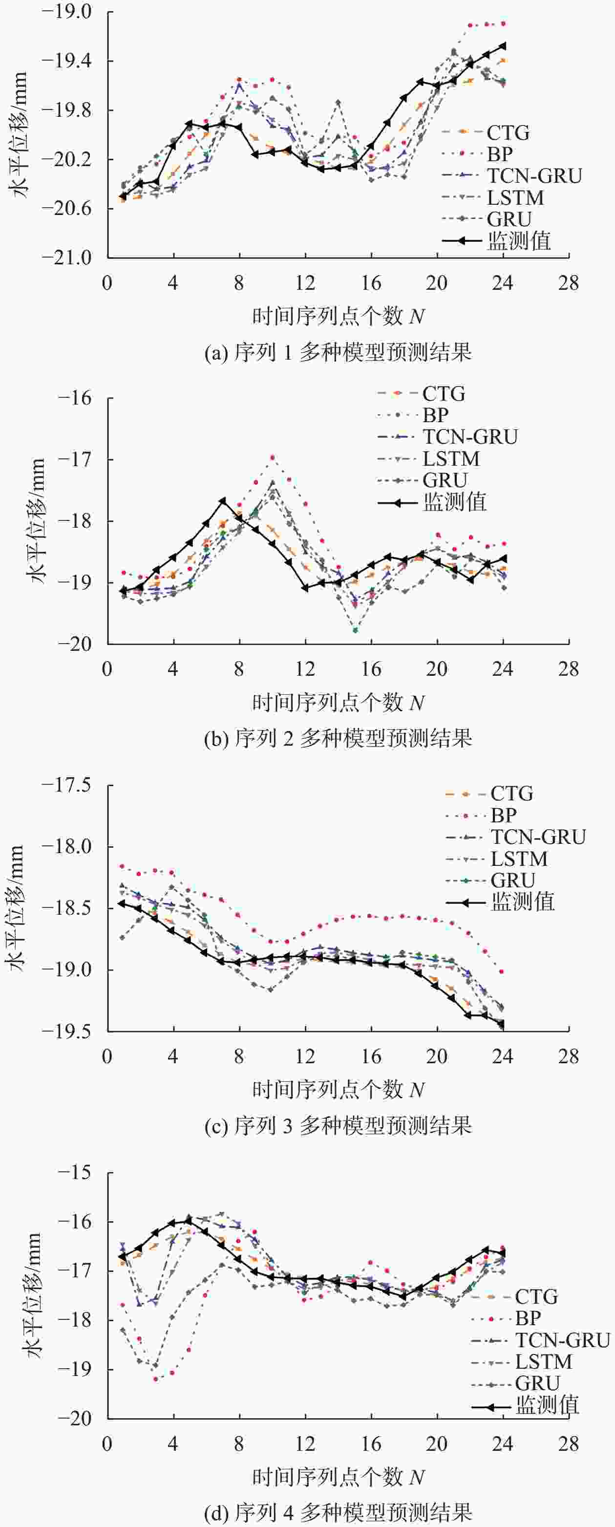 表 1 水平位移趋势项模型预测参数 参数 a0 a1 a2 a3 a4 a5 值 −9.34 1.89×10−3 −1.56×10−5 9.08×10−9 −1.52×10−12 0 表 2 各类模型预测误差 模型 预测1 预测2 预测3 预测4 本文 0.0047 0.0083 0.0018 0.0079 BP 0.0121 0.0258 0.0202 0.0440 GRU 0.0099 0.0181 0.0073 0.0202 LSTM 0.0101 0.0201 0.0058 0.0237 TCN-GRU 0.0115 0.0225 0.0076 0.0402