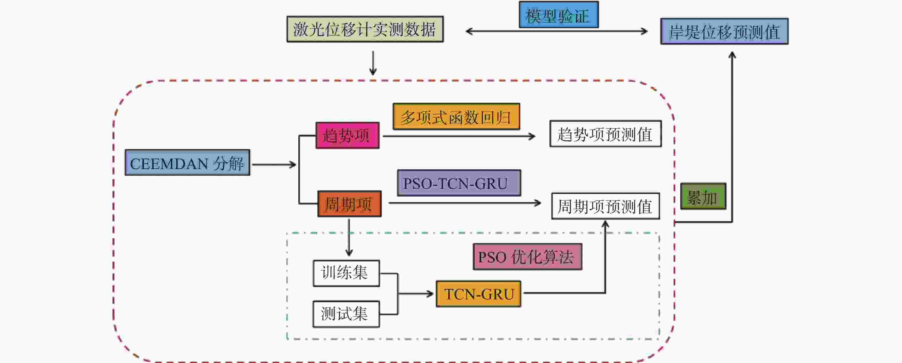 摘要: 过江顶管由于施工作业面较小,江边堆填荷载较大,影响江堤稳定性,提前预测江堤位移对安全施工具有重要意义。通过自适应噪声的完备集合经验模态分解方法(CEEMDAN),将非线性非稳定性的监测数据分解为趋势项和周期项,提出一种适合于江堤变形的智能预测模型(CTG)。模型针对趋势项采用多项式函数预测;针对周期项,采用结合粒子群优化算法和时间卷积网络−门控循环单元混合模型的PSO-TCN-GRU算法进行预测。将算法应用于段塘顶管施工项目,结果表明该智能算法优于其他经典的神经网络预测方法,具有一定的推广价值,可为同类工程变形预测提供参考。另外,建议进行监测数据预测时先进行数据分解和特征提取,有利于改善模型预测结果。-
