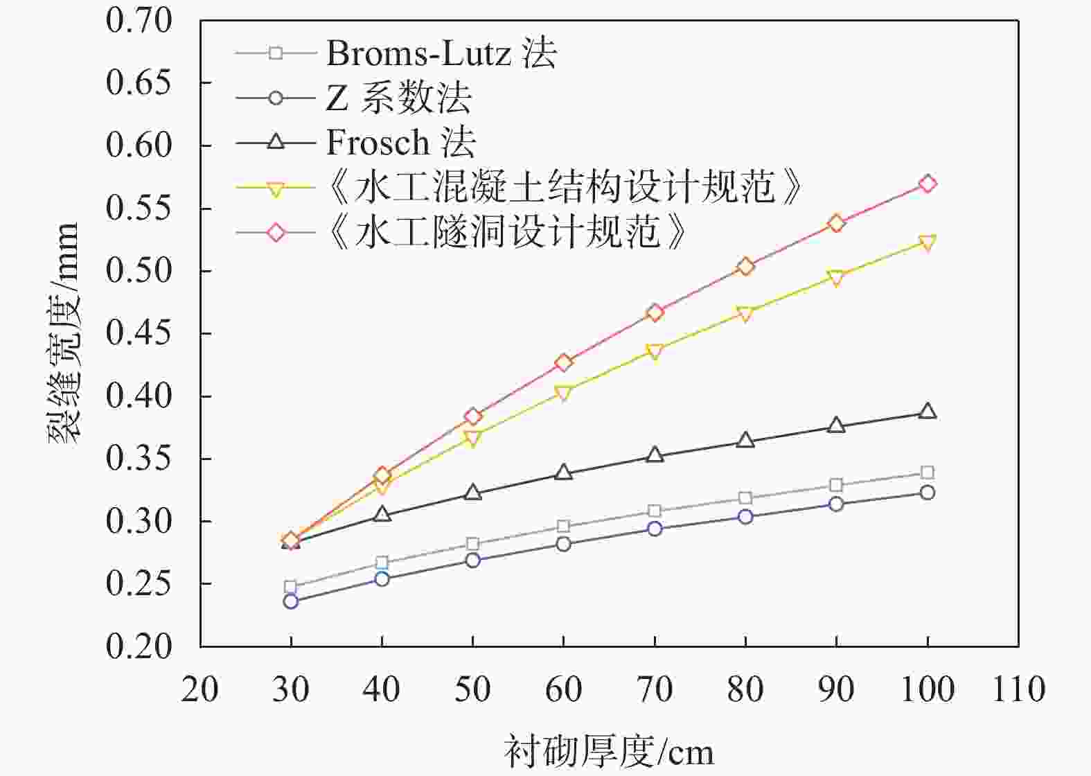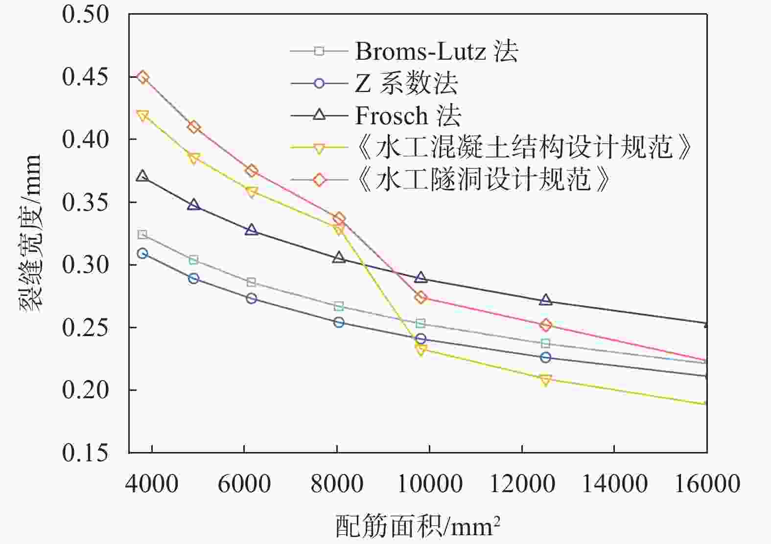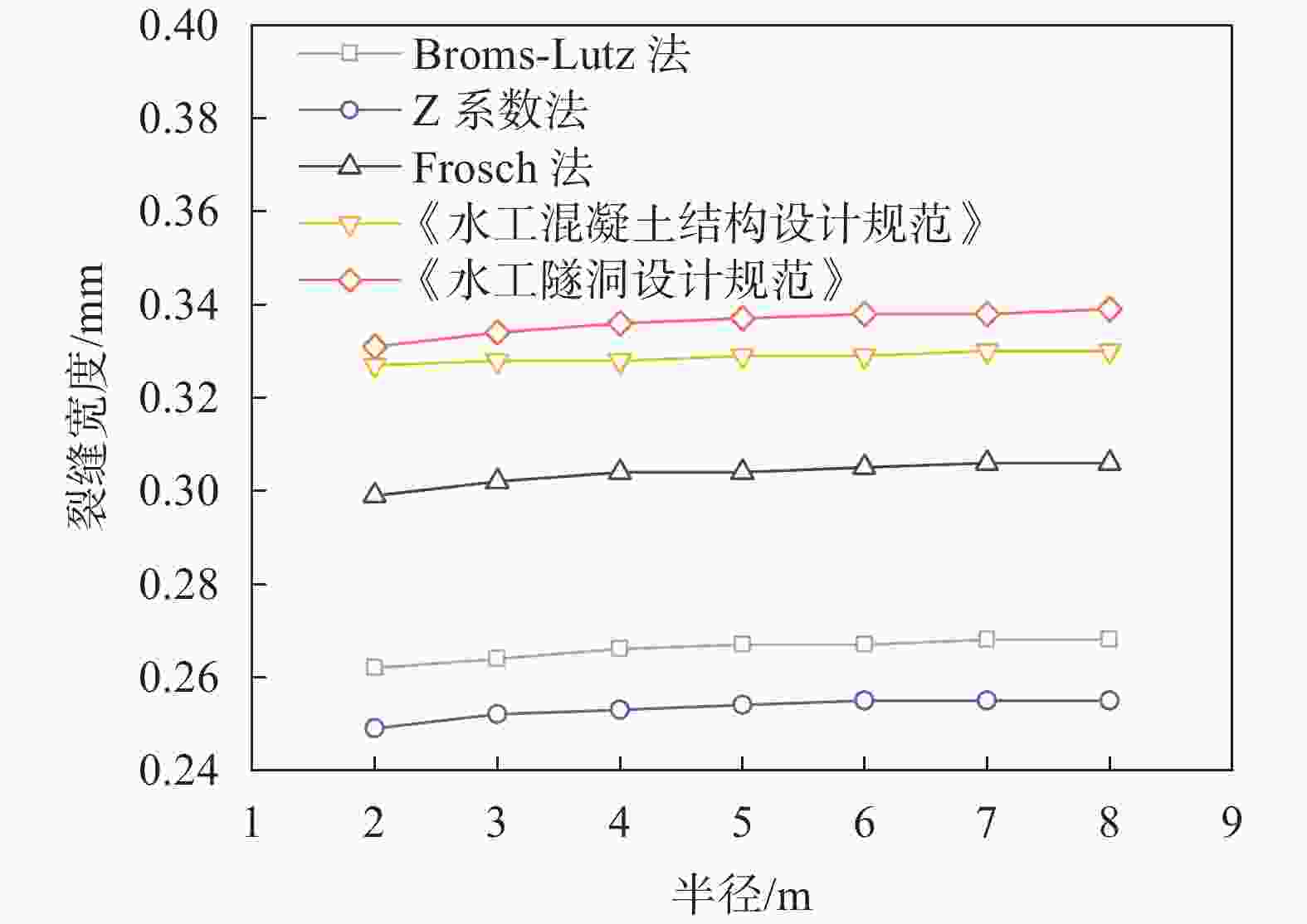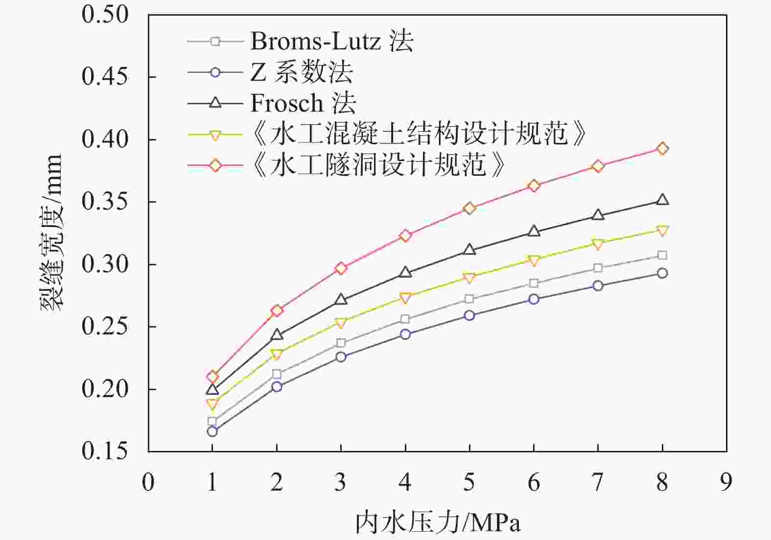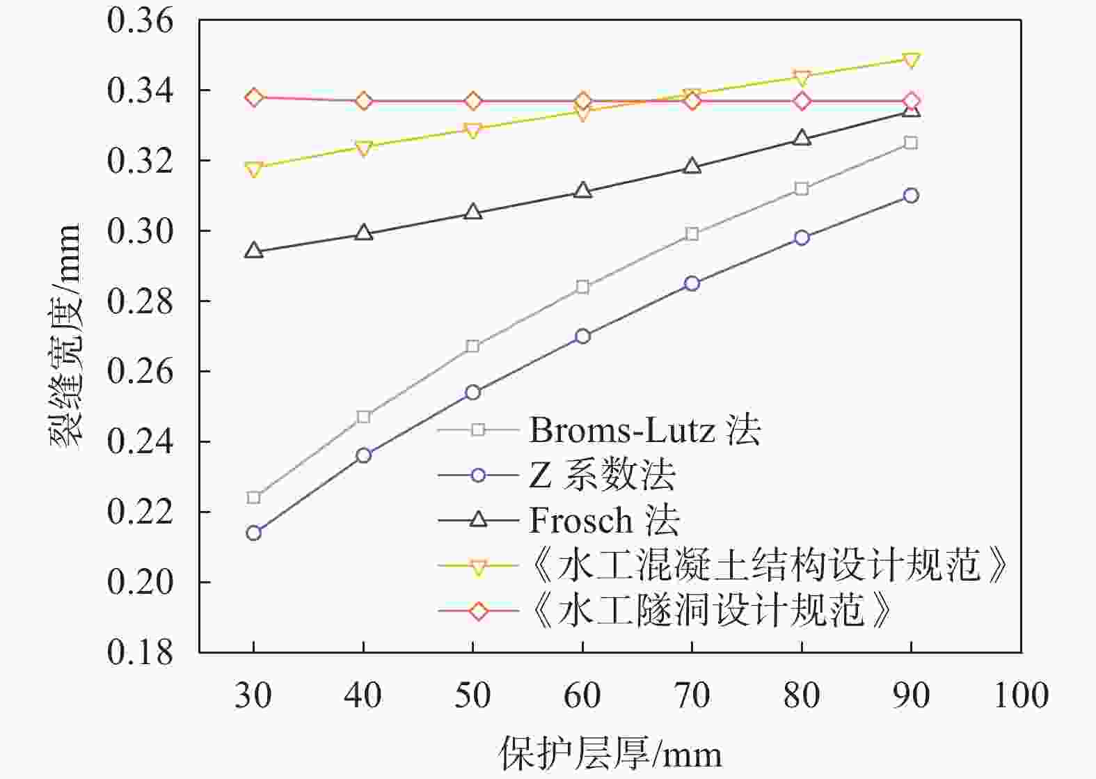 (SL 279—016)[15]$ w_{\mathrm{max}}=2\left(\dfrac{\sigma_{\mathrm{s}}}{E_{\mathrm{s}}}\phi-0.7\times10^{-4}\right)l_{\mathrm{f}} $ Z系数法[17] $ w_{\mathrm{max}}=1.1\beta f_{\mathrm{s}}\sqrt[3]{d\mathrm{_c}A}\times10^{-5} $ Frosch法[19] $ w\mathrm{_{\rm{max}}}=2\dfrac{f\mathrm{_s}}{E_{\mathrm{s}}}\beta\sqrt[]{d_{\mathrm{c}}^2+\left(\dfrac{s}{2}\right)^2} $ Broms-Lutz法[20] $ w\mathrm{_{\rm{max}}}=1.45\sigma_{\mathrm{s}}\sqrt[3]{d\mathrm{_c}A}\times10^{-5} $ 注:《水工混凝土结构设计规范》(SL 191—2008)中,$ \alpha $为考虑构件受力特征和荷载长期作用的综合影响系数,本文按轴心受拉计算,取$ \alpha $=2.4;$ \sigma\mathrm{_{sk}} $为纵向受拉钢筋的应力,MPa;$ E_{\mathrm{s}} $为钢筋的杨氏模量,$ \mathrm{M}\mathrm{P}\mathrm{a} $;$ c $为保护层厚度,mm;$ d $为钢筋的直径,mm;$ \rho\mathrm{_{te}} $为钢筋的配筋率。《水工隧洞设计规范》(SL279—2016)中,$ \sigma\mathrm{_s} $为纵向受拉钢筋的应力,MPa;$ E\mathrm{_s} $为钢筋的杨氏模量,MPa;$ \phi $为裂缝间纵向受拉钢筋应变不均匀系数,当$ \phi $<0.3时,取0.3;$ l\mathrm{_f} $为平均裂缝间距,m;Z系数法中,$ \beta $为钢筋到界面受拉边缘的应变梯度的影响,在本文中,近似取1.2;$ f\mathrm{_s} $为受拉钢筋应力,MPa;$ d\mathrm{_c} $从受拉区底面至最靠近该面的受拉钢筋界面形心的距离,mm;$ A $为包围一根钢筋的混凝土截面面积。Frosch法中,$ f\mathrm{_s},\beta,d_{\mathrm{c}},E\mathrm{_s} $均与上述相同,$ s $为钢筋的间距,mm;Broms-Lutz法中,参数含义均与上述相同。 表 3 计算参数