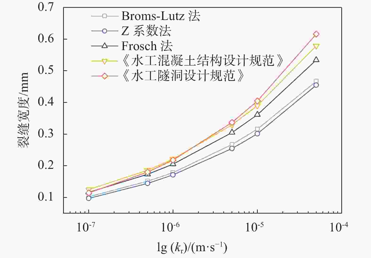 (SL 191—2008)[14]$ w\mathrm{_{\rm{max}}}=\alpha\dfrac{\sigma_{\mathrm{sk}}}{E_{\mathrm{s}}}\left(0.03+c+0.07\dfrac{d}{\rho_{\mathrm{te}}}\right) $ 《水工隧洞设计规范》