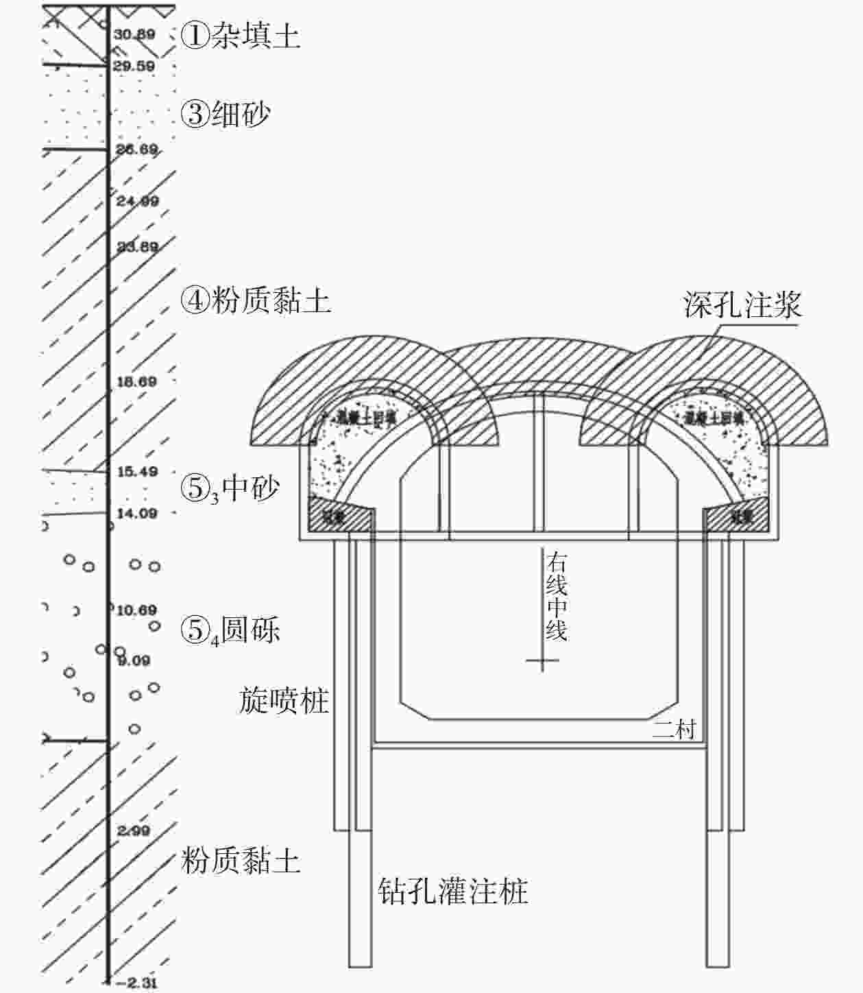 Song Haishan, Li Zhuyan, Ding Chunfu, Li Liyun. Mechanics and deformation characteristics of bored pile and rotary jet grouting pile composite structure for tunnel in water-rich stratum[J]. GEOTECHNICAL ENGINEERING TECHNIQUE, 2025, 39(5): 699-708. doi: 10.20265/j.cnki.issn.1007-2993.2024-0336