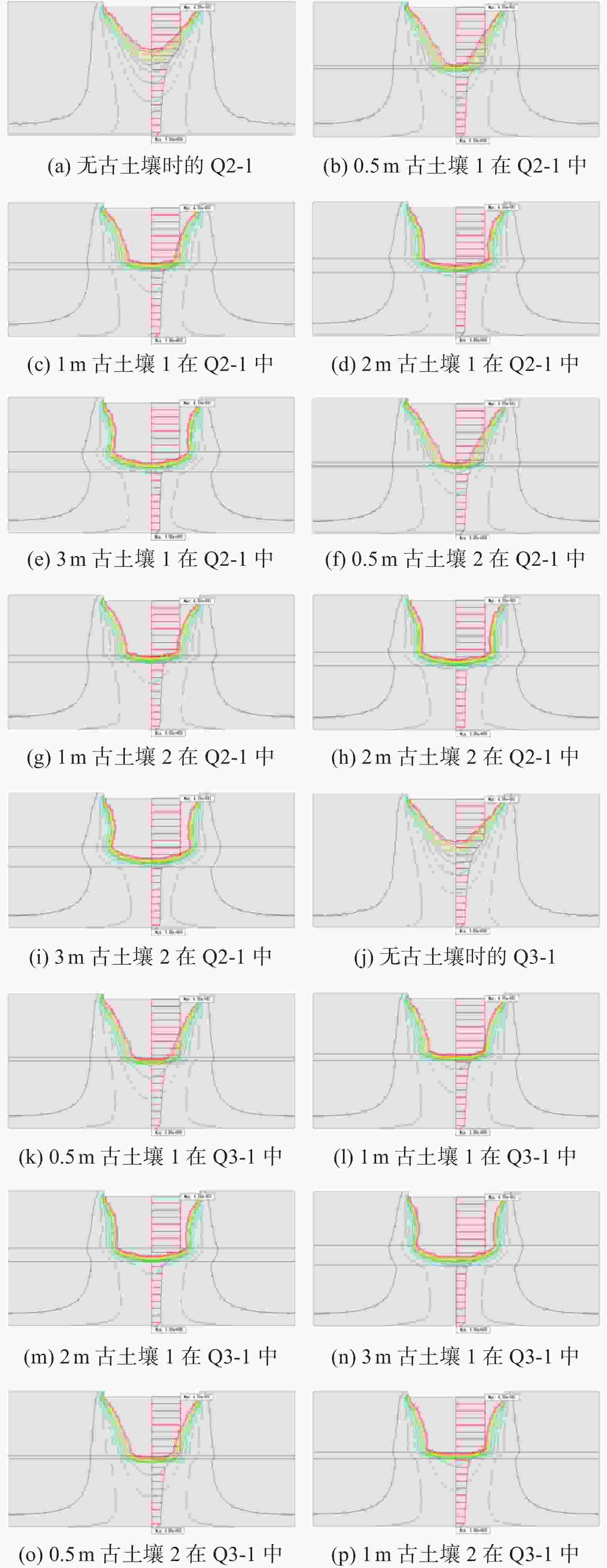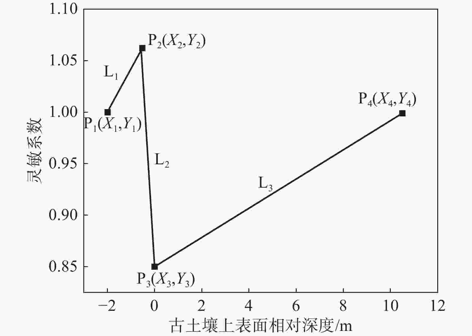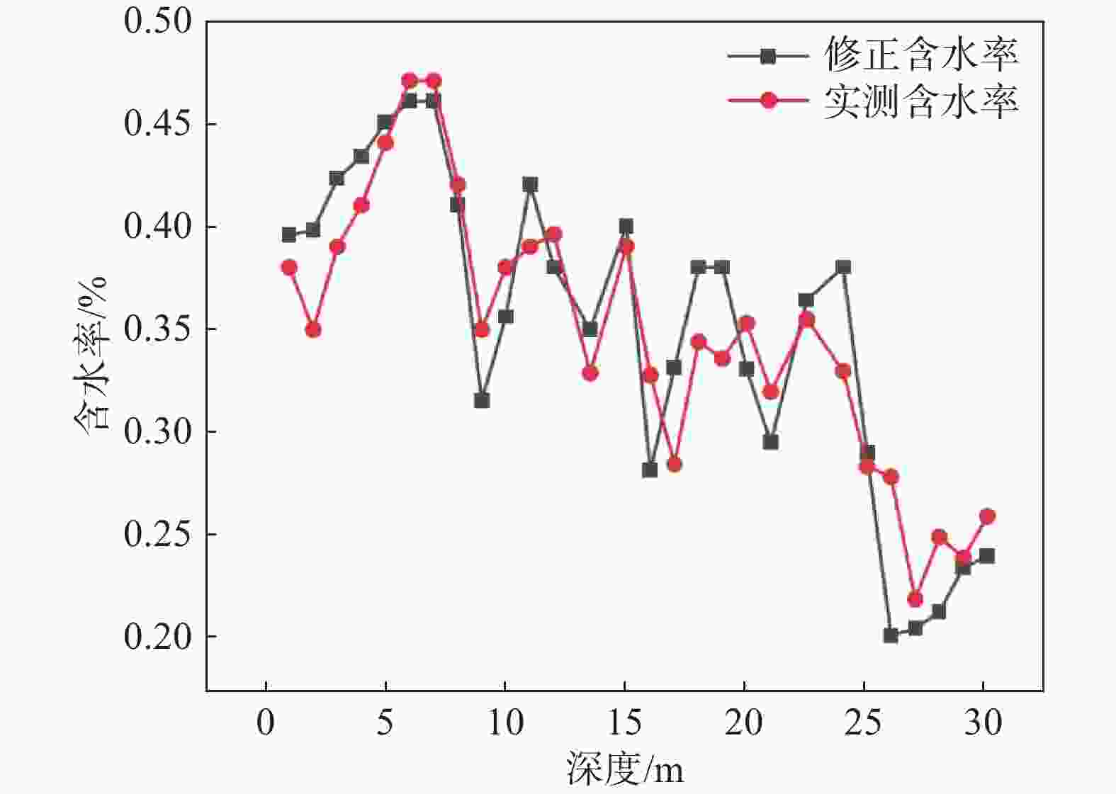 深度/m 土层类型 基础含水率/% 含水率修正 古1层 古2层 古3层 … 1 Q3黄土 ws 2 ws 3 ws St(1, −1) 4 古土壤 ws St(2, 0) 5 Q3黄土 ws St(3, 1) 6 ws St(3, 2) 7 ws St(3, 2) St(1, −1) 8 古土壤 ws St(3, 2) St(2, 0) 9 Q3黄土 ws St(3, 2) St(3, 1) 10 ws St(3, 2) St(3, 2) 11 ws St(3, 2) St(3, 2) St(1, −2) 12 ws St(3, 2) St(3, 2) St(1, −1) 13 古土壤 ws St(3, 2) St(3, 2) St(2, 0) 14 Q2黄土 ws St(3, 2) St(3, 2) St(3, 1) 15 ws St(3, 2) St(3, 2) St(3, 2) … 注:将每行各数相乘得到每米深度内的修正含水率。ws为饱和含水率,表达式为e0/(1+e0 );St(i,j)为该层土的灵敏系数;i为使用单层古土壤修正模型中的第i段表达式;j为古土壤上表面相对深度, m。 表 5 铜川某园区地层含水率修正结果