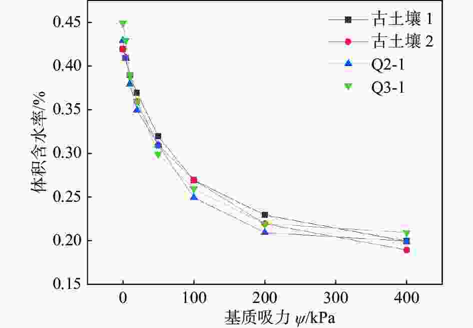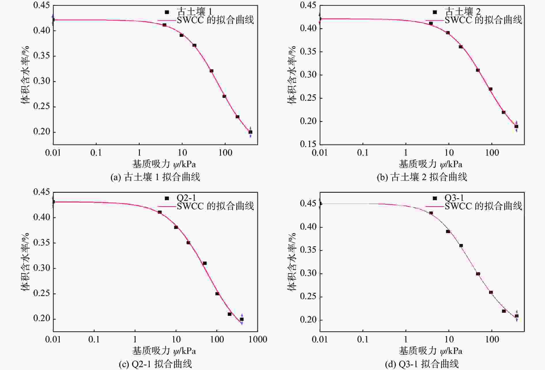 土样名称 取土深度/m 初始含水率w0/ % 土粒比重Gs 干密度ρd/(g·cm−3) 初始孔隙比e0 液限wL/ % 塑限 wp/ % 塑性指数 Ip Q2-1 11 18.9 2.71 1.37 0.95 28.8 19.2 9.6 Q3-1 5 17.2 2.71 1.28 1.133 28.4 19.4 9 古土壤1 8 18.5 2.71 1.43 0.788 27.6 17.2 10.4 古土壤2 11 10 2.7 1.56 0.734 27 19 8 表 2 VG模型中各参数拟合结果