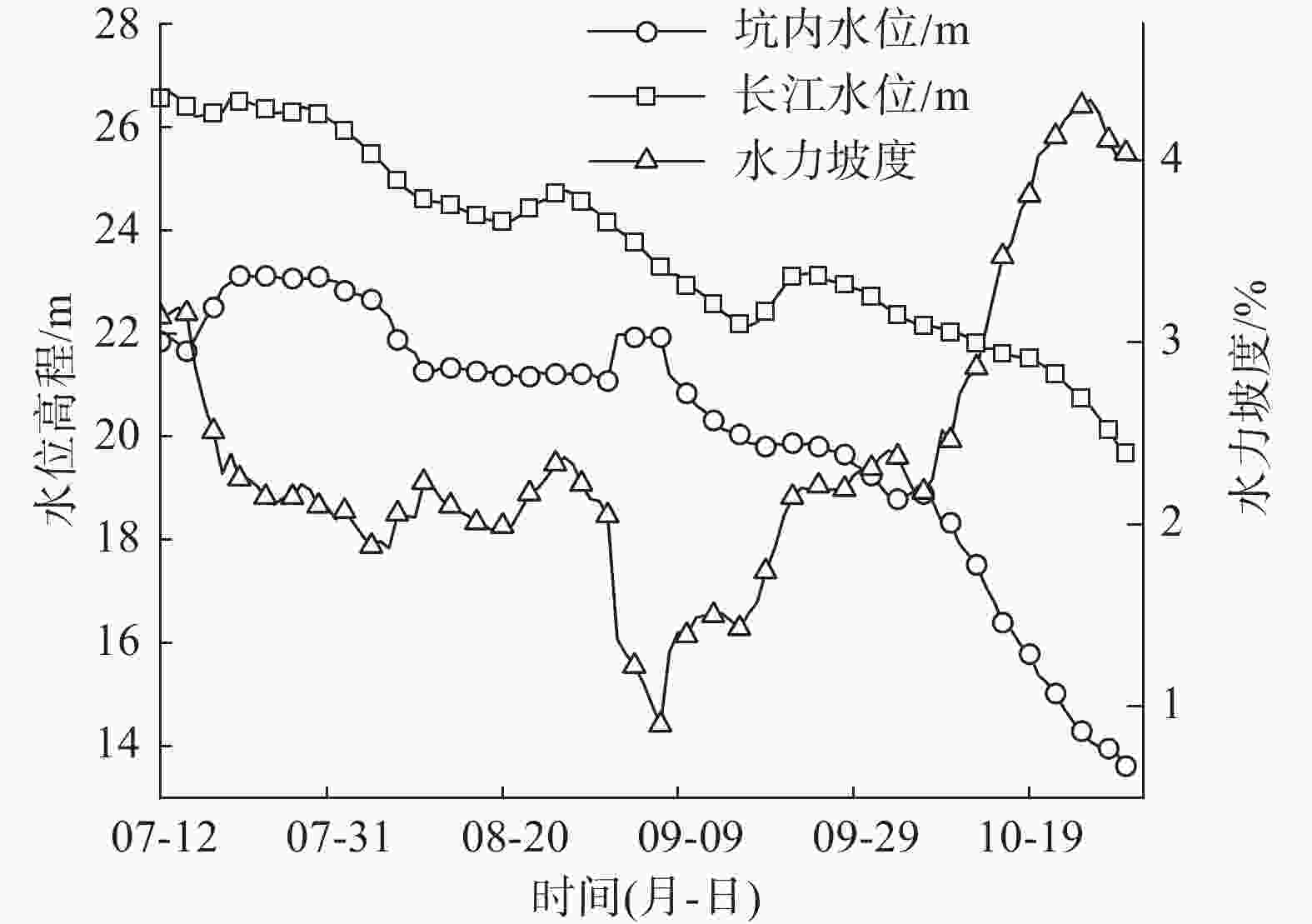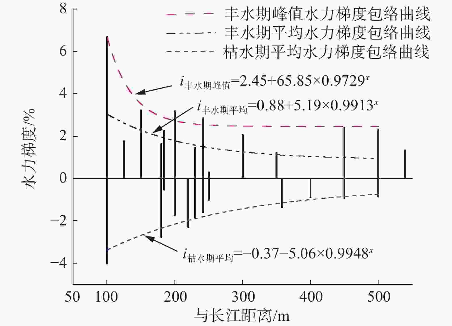 水力梯度/%100 6.67 3.04 −3.37 200 2.72 1.78 −2.15 300 2.47 1.26 −1.43 400 2.45 1.04 −1.00 500 2.45 0.95 −0.74 表 2 水力梯度实测值与计算值对比表 结果 丰水期峰值水力梯度/% 丰水期平均水力梯度/% 实测值 3.19 2.17 计算值 3.52 2.28 表 3 水力梯度实测值与计算值对比表 结果 丰水期峰值